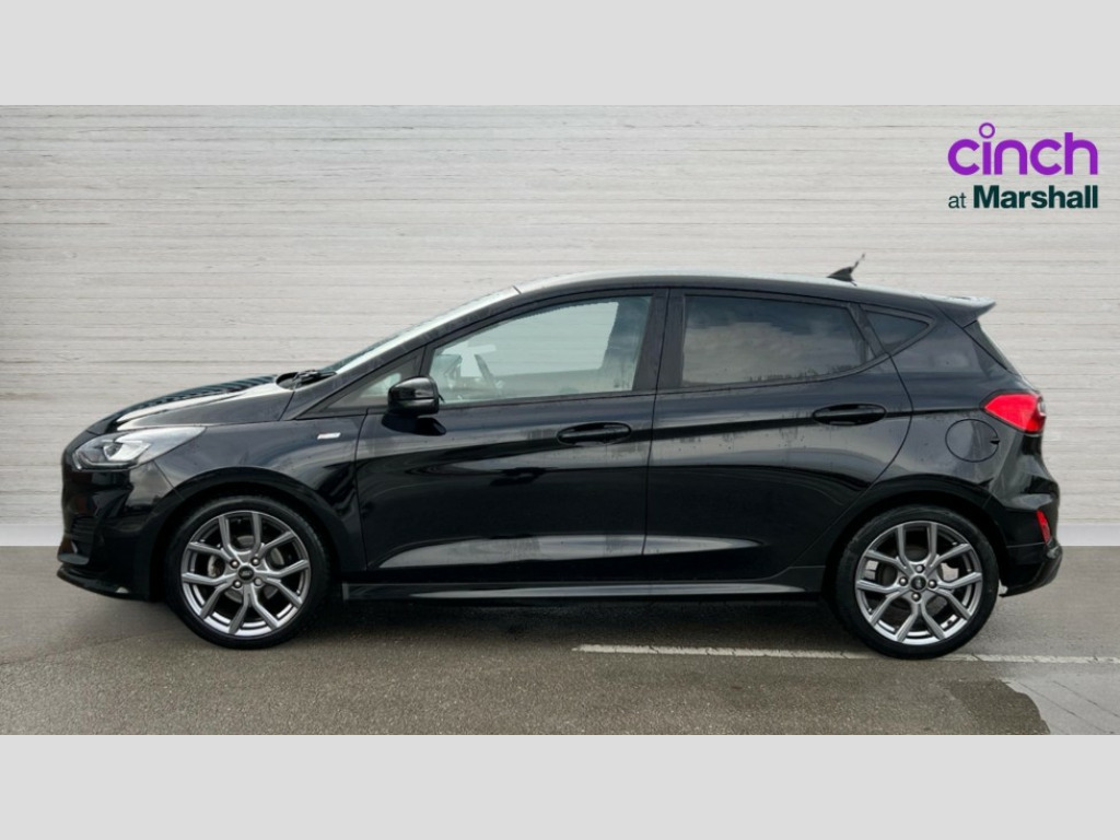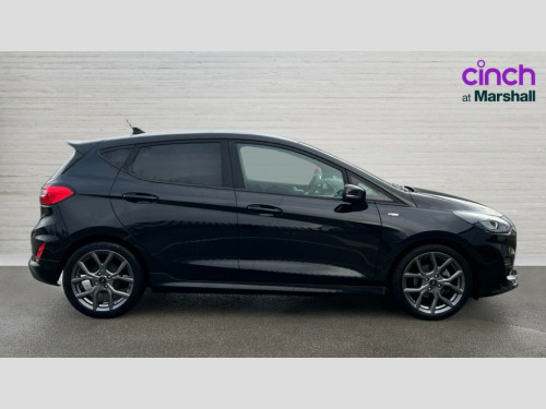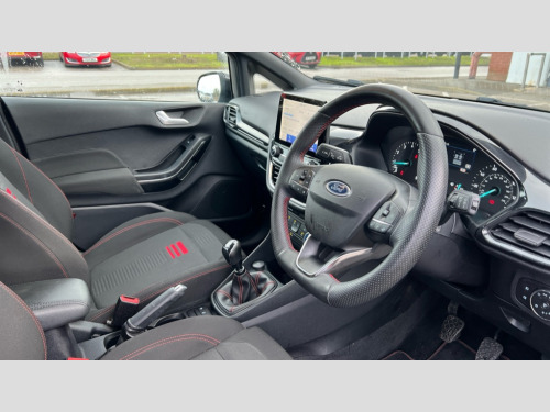 Ford Fiesta 1.0 EcoBoost Hybrid mHEV 125 ST-Line 5dr 4.2" Colour TFT Ice blue illumination analogue cluster, Driver alert system, Electric power steering, Ford easy fuel, Lane keep assist, Lane keeping aid, Rear parking distance sensors, Selectable drive modes (Normal, Sport, Track), Trip computer, Sports suspension, 3rd brake light, Auto high beam, Automatic headlights, Body colour bumpers, Body colour large rear spoiler, Body coloured electrically operated with side indicators, Electric front windows/one touch facility, Electric rear windows, Quickclear heated windscreen, Rain sensing wipers and auto dimming rear view mirror, Rear privacy glass, Rear side wing doors, Rear wiper, Unique ST-Line grille, full bodystyling kit and large body coloured rear spoiler, 3 rear headrests, 3 seat bench in 2nd row, Adjustable head restraints, Black headlining, Centre console with opening armrest, 2x cupholders, 12v and USB, Cloth upholstery with red stitching, Leather gear knob, Manual 2 way passenger seat adjust, Manual 4-way driver seat adjust, Manual air conditioning, Premium floor mats, Sensico wrapped steering wheel, Single front passenger seat, 3 point seatbelts on all rear seats, Electronic stability control with hill start assist, Front and rear seat belt warning, Manual child lock in rear doors, Tyre pressure monitoring system, Keyless start with 'Ford Power' starter button, MyKey system, Remote central locking, Thatcham alarm with power door dead locks, 17" 5x2 spoke alloy wheels with rock metallic finish