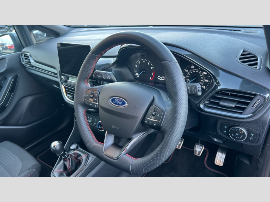 Ford Fiesta 1.0 EcoBoost ST-Line 5dr 4.2" Colour TFT Ice blue illumination analogue cluster, Driver alert system, Electric power steering, Ford easy fuel, Lane keep assist, Lane keeping aid, Rear parking distance sensors, Selectable drive modes (Normal, Sport, Track), Trip computer, Sports suspension, 3rd brake light, Auto high beam, Automatic headlights, Body colour bumpers, Body colour large rear spoiler, Body coloured electrically operated with side indicators, Electric front windows/one touch facility, Electric rear windows, Quickclear heated windscreen, Rain sensing wipers and auto dimming rear view mirror, Rear privacy glass, Rear side wing doors, Rear wiper, Unique ST-Line grille, full bodystyling kit and large body coloured rear spoiler, 3 rear headrests, 3 seat bench in 2nd row, Adjustable head restraints, Black headlining, Centre console with opening armrest, 2x cupholders, 12v and USB, Cloth upholstery with red stitching, Leather gear knob, Manual 2 way passenger seat adjust, Manual 4-way driver seat adjust, Manual air conditioning, Premium floor mats, Sensico wrapped steering wheel, Single front passenger seat, 3 point seatbelts on all rear seats, Electronic stability control with hill start assist, Front and rear seat belt warning, Manual child lock in rear doors, Tyre pressure monitoring system, Keyless start with 'Ford Power' starter button, MyKey system, Remote central locking, Thatcham alarm with power door dead locks, 17" 5x2 spoke alloy wheels with rock metallic finish