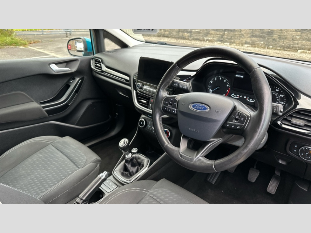 Ford Fiesta 1.0 EcoBoost Zetec 3dr Bluetooth system, Electric power steering, Lane keep assist, Speed limiter, SYNC Emergency Assistance, Trip computer, Auxiliary input socket, Ford SYNC 3 DAB radio, apple car play and android auto with voice control, Steering wheel mounted controls, USB connection, Automatic headlights, Body colour bumpers, Body colour door handles, Body colour electric adjustable heated door mirrors, Body colour rear spoiler, Chrome beltline trim, Cornering front fog lights, Electric front windows/one touch facility, LED daytime running lights, Quickclear heated windscreen, Rear wiper, Tinted glass, Upper front grille chrome surround, 12V Accessory socket in centre console, 3 spoke leather steering wheel, 60/40 split folding rear seat, Adjustable head restraints, Boot carpet, Chrome inner door handles, Cloth upholstery, Footwell illumination, Front map reading lights, Front seat and rear pockets, Height adjustable driver's seat, Illuminated glovebox, Leather gear knob, Leather trimmed handbrake handle, Load area light, Luxury woven headliner, Manual air conditioning, Overhead console with sunglasses holder, Pollen filter, Rake/reach adjustable steering wheel, Rear centre head restraint, 3 point seatbelts on all rear seats, ABS+EBA, Curtain airbags, Driver and passenger airbags, Drivers knee airbag, ESP + traction control, Front passenger airbag deactivation, Front side airbags, Hill start assist, Seatbelt warning, Tyre pressure monitoring system, Immobiliser, MyKey system, Remote central locking, Thatcham Cat.1 alarm