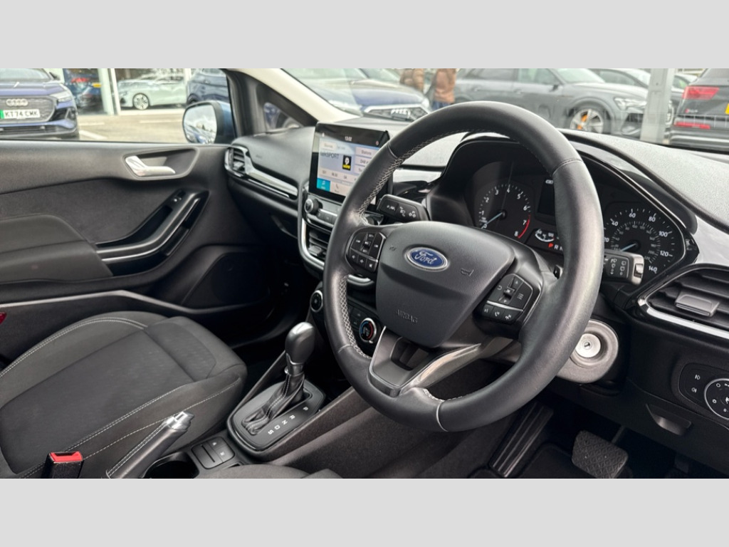 Ford Fiesta 1.0 EcoBoost Zetec 5dr Auto Bluetooth system, Electric power steering, Ford easy fuel, Trip computer, Auxiliary input socket, Steering wheel mounted controls, USB connection, Automatic headlights, Body colour bumpers, Body colour door handles, Body colour electric adjustable heated door mirrors with integral indicators, Body colour rear spoiler, Chrome beltline trim, Cornering front fog lights, Electric front windows/one touch facility, Halogen projector style headlights with static cornering lights + LED daytime running lights, Quickclear heated windscreen, Rear wiper, Tinted glass, Upper front grille chrome surround, 12V Accessory socket in centre console, 3 spoke leather trimmed steering wheel with audio control, 60/40 split folding rear seat, Adjustable head restraints, Boot carpet, Chrome inner door handles, Cloth upholstery, Footwell illumination, Front map reading lights, Front seat and rear pockets, Height adjustable driver's seat, Illuminated glovebox, Leather gear knob, Leather trimmed handbrake handle, Load area light, Luxury woven headliner, Manual air conditioning, Overhead console with sunglasses holder, Pollen filter, Rake/reach adjustable steering wheel, Rear centre head restraint, NCAP Pack - Fiesta, 3 point seatbelts on all rear seats, ABS+EBA, Curtain airbags, Driver and passenger airbags, Drivers knee airbag, Electronic stability control with hill start assist, Front passenger airbag deactivation, Front side airbags, Seatbelt warning, Tyre pressure monitoring system, MyKey system, Remote central locking & engine immobiliser, Thatcham Cat.1 alarm
