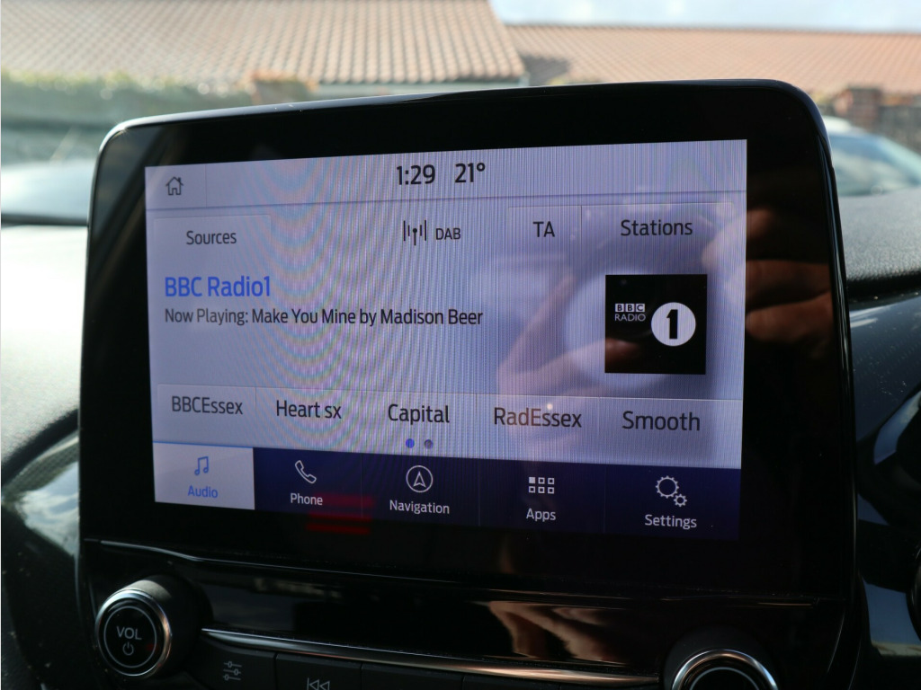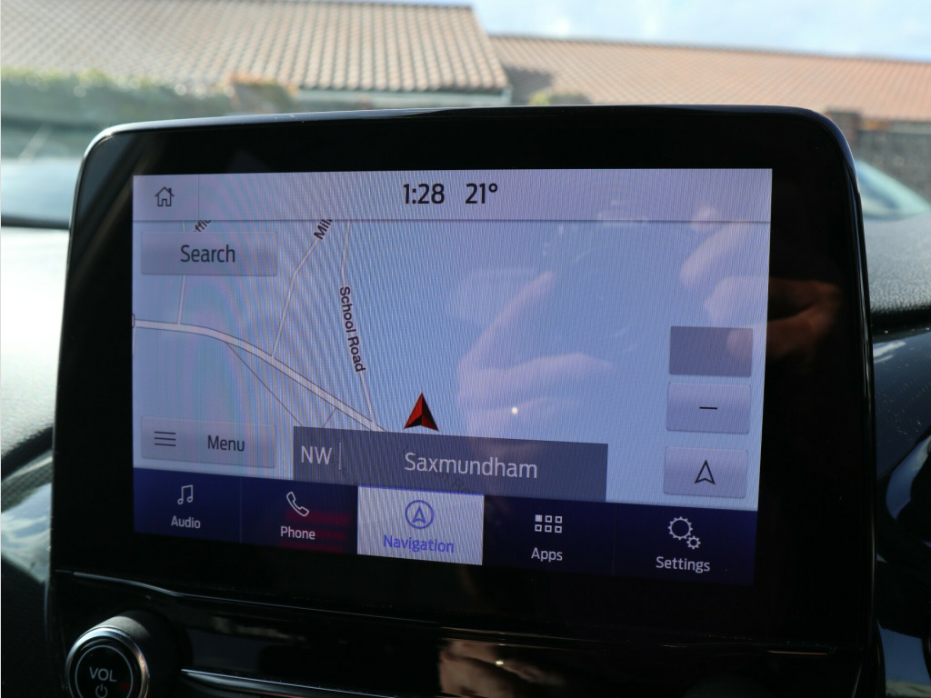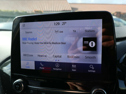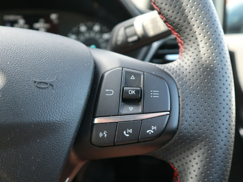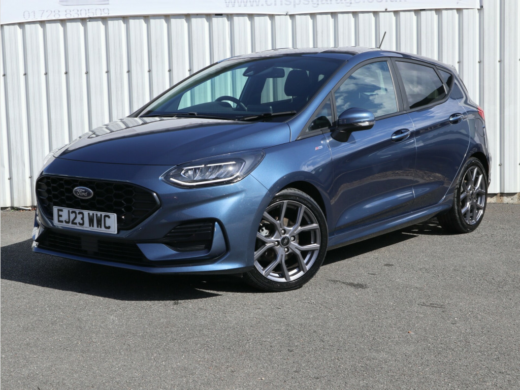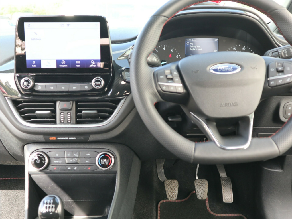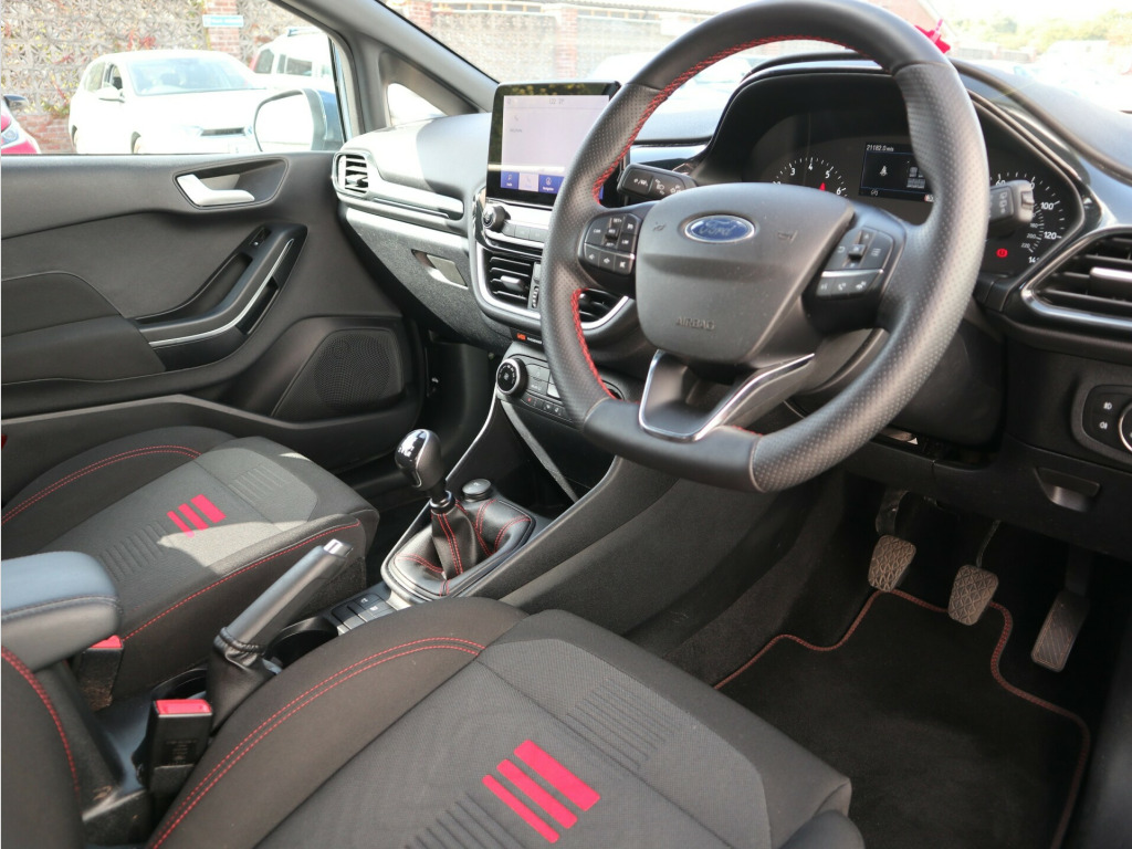 DUE IN SOON...One owner Fiesta ST-Line Hybrid finished in metallic blue with privacy glass, gun-metal grey alloy wheels, red stitching and detail in the seats. The superb spec on the ST line includes LED headlights, heated seats and steering wheel, auto headlights with auto high beam and rain sensing wipers. r conditioning, bluetooth connection, keyless go, rain-sensing wipers, satellite navigation, usb/ipod interface, cruise control, lane departure warning, multi-function steering wheel, rear parking sensor, traction control, traffic sign recognition, abs, child locks, isofix child seat anchor points, multiple airbags, tyre pressure monitor, locking wheel nuts, privacy glass, remote central locking, automated high-beam assist, electric mirrors, electric windows, heated door mirrors, windscreen heating, digital radio, heated seats, push button start, alloy wheels, auto lighting, led daytime running lights, led headlights, rear wash/wipe, ulez compliant euro 6, heated steering wheel