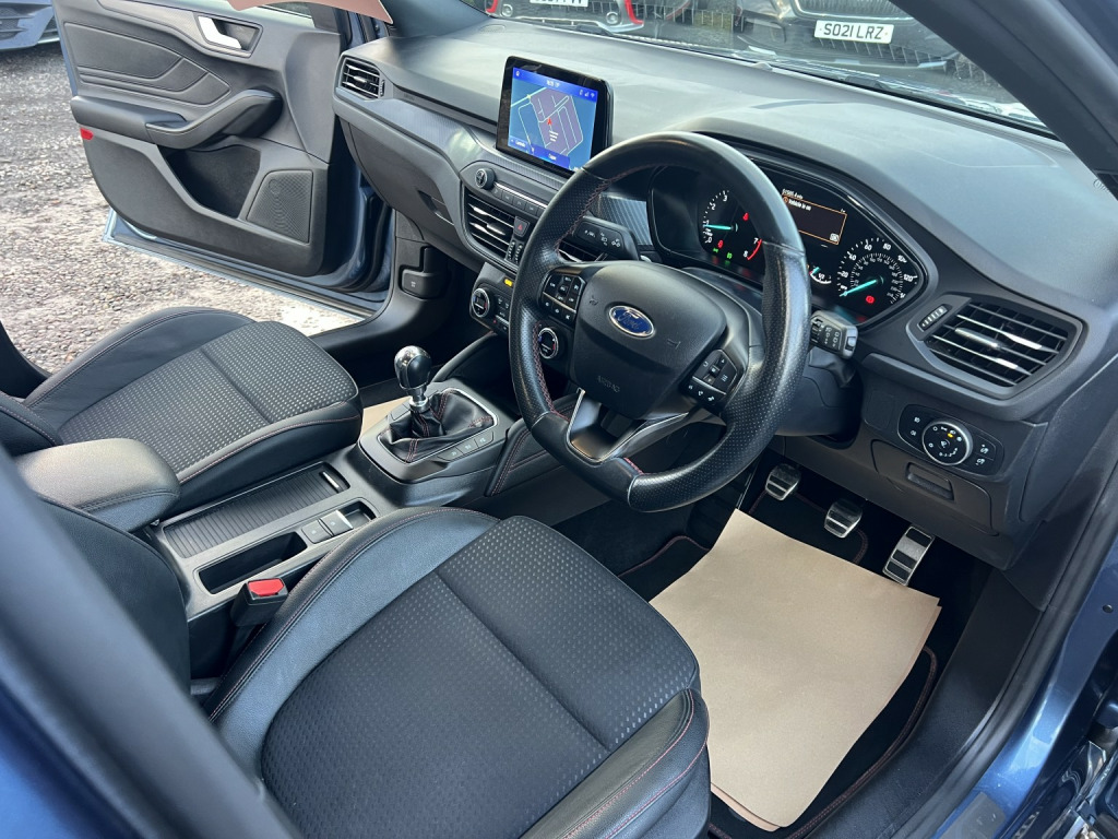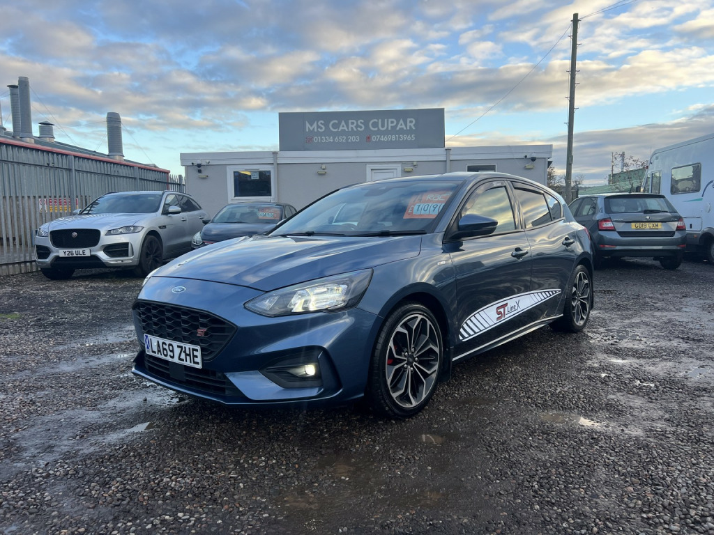 ????2020 69 FORD FOCUS ECOBOOST 125 ST-LINE X 5DR 51,000 MILES F/S/H/GREAT PRICE £10,995, GREAT EXAMPLE IN MATALIC BLUE WITH FULL SERVICE HISTORY/3rd brake light, Anti-lock Brake System (ABS)lane correction, Electronic Stability Program (ESP), One touch indicator,navigation system,Power assisted brakes, Tyre pressure monitor, Hands-free Bluetooth system, Telephone,APP CAR PLAY/ANDROID Autopilot function/Check control system, Configurable dashboard display, Cruise control, Service interval indicator, Steering wheel audio controls, Steering wheel with cruise control operation, Tool kit, Travel data recorder, Trip computer, Power Assisted Steering, Rev counter, Traction control, Auxiliary input socket, Digital radio, Radio/CD, USB input, Body coloured bumpers, Rear boot, Roof rails, Daytime running lights,half leather interior/Front fog lights, LED daytime running lights, Air conditioning, Front centre armrest, Front head restraints,reverse camera and front back SENSERS/Front interior 12V power outlet, Rear headrests, Steering wheel manually adjustable, Steering wheel rake adjustment,adaptive cruise control/Steering wheel reach adjustment, Leather gear selector trim,reverse sensors+Front sensors/Leather handbrake trim, Leather interior door trim, Leather steering wheel,3x3 point rear seat belts, Active front head restraints, Drivers airbag, Isofix child seat anchor points, Manual child proof locks, Passenger airbag, Height adjustable drivers seat, Lumbar support, Alarm, Central locking, Immobiliser, Remote central locking, Alloy wheels, Spare wheel, Front electric windows,Rear electric windows, Rear wiper/only 51,000 f/s/h/comes with 12 month mot and full engine service/6 months warranty/finance available,delivery can be arranged/buy with confidence,read our 5 star reviews,ms car sales Cupar ky154rd