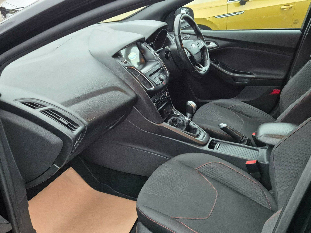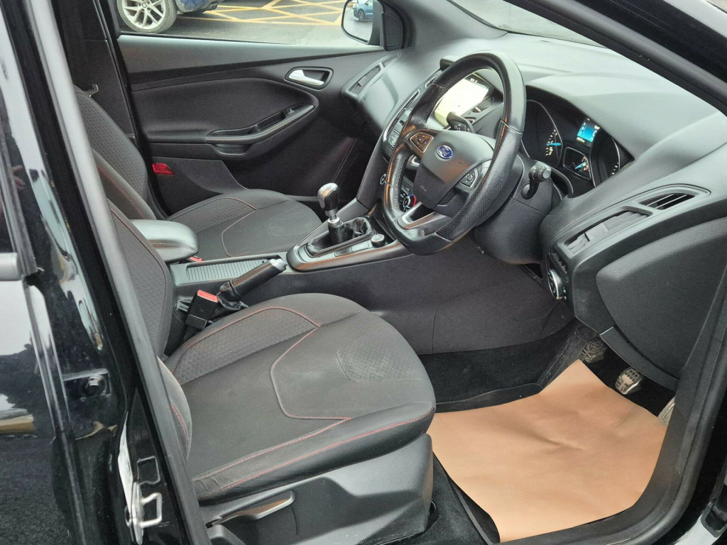This 2017 Ford Focus T ST-Line is presented with a clear vehicle history check, offering you peace of mind. This model features a 1.0 litre petrol engine and meets Euro 6 emissions standards. Inside, you'll find the 8 inch TFT touchscreen with Ford SYNC2, which includes Bluetooth connectivity for your convenience.This Focus ST-Line is designed to impress with its impressive fuel economy, achieving up to 60 miles per gallon, which is better than many similar vehicles. It also boasts a large boot space, offering ample room for your shopping or luggage, and its low CO2 emissions further highlight its efficiency and environmental consideration compared to other cars in its class. Previously serviced at 9496 in 2018, 21169 in 2019, 31701 in 2020, 37533 in 2021, 48070 in 2022, 59276 in 2023, 69935 in 2024, 81190 in 2024, 94640 in 2026 all at Ford dealership., in alloy wheels - 5-spoke with rock metallic finish, 8in tft touchscreen with ford sync2, airbags - driver and front passenger, airbags - front side impact, airbags - front and rear side curtain, alarm - thatcham category 1 with volume sensing and perimeter, anti-lock braking system - abs - with electronic brake-force distribution, black exterior trim detailing, body colour large rear spoiler and side skirts, body coloured front styling kit with centre aero foil, chrome finish on upper door line, colour tft instrument cluster display, courtesy light - front and rear passengers - overhead halogen and load compartment, drivers seat lumbar adjust, epas - electric power assisted steering, electric windows - front with one touch on drivers side, emergency brake warning, enhanced electronic stability control - esc with traction control - emergency brake assist - eba - hill start assist - hsa and trailer sway control, ford easy-fuel capless refuelling system, ford eco mode - driver information system, ford power starter button, ford radio-cd with 4.2 tft display, front floor mats, front fog lights, front grille - chrome, front seat - passengers manual fore-aft adjustment, gearshift knob - leather, halogen headlights with black surround, headlights - adaptive, headliner - black, hill start assist, ips - intelligent protection system, interior door lever - chrome finish, keyless start, led daytime running lights, leather-trimmed handbrake, locking wheel nuts, mykey, premium centre console - sliding armrest, quickclear heated windscreen, rear bumper with integral body coloured diffuser and honeycomb mesh in high-gloss black, rear seat - 60-40 split back and cushion, remote central locking, st line stainless steel scuff plates, seats - drivers manual height and fore-aft adjustment, seats - isofix mounting brackets for child seats, spare wheel - mini steel, sports style front seats - inidividual red stitching, sports style pedals - gear knob and steering wheel, steering column - rake and reach adjustment, steering wheel - leather-trimmed, suspension - sports, tvc - torque vectoring control, trip computer, tyre pressure monitoring system, upper and lower grille - high gloss black honeycomb design, wipers - standard with 6 speed interval settings, parking distance sensors - rear, appearance pack 2