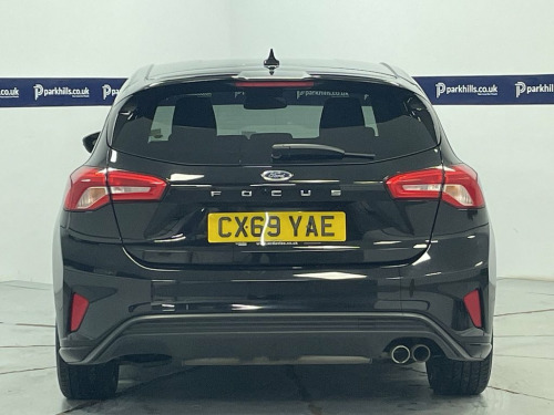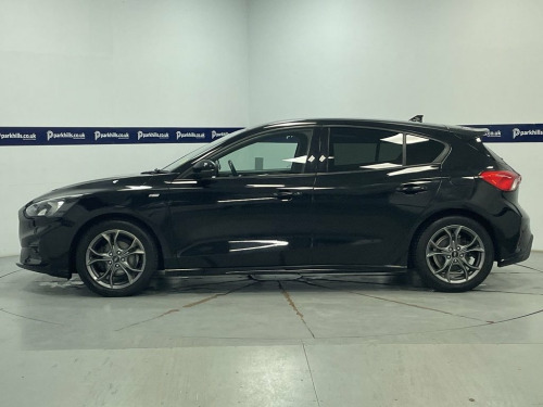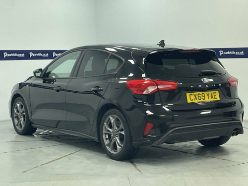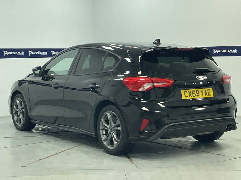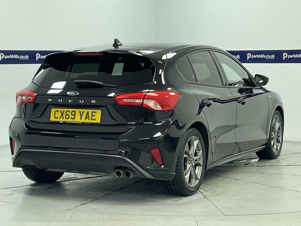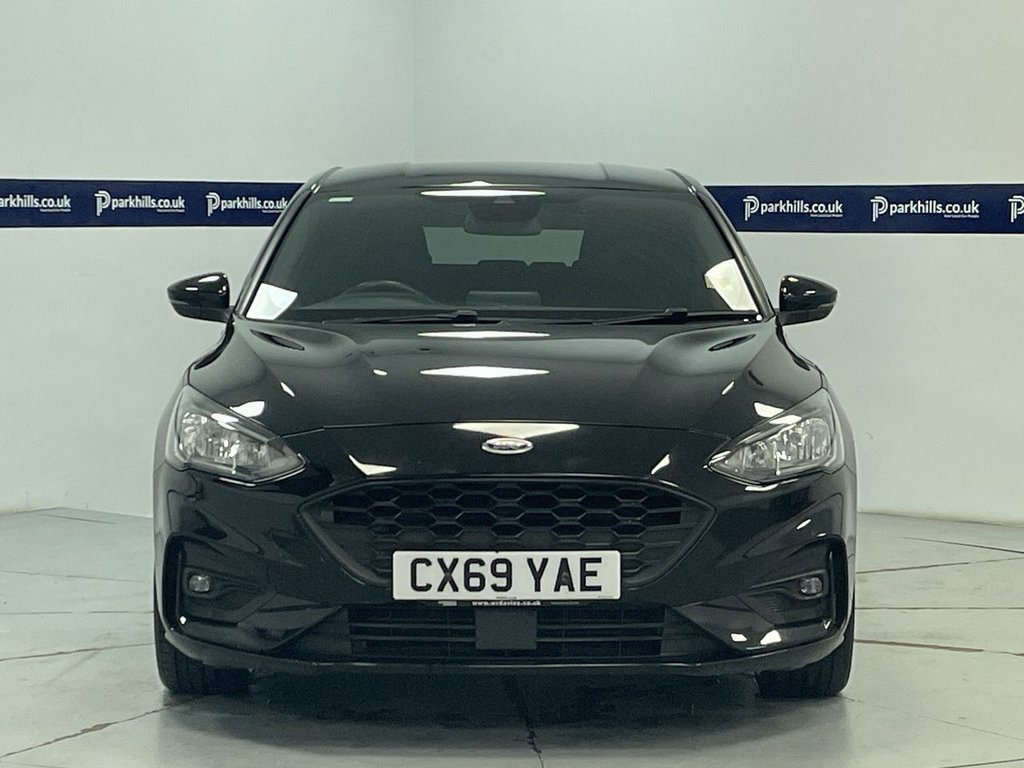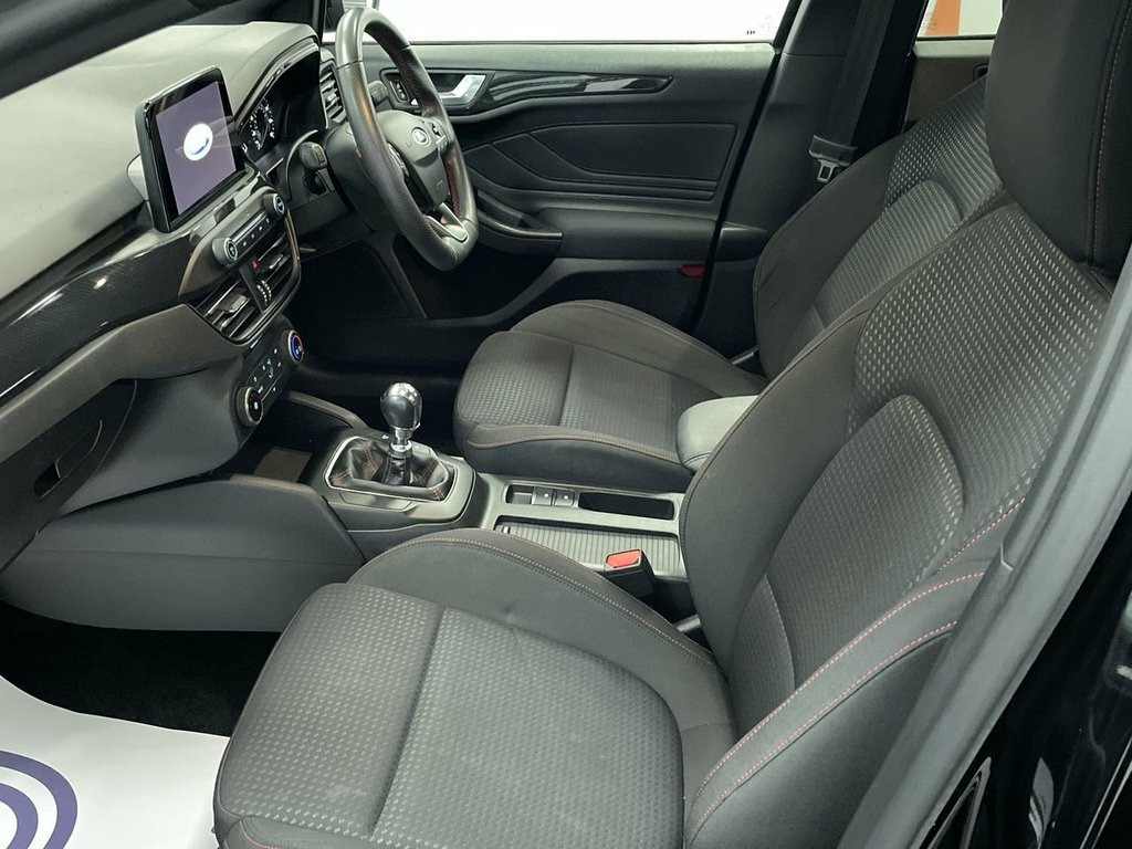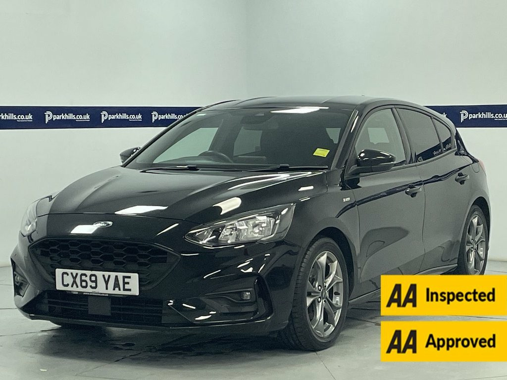 ST-LINE BODY STYLING, FORD TOUCHSCREEN INFOTAINMENT SYSTEM FEATURING HDD SAT NAV, DAB RADIO AND BLUETOOTH PHONE AND MEDIA ENABLING SEAMLESS MUSIC STREAMING, AIR CON, 17" ALLOYS, DAYTIME RUNNING LIGHTS, CRUISE CONTROL, FINANCE MONTHLY PAYMENTS AVAILABLE ON THIS CAR. Finished in Agate black metallic with black premium cloth interior this 2019 Ford Focus ST Line offers excellent peace of mind. The 1.0L petrol model, finished in the sporty ST Line trim, is a Euro 6 compliant vehicle. Inside, you'll find the Ford SYNC system featuring an 8 inch TFT touchscreen that seamlessly integrates with both Android Auto and Apple CarPlay, allowing for easy access to your favourite apps and navigation. The convenience of automatic on-off headlights ensures you always have optimal visibility, while FordPass Connect keeps you connected on the go. Experience a responsive drive with a 0-60mph acceleration time of just 10.0 seconds, demonstrating its lively performance. This Focus also boasts low CO2 emissions, making it a more environmentally conscious choice compared to many similar vehicles. Furthermore, the generous boot space provides ample room for all your luggage and shopping needs, highlighting its practicality for everyday use and longer journeys., heated screen, start-stop, electric windows and mirrors, remote central locking alarm and immobilizer, centre arm rest, isofix rear seats, Supplied with HPI report and vehicle book pack. THIS CAR IS AA APPROVED AND SOLD WITH A 145 P 17in Alloy Wheels - 5x2-Spoke - Rock Met, ABS - Anti-lock Braking System, Acoustic Laminated Windscreen, Agate Black, Airbags - Driver and Front Passenger, Airbags - Front and Rear Side Curtain, Airbags - Front Side Impact, Alarm - Thatcham Category 1 with Volume , Alloy Finish Pedals, Black Finish on Upper Door Line, Centre Console - Premium with Sliding Ar, Child Proof Rear Door Locks, Cruise Control with Speed Limiter, Dark Headliner, Door Handles - Body Colour, Door Mirrors - Heated - Electric - Integ, Electric Parking Brake, Emergency Assistance, ESC - Electronic Stability Control, Flat Bottomed Steering Wheel with Red St, Floor Mats - Front Velour, Fog Light Bezel - Unique ST-Line, For