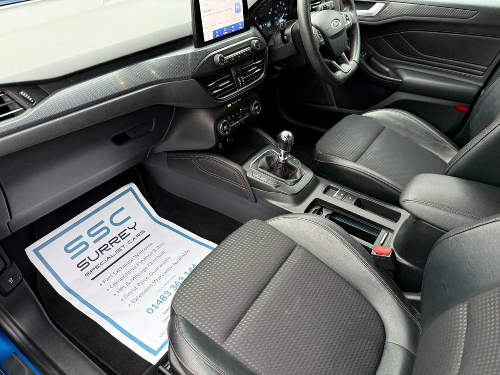Surrey Specialist Cars are proud to present our lovely Ford Focus ST Line X. This amazing car comes with Service History, finished in stunning metallic blue with grey contrast interior. The car has a MOT until January 2026 so it is ready to go. The 1L Petrol engine offers superb economy at over 58 MPG on combined cycle. Features Include Multifunction Steering Wheel, Trip Computer, Satellite Navigation, Parking Camera, Heated Seats, Upgraded Sound System, Stereo/Phone Control, FM/DAB Radio, CD Player, Bluetooth Audio, USB Input, AUX Input, Air Conditioning, Heated Rear and Front Screen, Start/ Stop System, 12V Charging Socket, Fog Lights, 6 Speed Manual Gearbox, 18 Inch Alloy Wheels and two Remote Control Keys to name a few. 18in Alloy Wheels - 5x2 Spoke - Matt Bla, Airbags - Driver and Front Passenger, Airbags - Front Side Impact, Airbags - Front and Rear Side Curtain, Alloy Finish Pedals, Automatic Dimming Rear View Mirror, Body Colour Bumpers, Cruise Control with Speed Limiter, DEATC - Dual-Zone Electronic Automatic T, Dark Headliner, Door Handles - Body Colour, Door Mirrors - Electrically-operated - H, ESC - Electronic Stability Control, Electric Parking Brake, Flat Bottomed Steering Wheel with Red St, Ford Easy Fuel System, Ford SYNC3 DAB Navigation System, FordPass Connect, Front Passenger Airbag Deactivation Swit, Front Seat - Drivers Manual Lumbar Suppo, Front Seats - Driver and Passenger Heate, Front an