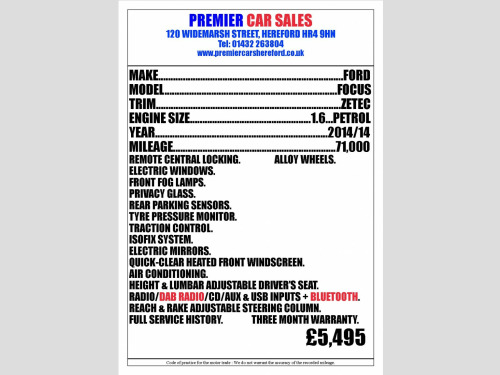 A great petrol Ford Focus with one previous keeper, extensive service history and a good set of features. Remote Central Locking with two keys present. Alloy Wheels. Privacy Glass. Rear Parking Sensors. ISOFIX. Radio/DAB Radio/CD/AUX & USB Inputs/Bluetooth Connection. Air Conditioning. Heated Quick Clear Windscreen. Electric Windows. Electric Mirrors. Height & Lumbar Adjustment to the drivers seat. Reach & Rake Adjustable Steering Column. Front Fog Lamps. Traction Control. Tyre Pressure Monitor. We are at 120 Widemarsh Street, Hereford, HR4 9HN. Our website with full details is : www.premiercarshereford.co.uk, All of our vehicles are supplied with a three month warranty and long MOT. Card payments are welcomed and part exchanges are gladly considered. Low rate finance arranged, subject to status. Please call us on 01432263804 or 07831564655 for more information.
