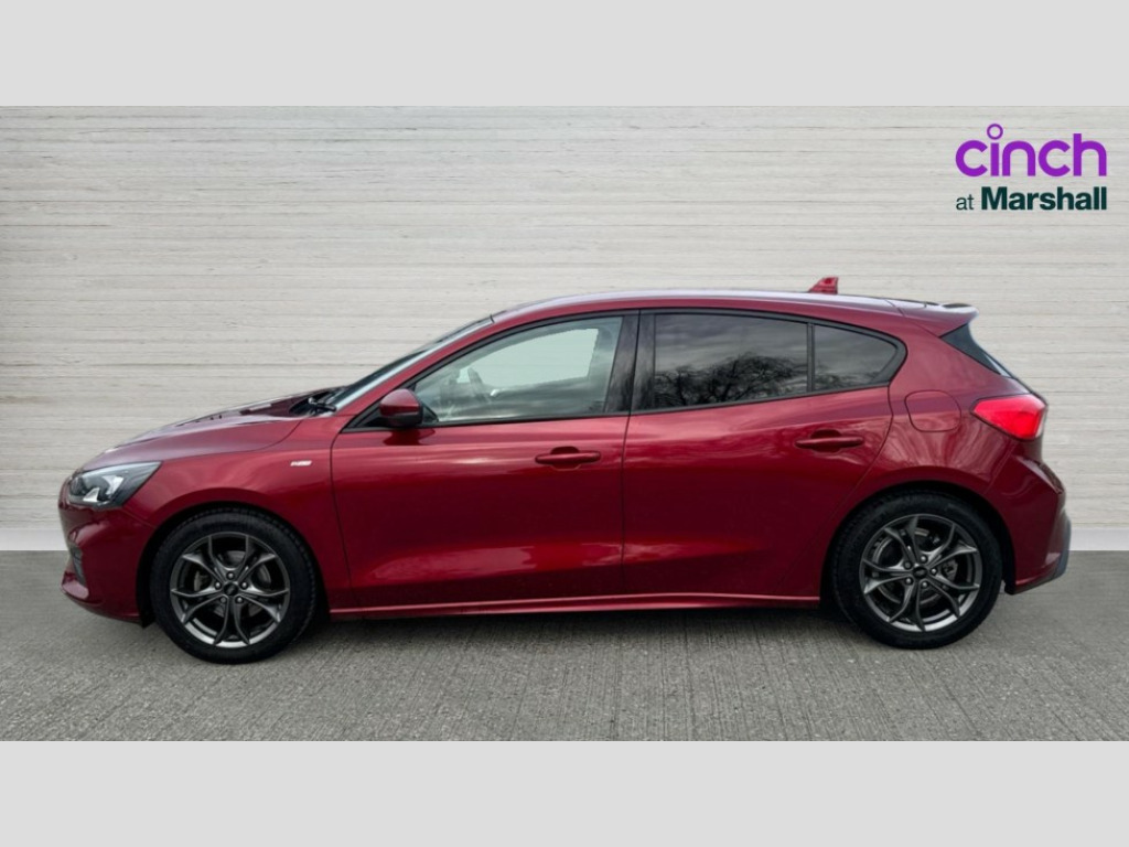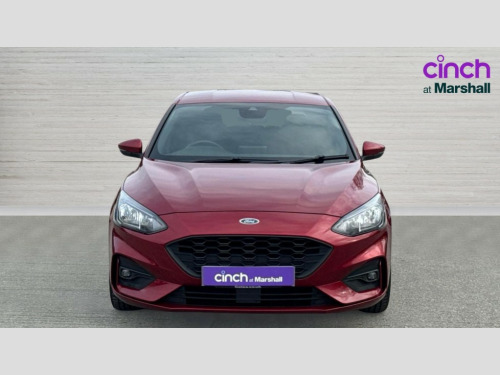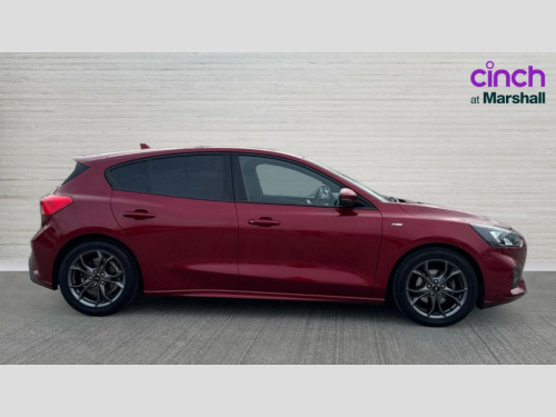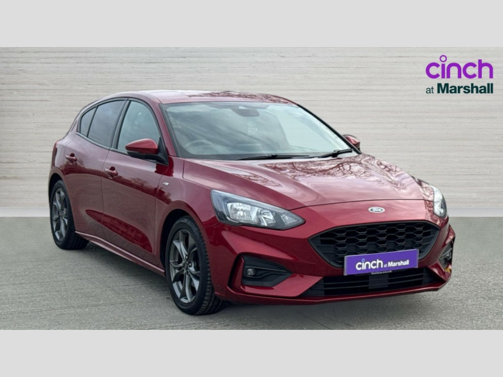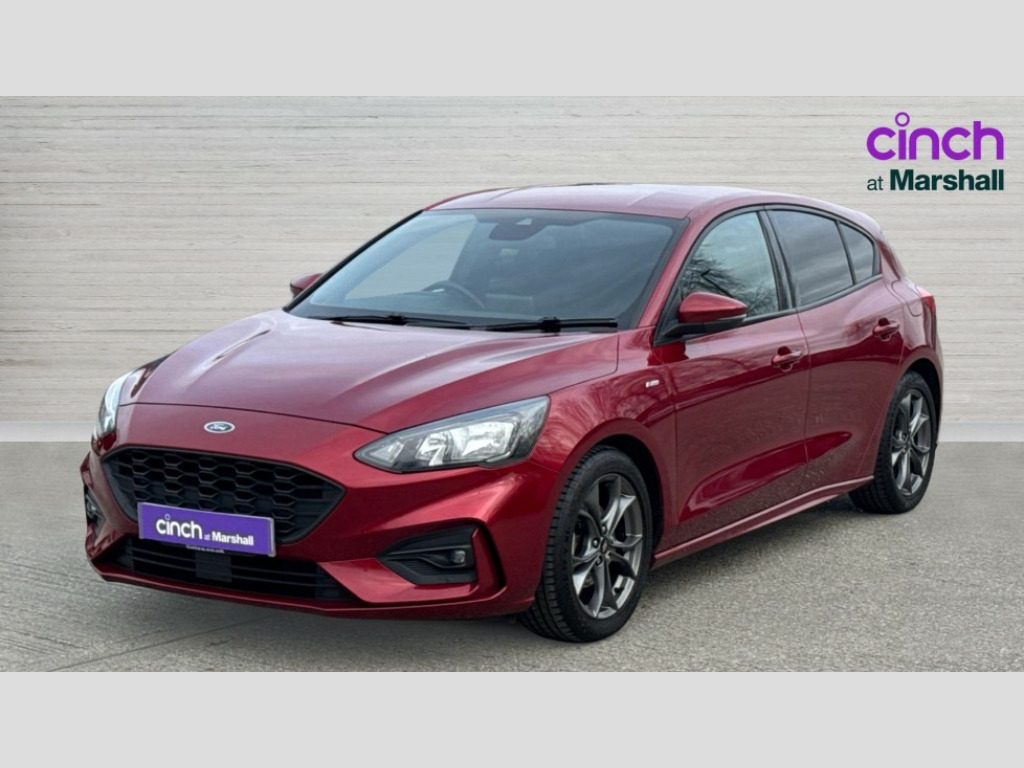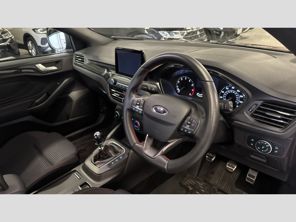 Ford Focus 1.0 EcoBoost 125 ST-Line 5dr Bluetooth system, Digital clock, Easy fuel capless refuelling system, Eco mode, Ford SYNC 3 with 6.5" TFT touchscreen, DAB radio and app link Android auto/Apple carplay, Lane keeping aid with lane departure warning, PAS, Selectable drive mode, Trip computer, Sports tuned suspension, 6 speakers, Aux input, 'Quickclear' heated windscreen/heated washer jets, Auto headlamps (on/off), Body colour large rear spoiler, Body colour side skirt, Body coloured bumpers, Body coloured door handles, Body coloured electrically operated and heated door mirrors with side indicators, Electrically operated front and rear windows with one touch opening and closing, Front variable intermittent wipers with electric wash, Halogen reflector headlamps, Heated rear window, LED daytime running lamp, LED front fog lamps with cornering function, Polished twin tailpipe, ST-Line upper and lower grille with full body styling kit and wing badges, Tailgate wash/wipe, 3 spoke flat bottomed leather steering wheel with red stitching, 60/40 split back and cushion rear seats with 2 height adjustable headrests, Alloy finish pedals, Aluminium gear knob, Centre console with armrest, Cloth upholstery with red stitching, Dark headliner, Driver's lumbar support, Front floor mats, Height adjustable front headrests, Isofix child seat preparation, Manual air conditioning, Reach + rake adjustable steering column, Rear centre headrest, Red stitching on steering wheel, ABS+Electronic Brake force Distribution, Auto hold function, Driver airbag, Electronic parking brake, Electronic stability control, Front and rear seatbelt reminder, Front inertia reel height adjustable seatbelts with pre-tensioners, Front passenger airbag, Front side airbags, Hill start assist, Passenger airbag deactivate switch, Post collision braking, Pre collision assist with autonomous emergency braking and pedestrian/cyclist detection, Side curtain airbags, Three rear inertia reel lap/diagonal seatbelts, Tyre pressure monitoring system, Keyless start with 'Ford Power' starter button, MyKey system, Remote central locking & engine immobiliser, Thatcham category 1 alarm, Contrast stitching - Red, 17" 5x2 spoke alloy wheels with rock metallic finish, Mini steel spare wheel