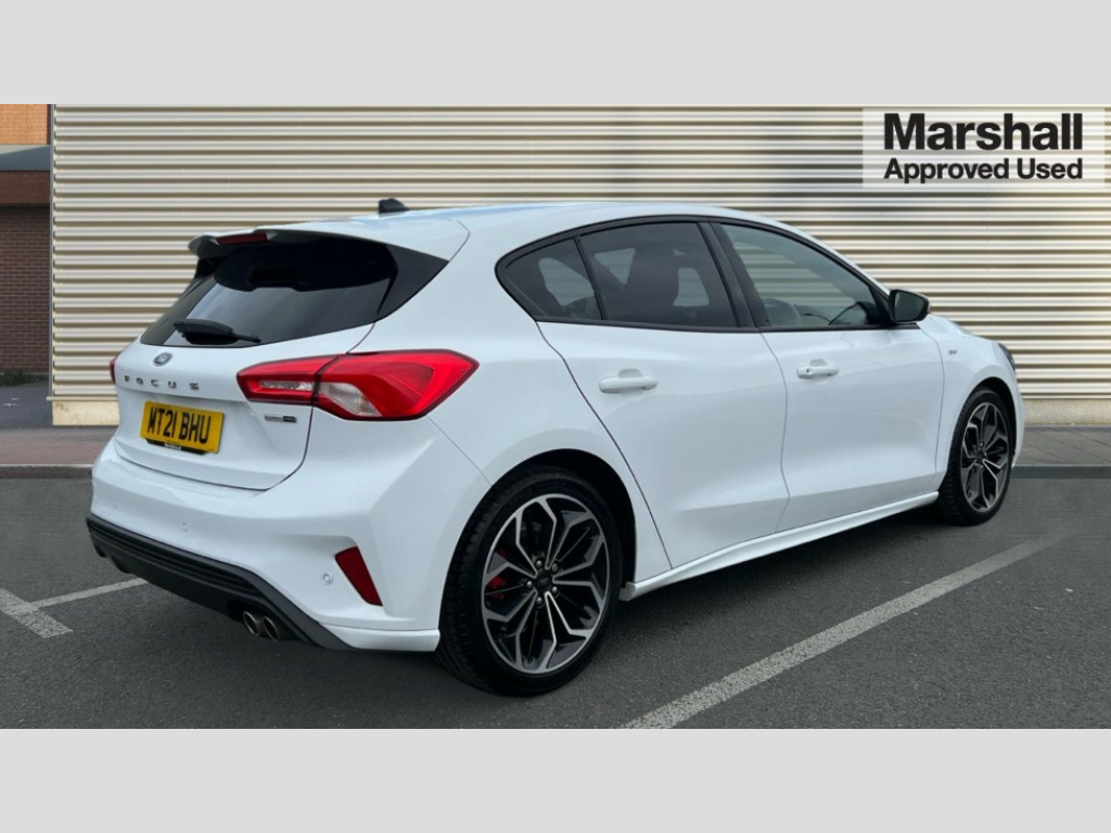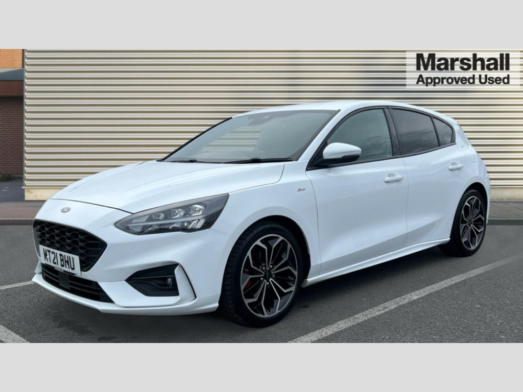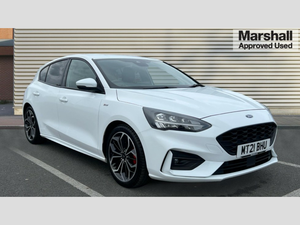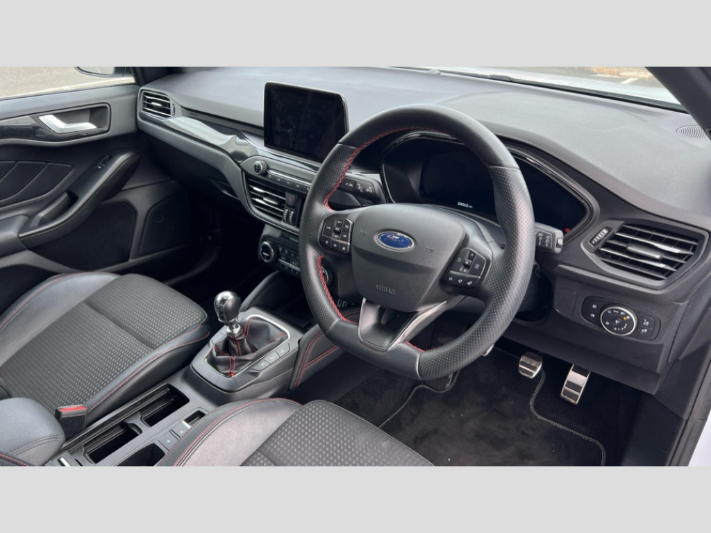 Ford Focus 1.0 EcoBoost Hybrid mHEV 125 ST-Line X Edition 5dr 12.3" Digital instrument cluster, Bluetooth system, Digital clock, Easy fuel capless refuelling system, Eco mode, Ford SYNC 3 navigation with 8" TFT touchscreen, DAB radio and app link Android auto/Apple carplay, Intelligent speed assist, Lane keeping system - lane keeping alert and lane keeping aid, PAS, Selectable drive mode, Trip computer, Sports tuned suspension, 2 USB ports, Aux input, Auto dimming rear view mirror, Auto headlamps (on/off), Automatic rain sensing wipers, Body colour large rear spoiler, Body coloured bumpers, Body coloured door handles, Body coloured electrically operated and heated door mirrors with side indicators, Electrically operated front and rear windows with one touch opening and closing, Front variable intermittent wipers with electric wash, Heated rear window, LED daytime running lamp, Polished twin tailpipe, Power folding door mirrors with puddle lights, Quickclear heated windscreen, Rear privacy glass, ST-Line upper and lower grille with full body styling kit and wing badges, Tailgate wash/wipe, Unique door and instrument panel inserts, 3 spoke flat bottomed Sensico steering wheel with red stitching, 6 way power adjustable driver seat, Aluminium gear knob, Dark headliner, Driver's lumbar support, Dual zone electronic air temperature control, Front and rear floor mats with red stitching, Heated driver and front passenger seats, Heating for Sensico steering wheel, Height adjustable front headrests, Isofix child seat preparation, Reach + rake adjustable steering column, Rear centre headrest, Sensico partial premium upholstery, Soft console knee pads with red stitching, 3x3 point rear seatbelts, ABS+Electronic Brake force Distribution, Auto hold function, Driver airbag, Electronic parking brake, Electronic stability control, Front and rear seatbelt reminder, Front inertia reel height adjustable seatbelts with pre-tensioners, Front passenger airbag, Front side airbags, Hill start assist, Passenger airbag deactivate switch, Post collision braking, Power child locks on rear doors, Pre collision assist with autonomous emergency braking and pedestrian/cyclist detection, Side curtain airbags, Three rear inertia reel lap/diagonal seatbelts, Tyre pressure monitoring system, Ford keyfree system with Keyless entry and keyless start/sleep mode key fob, MyKey system, Remote central locking & engine immobiliser, Thatcham category 1 alarm, 18" 5x2 spoke gloss black machined finish alloy wheels, Mini steel spare wheel