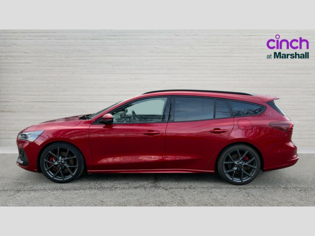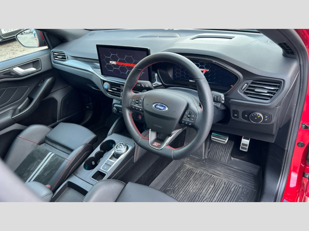 Ford Focus 2.3 EcoBoost ST 5dr Auto 12.3" Digital instrument cluster, Bluetooth system, Digital clock, Easy fuel capless refuelling system, Eco mode, Ford SYNC4 Nav with 13.2'' touchscreen, DAB, Emergency Assistance, Apple Carplay & Android Auto, B&O Premium Audio with 10 speakers, FordPass Connect, Lane keeping system - lane keeping alert and lane keeping aid, PAS, Rev counter, Selectable drive mode, Service interval indicator, Trip computer, Wireless charging pad, Unique ST sport suspension with limited slip differential, 2 USB ports, Auto headlamps (on/off), Auto high beam assist, Body coloured door handles, Dynamic matrix LED headlamps including Glare free lighting, Electrically operated front and rear windows with one touch opening and closing, Electrically operated heated power fold door mirrors with puddle lamp with side indicators, Front variable intermittent wipers with electric wash, Heated rear window, LED daytime running lamp, LED rear lamps, LED third brake light, Privacy glass, Quickclear heated windscreen, Rain sensor, Rear side wing doors, Tailgate wash/wipe, Unique ST upper & lower grille with full bodystyling kit, 3 rear headrests, 3 seat bench in 2nd row, Dual zone electronic air temperature control, Height adjustable front headrests, Isofix child seat preparation, Load through ski hatch, Partial sensico upholstery with ford performance seat, Power 6-way driver seat adjust, with power lumbar adjust, Power 6-way passenger seat adjust, with power lumbar adjust, Reach + rake adjustable steering column, Single front passenger seat, Winter pack - Focus, 3x3 point rear seatbelts, ABS+Electronic Brake force Distribution, Auto hold function, Driver airbag, EDL traction control, Electronic parking brake, Electronic stability control, Front and rear seatbelt reminder, Front inertia reel height adjustable seatbelts with pre-tensioners, Front passenger airbag, Front side airbags, Passenger airbag deactivate switch, Post collision braking, Pre collision assist with autonomous emergency braking and pedestrian/cyclist detection, Red brake calipers, Remote/power child rear door locks, Side curtain airbags, Three rear inertia reel lap/diagonal seatbelts, Tyre pressure monitoring system, Keyless entry and keyless start, MyKey system, Remote central locking & engine immobiliser, Thatcham alarm with power door dead locks, 19" 5x2 spoke magnetite matte finish alloy wheels with mini spare wheel