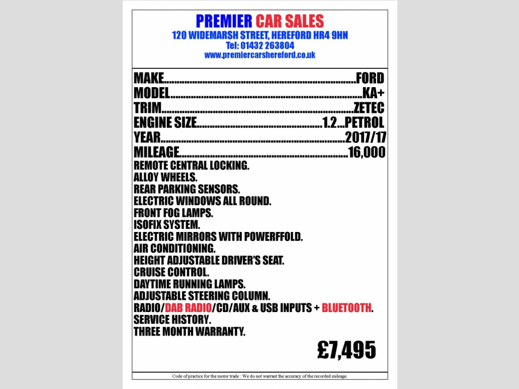 This 2017 Ford Ka+ 1.2 Ti-VCT Zetec Hatchback is currently available for £7,495 in Hereford Herefordshire with Petrol engine and Manual gearbox. For more information or to arrange a viewing, click here to send us an email using form below.