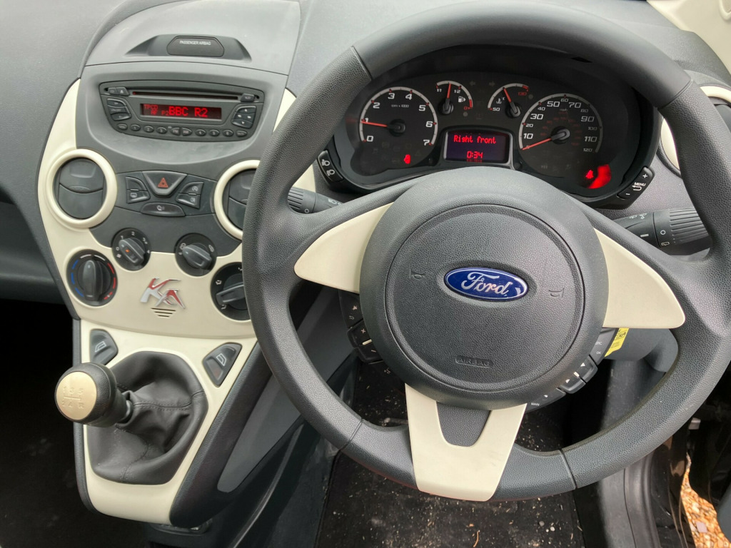 2015 '65' Ford KA 1.2 EDGEFinance available, please contact us for details.INTERIOR: Black / red cloth interior. Electric windows. Remote central locking. Power steering. Air con. Multiple air bags. Factory radio / cd player, with steering wheel controls.EXTERIOR: Black paintwork, colour coded bumpers. Some minor marks consistent with age.MECHANICALS: 1242cc petrol engine. 5 speed manual gearbox. All running gear good, and the car drives well. Fresh cambelt kit and engine service etc at 49k.PAPERWORK: Cat N repaired. Full logbook. Current MOT expires August 17th 2026. Invoice for fresh service and cambelt kit.OVERALL: Brilliant little car. Only £35 annual road TAX. Very low mileage. Smart looking. Drives superb. Fresh engine service, with cambelt kit etc. Long MOT., v power socket - front, aux connection, cd radio with mp3 and aux in connector - six radio speakers, 14in steel wheels - 6 spoke wheel covers, body colour bumpers, body colour exterior mirrors, door handles - body colour, electrically-operated front windows with one touch drivers, front towing hook, headlights - manual control, tailgate handle - body colour, tinted glass, tyre mobility kit, windscreen - heated with heated washer jets, abs - anti-lock braking system, airbags - front passenger, airbags - passenger deactivation, driver seat belt minder, drivers airbag, eba - emergency brake assist, ebd - electronic brakeforce distribution, emergency brake warning, engine immobiliser, front seat belts with pre-tensioners, immobiliser - safeguard passive anti-theft system - pats - insurance-approved category 2 immobiliser, manual locking doors, rear seats - isofix fittings, rear seat - head restraints, remote central locking, air conditioning - manual, floor mounted centre console - with single cup holder, front ashtray and cigar lighter, front dome light, front seatback map pockets - driver and passenger, front seats - driver tipping seat with easy entry - driver memory function, gearshift, loadspace compartment light, low series analogue cluster, passengers seat manual 2-way adjustment, rear seat - one piece foldable bench seat, removable rear parcel shelf, seats - drivers 4-way adjustment, steering wheel - 3 spoke, steering column - rake adjustable, stowage box - front passenger underseat area, sunvisor - drivers with vanity mirror, sunvisor - passenger with vanity mirror, epas - electric power assisted steering, front suspension - independent with macpherson struts, gearshift indicator light, mba - mechanical brake assist, headlights - courtesy delay, headlights - halogen, headlights - levelling system - automatic, high mounted brake light