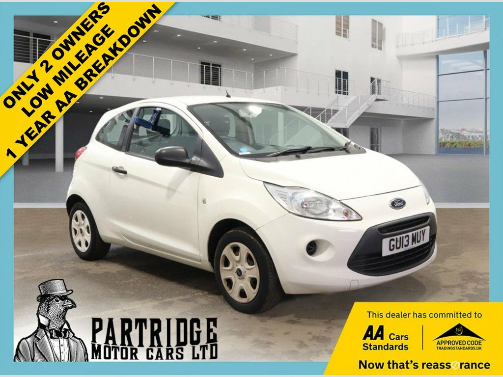 HPI CLEAR, SUPPLIED WITH NEW MOT, SUPPLIED WITH NEW SERVICE, ONLY 2 OWNERS, LOW MILEAGE, RADIO CD PLAYER, CHEAP TAX, CHEAP INSRURANCE, 3 DOORS, MANUAL, 3 MONTHS WARRANTY, 1 YEAR AA BREAKDOWN, AA DEALER **2013 Ford Ka 1.2 Studio: Only 2 Owners, Low Mileage, New MOT!** ******** An outstanding example of the perfect first car or economical daily commuter! This is the 2013 Ford Ka in the practical 'Studio' specification, finished in the crisp and clean **Crystal White**. This vehicle stands out due to its fantastic provenance, having had just **2 Owners From New**. Finding a car of this vintage with such low ownership is rare and indicates it has been truly cherished rather than passed around. Combined with its **Low Mileage**, this Ka feels incredibly fresh and drives superbly. Powered by the proven **1.2L petrol engine**, it is legendary for its reliability, excellent fuel economy, **Cheap Tax**, and **Cheap Insurance**. ******** This vehicle will be fully prepared by our workshop to the highest standard. To ensure the next owner drives away with complete peace of mind, it will be supplied with a **brand new service** and a **fresh 12-month MOT**, ensuring reliable motoring from the moment you drive away. ******** **Key Features:** *** **Only 2 Owners From New**: A fantastic attribute that suggests careful long-term ownership. *** **Low Mileage**: A lightly used example with plenty of life left in it. *** **Cheap Tax & Insurance**: Sits in one of the lowe Crystal White, Steel spare Wheel, Tyre Repair kit