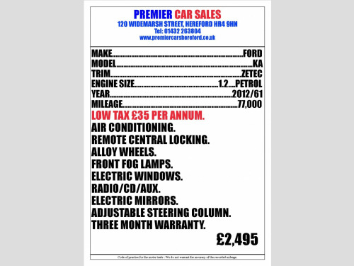 A great little hatchback with nice features and low running costs, including roat tax of only £35 per year. 2012 model. Remote Central Locking with two keys present. Alloy Wheels. Electric Windows. Electric Mirrors. Radio/CD with AUX Input. Air Conditioning. Front Fog Lamps. Adjustable Steering Column. We are at 120 Widemarsh Street, Hereford, HR4 9HN. Our website with full details is : www.premiercarshereford.co.uk, All of our vehicles are supplied with a three month warranty and long MOT. Card payments are welcomed and part exchanges are gladly considered. Low rate finance arranged, subject to status. Please call us on 01432263804 or 07831564655 for more information.