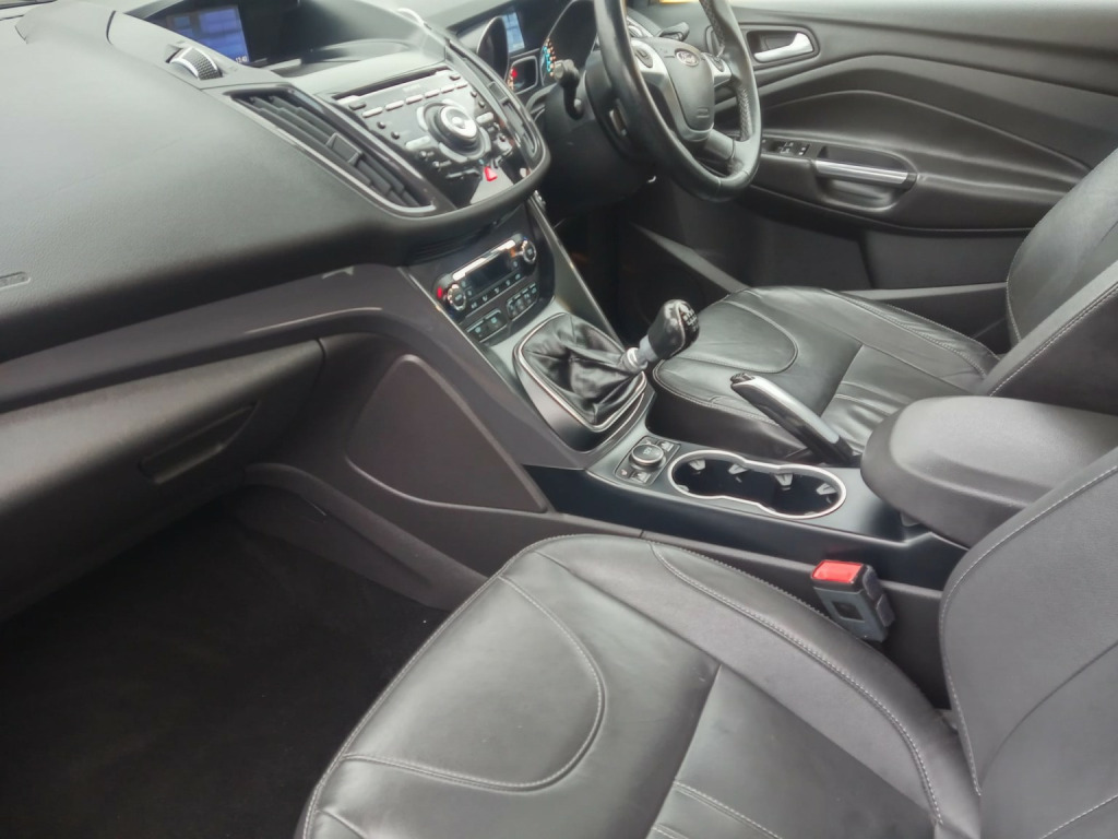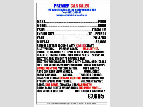 A great looking blue petrol Kuga Titanium with a full service history, including a very recent cambelt replacement. The feature list on this vehcile is extensive. Highlights include :, Remote Central Locking with two keys present and keyless go. SATNAV. Alloy Wheels. Privacy Glass. Powered Tailgate. Front & Rear Parking Sensors. Reversing Camera. Full Leather Interior. Heated Seats. Reach & Rake Adjustable Steering Column. Height & Lumbar Adjustment to both front seats. Electric Adjustment to Drivers Seat. Electric Windows all round with global control. ISOFIX. Rear 230V AC outlet socket. Rear Tray Tables. Rear Armrest. Split Recline Rear Seating. Electric Mirrors with powerfold. Auto High Beam Assist. Front Fog Lamps. Cruise Control with speed limiter option. Auto Dim Rear View Mirror. Auto Lights. Auto Wipers. LED Daytime Running Lamps. Lane Departure Warning and user selectable assist. Dual Zone Digital Climate Control Air Conditioning. Blind Spot Assist. Front Armrest. Radio/CD with DAB Radio/AUX & USB Inputs + Bluetooth Connection. Tyre Pressure Monitor. Hill Start Assist. Quick Clear Heated Windscreen. Traffic Sign Detection and Display. Traction Control. Tilt & Slide Electric Panoramic Roof with electrically operated sliding blind. Auto Park. We are at 120 Widemarsh Street, Hereford, HR4 9HN. Our website with full details is : www.premiercarshereford.co.uk, All of our vehicles are supplied with a three month warranty and long MOT. Card payments are welcomed and part exchanges are gladly considered. Low rate finance arranged, subject to status. Please call us on 01432263804 or 07831564655 for more information.
