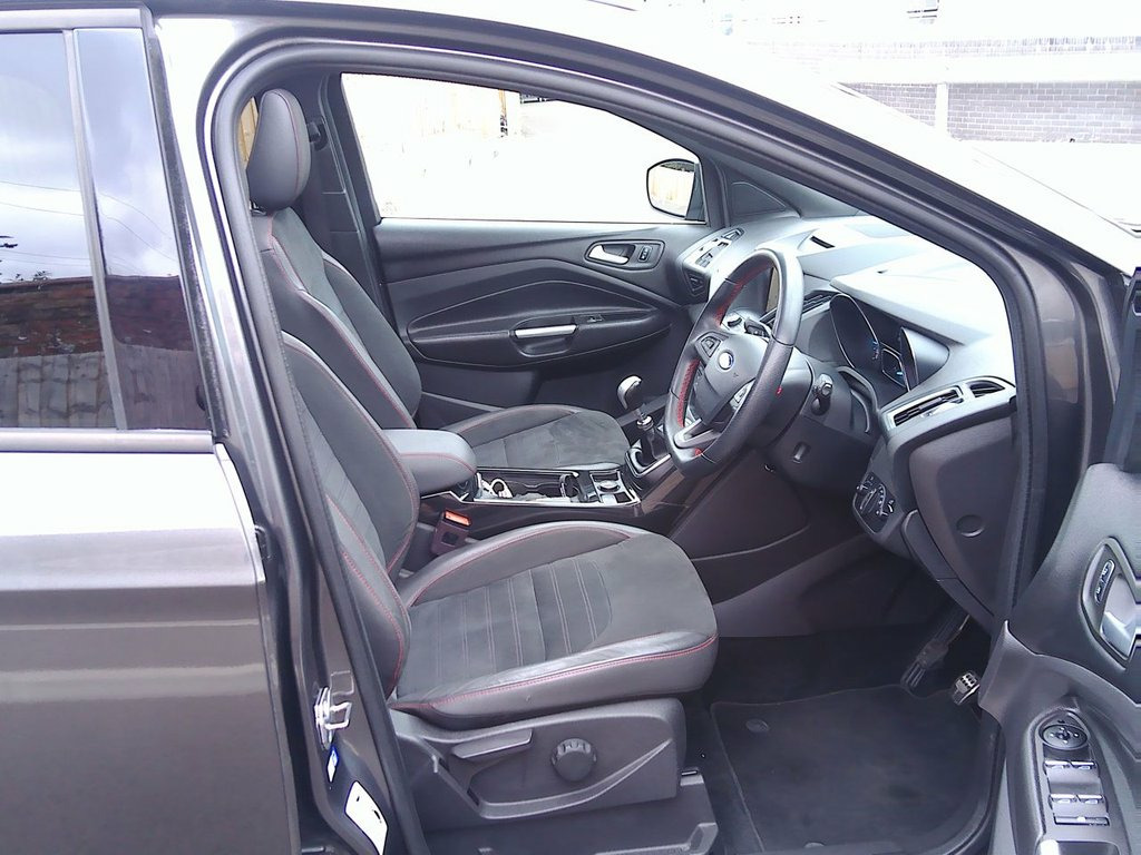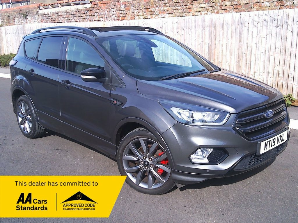 Discover this 2019 Ford Kuga TDCi ST-Line Edition, having covered just 38,500 miles and complete with Full Service History Records. Finished in stunning Magnetic Grey Metallic with distinct ST Line styling including black part leather interior. It features the advanced Ford SYNC3 DAB Navigation System, complete with Android Auto and Apple CarPlay integration, alongside Bluetooth connectivity. Manoeuvering is made effortless with the Enhanced Active Park Assist, which includes front and rear parking sensors, and the convenience of a Ford Key Free System for keyless entry and start. Other enhancements include Opeing Panoramic Glass Roof, Dual Climate Control and Cruise Control. This Euro 6 compliant model boasts a clear vehicle history check, offering peace of mind. This Kuga ST-Line Edition is designed for both efficiency and enjoyment, achieving an impressive fuel economy of 46 mpg. Its low CO2 emissions further highlight its economical nature compared to similar vehicles. With 6 recorded services, our advertised price includes a further service, 12 month's MOT and a 6 month warranty for complete peace of mind. We are happy to take your part exchange and guarantee to offer the best price possible for your car. Thinking of Car Finance? We work with leading specialist motor finance companies to find the best deal for you. With a simple, straight forward application, please ask us for a quotation to see just how affordable this car could be. The Kuga is here at th Magnetic Grey Metallic, 19in Alloy Wheels - 5x2 Spoke Rock Metal, Dinamica Micro Fibre - Salerno Leather -, Ford SYNC3 DAB Navigation System With Ap, Appearance Pack, Power Opening Panoramic Roof, Cruise Control with Adjustable Speed Lim, DEATC - Dual-Zone Electronic Automatic T, Enhanced Active Park Assist including Fr, Mini Spare Wheel - 17in Steel, Quickclear Heated Windscreen, 6-Way Manual Driver Seat with Lumbar Adj, 12V Power Socket - Load Compartment, 6-Way Manual Passenger Seat with Lumbar , Airbags - Driver and Front Passenger, Airbags - Drivers Knee, Airbags - Front Side Impact, Airbags - Front and Rear Side Curtain, Alloy Foot Pedals, Rear Parking Sensors, Anti-Lock Braking System