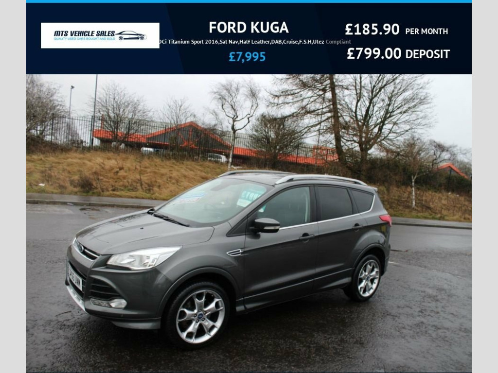 This Top of the range Kuga Titanium Sport is in superb condition,Only 1 Previous Owner with Full Service History,This Titanium Sport Model comes with great spec includingSat Nav, Half Black Leather Interior ,18*Alloys.Electric Windows,Remote Central Locking(2 keys) Privacy Glass,Front&Rear Parking Sensors,Bluetooth,DAB,Air Con,Cruise Control ,Colour Coded Body Mouldings,and lots more,2.0 Turbo Diesel,150bhp,6 Speed Returns an average of 60mpg,Excellent condition inside&out,Looks great Magnetic Grey Metalic,Superb Driving and looking Kuga 18in Alloy Wheels - 5x2 Spoke, 8in High Resolution Touchscreen, ABS - Anti-lock Braking System, Air Conditioning - Dual Zone Electronic , Airbags - Drivers Knee, Airbags - Front and 2nd Row Curtain, Airbags - Front Passenger, Airbags - Side Impact, Alarm - Thatcham Category 1 with Volume , Armrest - Folding Centre - Rear, Audible Text Messaging, Automatic Dimming Rear View Mirror, Automatic Rain Sensing Wipers, AUX Connection, Bluetooth Hands-free Phone, Body Colour Exterior Mirrors, Body Colour Side Skirts, Body Coloured Front Skirts, CD Player, Centre Console - Bottle-Can Holder, Centre Console - Stowage Tray, Courtesy Light - Footwell Illumination, Courtesy Light - LED Overhead with Theat