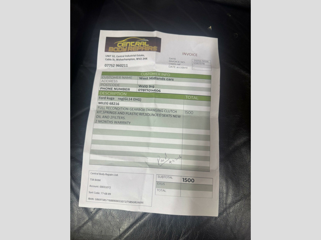 FULL 12 MONTH MOT WARRANTY MILGE CAR CHECK WEBSITE SIDE FOR MORE AUTOMATIC CARS JUST ARRIVED PART EXCHANGE AND DELIVER AVAILABLE LOW RATE FINANCE AVAILABLE 0 DEPOSIT FINANCE AVAILABLE This 2014 Ford Kuga TDCi Zetec presents an exceptional find with its remarkably low mileage of just 68,221 miles for a vehicle of its age. This Four Wheel Drive model is powered by an efficient 2.0 litre diesel engine, offering a robust yet economical driving experience. Inside, you will find manual air conditioning to keep you comfortable in all conditions.The Kuga Zetec is also noted for its low insurance group, suggesting that running costs could be more affordable compared to similar vehicles. This combination of a well maintained, low mileage Four Wheel Drive diesel SUV with desirable features and economical running costs makes this Ford Kuga a compelling choice for many drivers.. 17in Alloy Wheels - 5x2 Spoke - Premium, ABS - Anti-lock Braking System, Air Conditioning - Manual, Airbags - Drivers Knee, Airbags - Front Passenger, Airbags - Front and 2nd Row Curtain, Airbags - Side Impact, Alarm - Thatcham Category 1 with Volume Sensing and Perimeter, Body Colour Exterior Mirrors, Bounce-Back Sensors, Centre Console - Sliding Armrest, Centre Console - additional 12V power socket, Courtesy Light - Footwell Illumination, Courtesy Light - Front and Rear Reading Lights, Courtesy Light - LED Overhead with Theatre Style Dimming Ambient Lighting, Cruise Control with Speed Limiter, Daytime Running Lamps, Door Handles - Body Colour, Door Lever - Aluminium, Door Mirrors - Electrically Operated and Heated, Door Mirrors - Puddle Lights, Door Mirrors with Integrated Indicators, Drivers Airbag, Drivers Seat Lumbar Support, EBA - Emergency Brake Assist, EBD - Electronic Brakeforce Distribution, EPAS - Electric Power Assisted Steering, ESP - Electronic Stability Programme, Electric Windows - Front and Rear with One Touch, Emergency Brake Warning, Ford 6000 Radio CD audio system, Ford Easy-Fuel Capless Refuelling System, Ford Power Engine Start-Stop Button, Front Fog Lights, Front Seat - Passengers Manual Fore-Aft Adjustment, Front Upper Grille - Chrome, Front lower grille - Moondust Silver colour surround, Front suspension - Independent with MacPherson Struts, HLA - Hill Launch Assist, Headlights - Courtesy Delay, Heated Front Windscreen, IPS - Intelligent Protection System, ISOFIX, Large Stowage Bin, Load Compartment - Tie Down Hooks, Locking Wheel Nuts, Portable Audio Device Connector, RSC - Roll Stability Control, Rear Spoiler - Body Colour, Rear suspension - Independent control blade multi-link system and anti-roll bar, Remote Central Locking, Scuff plates - front moondust silver colour, Seats - 60-40 Rear Split Back, Seats - Drivers Manual Height and Fore-Aft Adjustment, Seats - Front Sports, Spare Wheel - Mini Steel, Speakers - x6, Steering Column - Rake and Reach Adjustment, Steering Wheel - 4 Spoke Leather Trimmed, Steering Wheel - Multifunction, Storage - Upper Instrument Panel, Stowage Pockets - Front Seatback, TFT Display screen, TSC - Trailer Stability Programme, TVC - Torque Vectoring Control, Tinted Glass - Green, Tonneau Cover, Traction Control - TC, Twin Exhaust Outlet, Variable Dimming of Instrument Cluster and Radio Screen Display, Visual AWD Monitor.