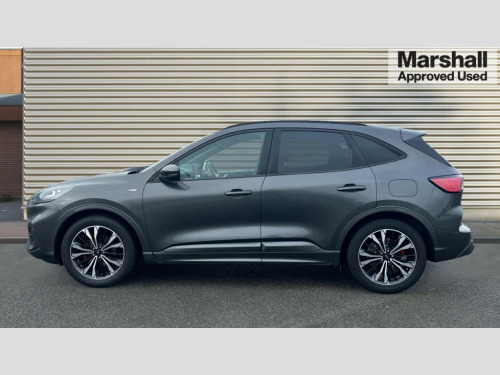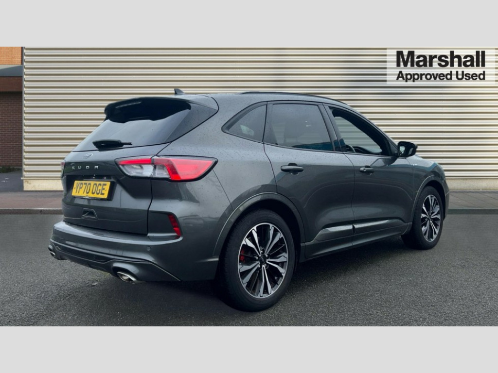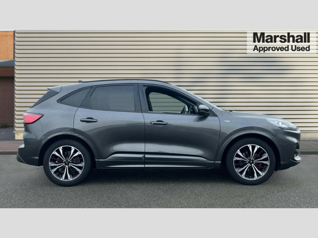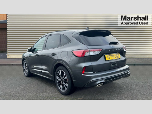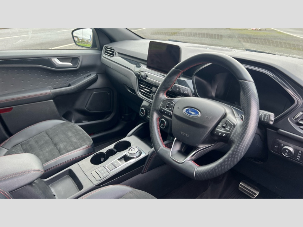 Ford Kuga 1.5 EcoBlue ST-Line X 5dr Auto Driver impairment monitor, Ford easy fuel, Ford SYNC 3 with 8" colour touchscreen, App Link, andriod auto/apple carPlay and navigation with Ford pass connect, Front and rear parking sensors, Hands free power tailgate, Intelligent speed assist, Lane keeping aid with lane departure warning, Mobile phone wireless charging pad, Power assist steering, Selectable drive modes, Sports suspension, Auto dimming rear view mirror, Auto headlamps with high and low beam, Auto wipers, Black roof rails, Front LED fog lights with cornering function, Full LED headlamps, Large rear spoiler, LED daytime running lights, LED rear lights, Power folding heated door mirrors with puddle lights, Power front/rear windows with global close, Power opening panoramic roof, Privacy glass, Quickclear heated windscreen, ST Line body styling kit with unique front and rear fascia and bumper, rear painted diffuser, front painted skid plates, dark mesh upper grille, ST Line front scuff plates, Twin exhausts, 10 way power adjustable drivers seat, 2nd row sliding seats, 8 way manual passenger seat including lumbar support and height adjust, Alloy pedals, Ambient lighting, Centre console with electronic parking brake, Dark headlining and pillars, Dual electronic automatic temperature control, Flat bottomed leather steering wheel in sensico with red stitching, Front and rear head restraints, Heated passenger and driver seats, Rear charging point, Sensico partial premium leather upholstery, Sports seats, ST Line front and rear floor mats, Steering wheel mounted paddle shift, B&O with large instrument cluster pack - Kuga, 3x3 point rear seatbelts, Airbags - front driver/passenger, front and rear curtain, Drivers knee airbag, Electronic stability control (ESC) and ABS, Ford MyKey Gen 2 safety system, Post collision braking, Powered child proof rear door locks, Pre collision assist with autonomous emergency braking, Red brake calipers, Tyre pressure monitoring system, Engine immobiliser, Keyless entry, Keyless start with 'Ford Power' starter button, Locking wheel nuts, Remote powered central double locking doors, Thatcham category 1 alarm