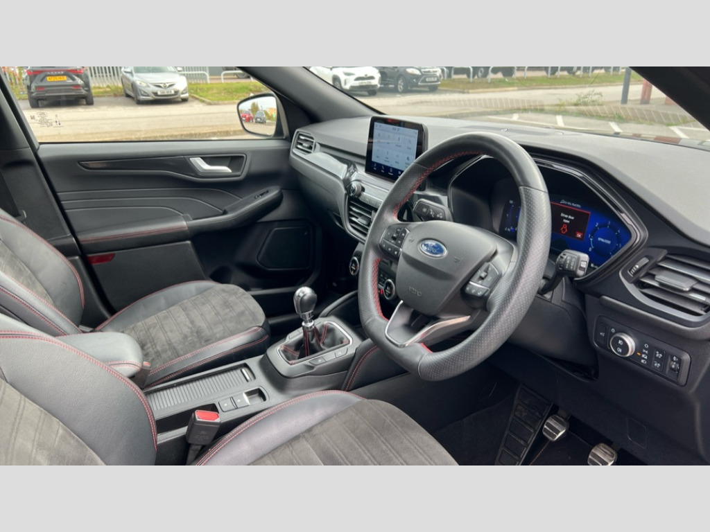 Ford Kuga 1.5 EcoBlue ST-Line X Edition 5dr 12.3" digital colour instrument cluster, Ford easy fuel, Ford SYNC 3 with 8" TFT LCD touchscreen, App Link, andriod auto/apple carPlay, emergency assistance and navigation with Ford pass connect, Front and rear parking sensors, Hands free power tailgate, Lane keeping aid with lane departure warning, Power assist steering, Rear view camera, Selectable drive modes, Service interval indicator, Sports suspension, Twist beam rear suspension, B&O premium audio system with 10 speakers and subwoofer, 2 USB ports, DAB radio/CD, Auto headlamps with high and low beam, Black roof rails, Day/night rear view mirror, Front LED fog lamps, Large rear spoiler, LED daytime running lights, LED rear lights, Power folding heated door mirrors with puddle lights, Power front/rear windows with global close, Power opening panoramic roof, Privacy glass, Quickclear heated windscreen, ST Line body styling kit with unique front and rear fascia and bumper, rear painted diffuser, front painted skid plates, dark mesh upper grille, ST Line front scuff plates, Third brake light, Twin exhausts, 10 way power adjustable drivers seat, 2nd row sliding seats with 60:40 split, 8 way manual passenger seat including lumbar support and height adjust, Alloy pedals, Centre console with electronic parking brake, Dark headlining and pillars, Dual electronic automatic temperature control, Flat bottomed leather steering wheel in sensico with red stitching, Front and rear head restraints, Heated passenger and driver seats, Heated rear seats, Heated steering wheel, Partial premium touch sensico leather upholstery with black cloth inserts and red stitching, Rear charging point, Sports seats, ST Line front and rear floor mats, ST Line gear knob, 3x3 point rear seatbelts, Airbags - front driver/passenger, front and rear curtain, Drivers knee airbag, Electronic stability control (ESC) and ABS, Ford MyKey Gen 2 safety system, Manual child proof rear door locks, Post collision braking, Pre collision assist with autonomous emergency braking, Rear seat Occupancy alert, Red brake calipers, Tyre pressure monitoring system, Engine immobiliser, Keyless entry and Ford power start button (Keyless start), Locking wheel nuts, Remote powered central double locking doors, Thatcham category 1 alarm