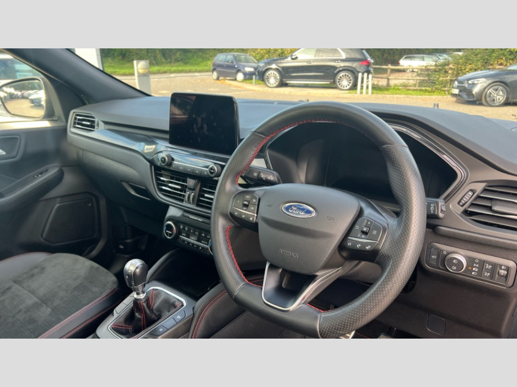 Ford Kuga 1.5 EcoBlue ST-Line X Edition 5dr 12.3" digital colour instrument cluster, Ford easy fuel, Ford SYNC 3 with 8" TFT LCD touchscreen, App Link, andriod auto/apple carPlay, emergency assistance and navigation with Ford pass connect, Front and rear parking sensors, Hands free power tailgate, Lane keeping aid with lane departure warning, Power assist steering, Rear view camera, Selectable drive modes, Service interval indicator, Sports suspension, Twist beam rear suspension, B&O premium audio system with 10 speakers and subwoofer, 2 USB ports, DAB radio/CD, Auto headlamps with high and low beam, Black roof rails, Day/night rear view mirror, Front LED fog lamps, Large rear spoiler, LED daytime running lights, LED rear lights, Power folding heated door mirrors with puddle lights, Power front/rear windows with global close, Power opening panoramic roof, Privacy glass, Quickclear heated windscreen, ST Line body styling kit with unique front and rear fascia and bumper, rear painted diffuser, front painted skid plates, dark mesh upper grille, ST Line front scuff plates, Third brake light, Twin exhausts, 10 way power adjustable drivers seat, 2nd row sliding seats with 60:40 split, 8 way manual passenger seat including lumbar support and height adjust, Alloy pedals, Centre console with electronic parking brake, Dark headlining and pillars, Dual electronic automatic temperature control, Flat bottomed leather steering wheel in sensico with red stitching, Front and rear head restraints, Heated passenger and driver seats, Heated rear seats, Heated steering wheel, Partial premium touch sensico leather upholstery with black cloth inserts and red stitching, Rear charging point, Sports seats, ST Line front and rear floor mats, ST Line gear knob, 3x3 point rear seatbelts, Airbags - front driver/passenger, front and rear curtain, Drivers knee airbag, Electronic stability control (ESC) and ABS, Ford MyKey Gen 2 safety system, Manual child proof rear door locks, Post collision braking, Pre collision assist with autonomous emergency braking, Rear seat Occupancy alert, Red brake calipers, Tyre pressure monitoring system, Engine immobiliser, Keyless entry and Ford power start button (Keyless start), Locking wheel nuts, Remote powered central double locking doors, Thatcham category 1 alarm