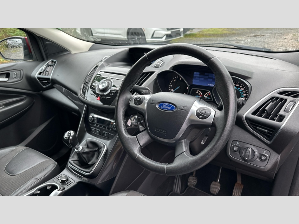Ford Kuga 2.0 TDCi 150 Titanium 5dr 2WD 'Ford Power' starter button, Cruise control + speed limiter, EPAS, Ford SYNC Bluetooth connection with voice control and USB port, Trip computer, 8 Speakers, Auxiliary socket for external device, Remote audio controls on steering wheel, 'Quickclear' heated windscreen/heated washer jets, Auto dimming rear view mirror, Automatic headlights, Body colour bumpers, Body colour rear spoiler, Electric front and rear windows + one touch + global open/closing, Electrically heated door mirrors, Front fog lights, Rain sensor windscreen wipers, Rear diffuser, Scuff plates, Tailgate wash/wipe, Twin exhaust pipes, 2nd row air vents, 4 spoke leather steering wheel with silver accents, 60/40 split/folding rear back and cushion, Auxiliary power socket in luggage area, Centre console with stowage tray/bottle holder/CD stowage/front and rear 12V power point, Driver/front passenger manual lumbar adjust, Driver/passenger front seatback pockets, Driver/passenger seats fore/aft adjustment, Dual electronic automatic temperature control, Folding rear centre armrest with storage compartment + cupholders, Footwell courtesy lights front and rear, Front head restraints, Front overhead courtesy lights with theatre style dimming and delay, Front/rear floor mats, Front/rear reading lights, Isofix system on outer rear seats, Leather gearknob, Manual height adjustable front seats, Part leather upholstery, Reach + rake adjustable steering column, Rear head restraints, Sports style front seats, Stowage unit in upper instrument panel, Tie down hooks, Tonneau cover, Variable intensity instrument illumination, 3 point seatbelts on all 3 rear seats, ABS/EBD, Driver and passenger airbags, Driver and passenger side airbags, Electric traction assist system, ESP+EBA, Front and rear curtain airbags, Hill start assist, Intelligent Protection System (IPS), Roll stability control, Tyre pressure monitoring system, Immobiliser, Locking wheel nuts, Remote central locking, Thatcham Cat 1 volume sensing perimeter alarm, Mini steel spare wheel