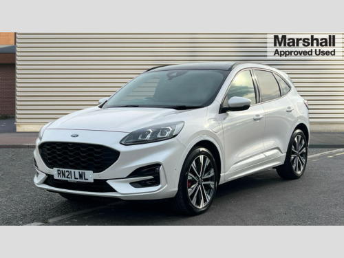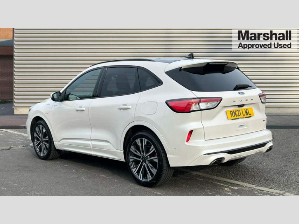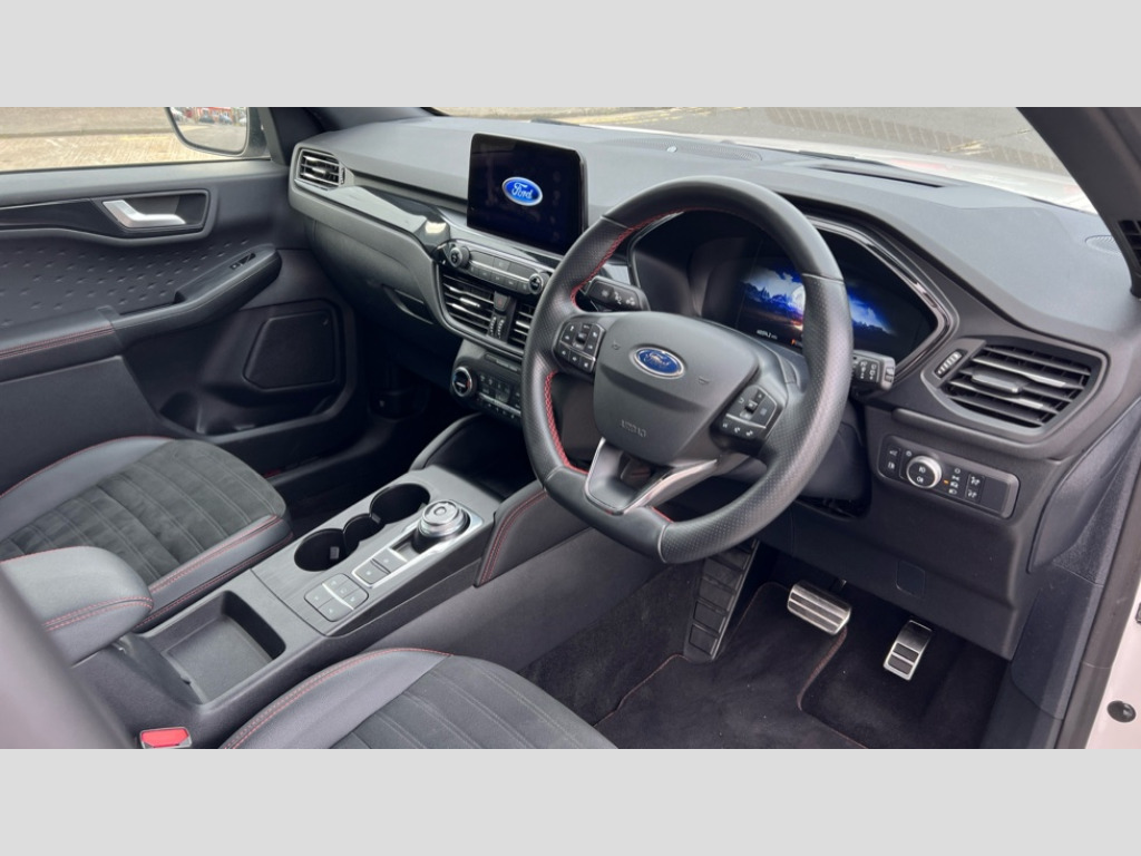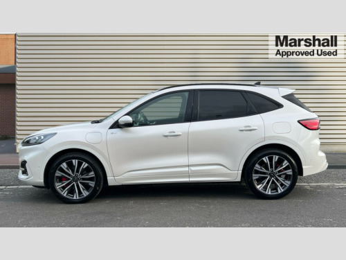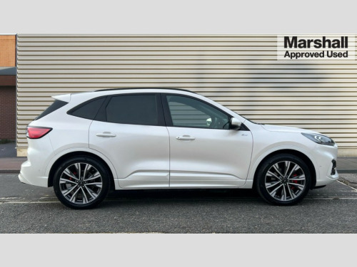 Ford Kuga 2.5 PHEV ST-Line X 5dr CVT Driver impairment monitor, Ford easy fuel, Ford SYNC 3 with 8" colour touchscreen, App Link, andriod auto/apple carPlay and navigation with Ford pass connect, Front and rear parking sensors, Hands free power tailgate, Intelligent speed assist, Lane keeping aid with lane departure warning, Mobile phone wireless charging pad, Power assist steering, Selectable drive modes, 3-Pin Home charge cable (230V/16A Domestic socket), Sports suspension, Ford DAB audio system with 6 speakers, Auto dimming rear view mirror, Auto headlamps with high and low beam, Auto wipers, Black roof rails, Front LED fog lights with cornering function, Full LED headlamps, Large rear spoiler, LED daytime running lights, LED rear lights, Power folding heated door mirrors with puddle lights, Power front/rear windows with global close, Power opening panoramic roof, Privacy glass, Quickclear heated windscreen, ST Line body styling kit with unique front and rear fascia and bumper, rear painted diffuser, front painted skid plates, dark mesh upper grille, ST Line front scuff plates, Twin exhausts, 10 way power adjustable drivers seat, 2nd row sliding seats, 8 way manual passenger seat including lumbar support and height adjust, Alloy pedals, Ambient lighting, Centre console with electronic parking brake, Dark headlining and pillars, Dual electronic automatic temperature control, Flat bottomed leather steering wheel in sensico with red stitching, Front and rear head restraints, Heated passenger and driver seats, Rear charging point, Sensico partial premium leather upholstery, Sports seats, ST Line front and rear floor mats, B&O with large instrument cluster pack - Kuga, 3x3 point rear seatbelts, Airbags - front driver/passenger, front and rear curtain, Drivers knee airbag, Electronic stability control (ESC) and ABS, Ford MyKey Gen 2 safety system, Post collision braking, Powered child proof rear door locks, Pre collision assist with autonomous emergency braking, Red brake calipers, Tyre pressure monitoring system, Engine immobiliser, Keyless entry, Keyless start with 'Ford Power' starter button, Locking wheel nuts, Remote powered central double locking doors, Thatcham category 1 alarm