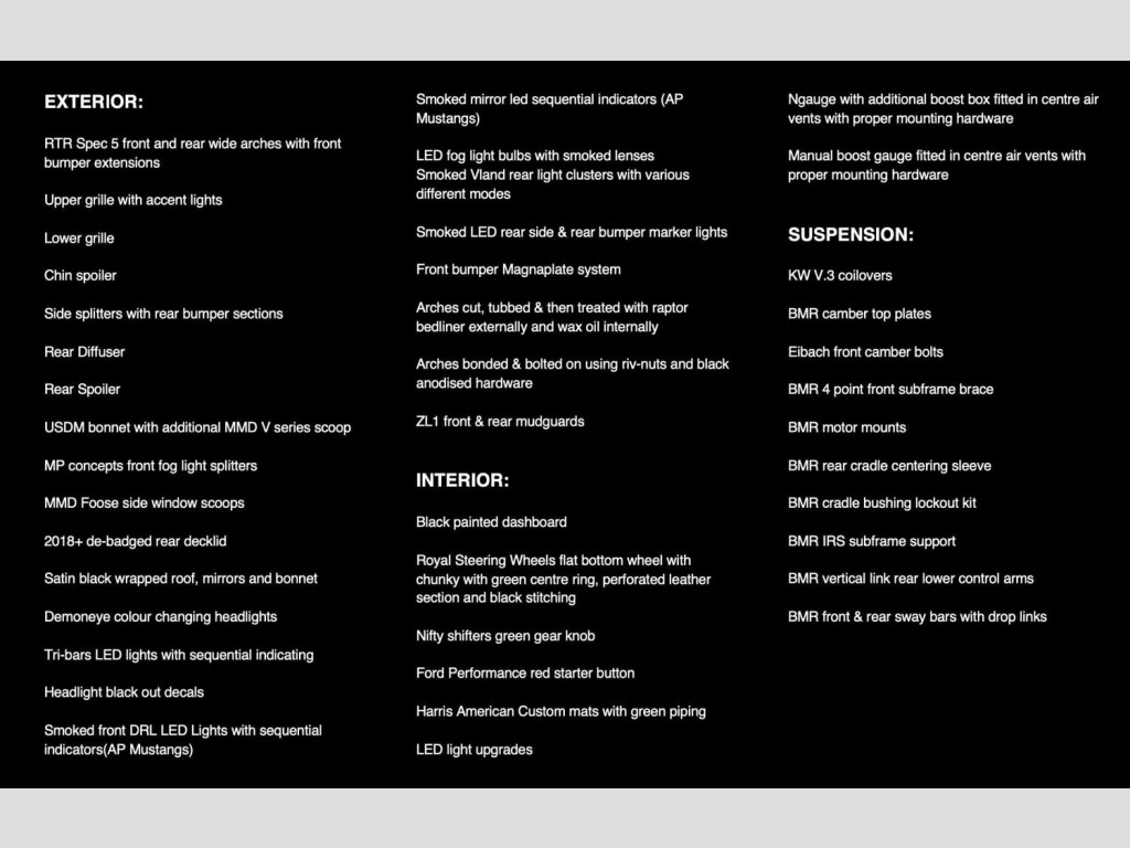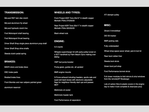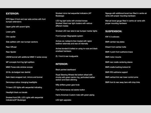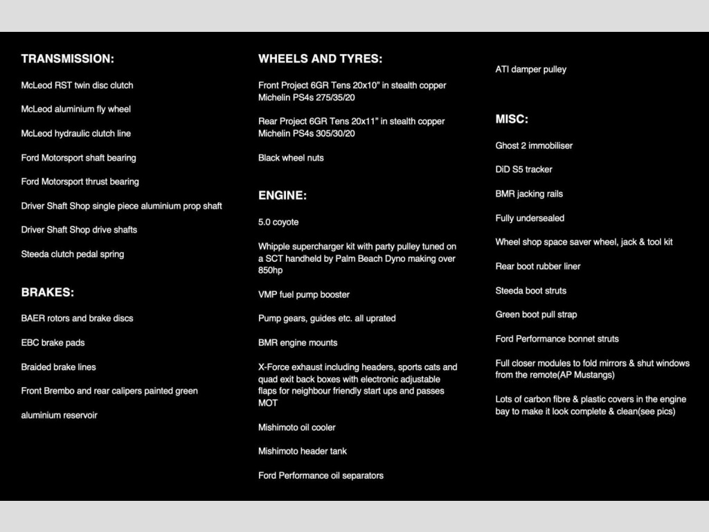 2016 16 Ford Mustang 5.0 V8 GT Fastback finished in Oxford White with full ebony Salerno leather interior. Just 23100 miles covered supported by Ford and specialist service history consisting of 7 services. This Mustang comes fully specified from factory with Custom Pack fitted and all options ticked. These include reverse camera and rear sensors, heated/cooled seats, Shaker audio system, keyless entry, Sync navigation etc. Supplied with both keys and two large folders containing invoices and history documentation supporting this incredible build. This is without a doubt the most impressive supercharged Mustang we have had the pleasure of taking into stock, sporting a Whipple supercharger, installed by Pumabuild in June 2018. The attention to detail and quality of the build is second to none and is the only known Mustang in the UK running the RTR body kit. The specification list is extremely extensive with tens of thousands spent, please see the advert images for the complete specification and parts list including interior, exterior, brakes, suspension, wheels, security upgrades and more. We have commissioned a dyno run ready for sale and the results show an impressive but safe and usable 694bhp at the wheels, or approximately 800 crank bhp and 828nm. The condition of the car is exceptional having been enthusiast owned, modified and maintained the highest standard. Please see images for the complete spec list.