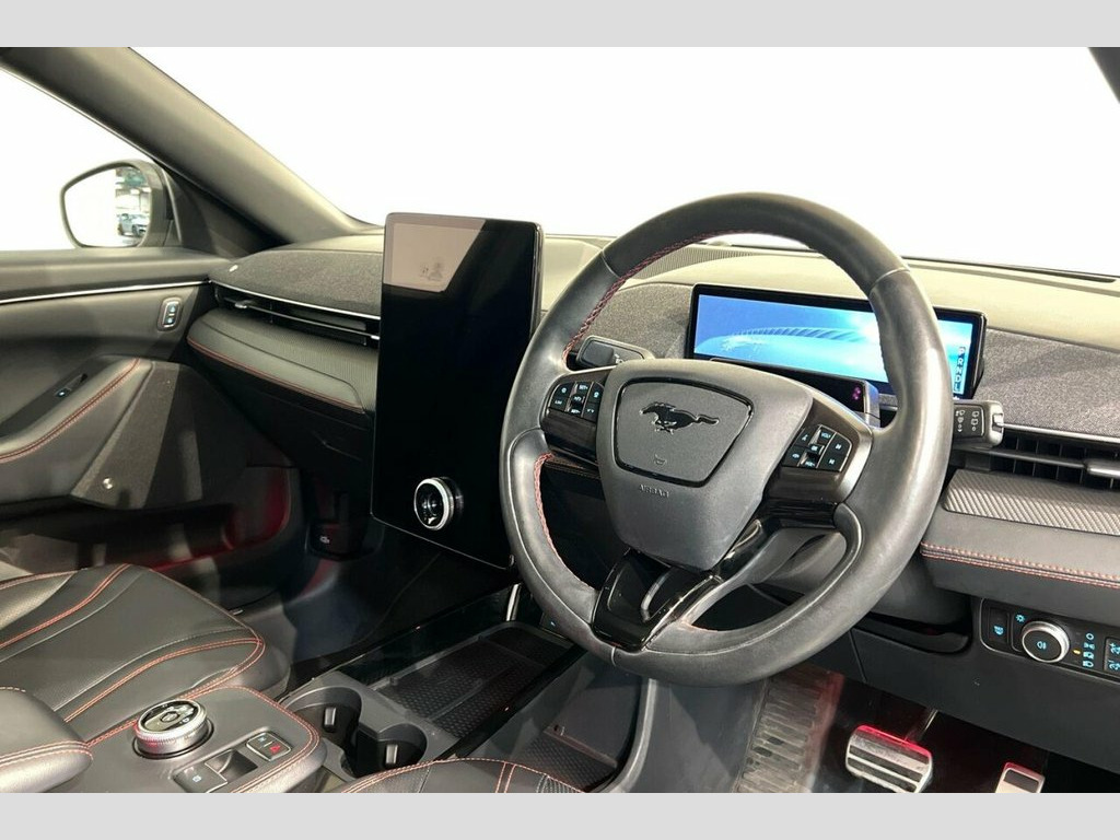 This 2022 Ford Mustang Mach-E Extended Range boasts a clear vehicle history and has had only one owner from new. This electric vehicle features a four wheel drive drivetrain and a substantial 99 kWh battery, offering a maximum range of 335 miles when new. Inside, you'll find a dual zone electronic automatic temperature control air conditioning system, a heated steering wheel, and the next generation SYNC system with connected navigation and natural voice search. Parking is made easier with front and rear parking sensors, complemented by a 360 degree camera system that includes parking assistance. The Mustang Mach-E Extended Range is designed for impressive performance and convenience. Its acceleration is a notable highlight, reaching 0-60mph in just 5.8 seconds, demonstrating its dynamic capability. Charging is also efficient, with a full charge at home using a 7kW charger taking approximately 14 hours and 36 minutes, while the fastest public charging can take the battery from empty to 80% in as little as 51 minutes. These features combine to offer a compelling electric driving experience that stands out from other vehicles in its class. 10.2in Full Digital Cluster and 15.5in C, 19in Alloy Wheels - Black Machined, 360 Degree Camera, 8-Way Power Driver and Passenger Seats, ABS - Anti-lock Braking System, Adaptive Cruise Control with Stop and Go, Adaptive LED Mustang Signature Headlamps, Air Conditioning - Dual Zone Electronic , Airbags - Driver and Front Passenger, Applink Remote Control System, Black Powerfold Mirrors with Puddle Ligh, Blade Front Grille Design, BLIS - Blind Spot Information System wit, Body Colour Bumpers, E-Latch Keyless Entry System including B, Electric Windows - Front, Ford VarioPower Charging Cable, FordPass Connect Embedded Modem, Front and Rear Parking Sensors, Front Trunk, Hands-Free Tailgate, Heate