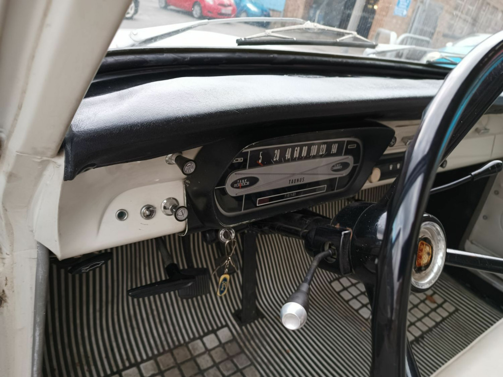 Recently arrived from Italy, we offer this superb and completely original early LHD example of Fords third generation 12M saloon. Having spent most of its life in Sicily, we understand that the car moved with its doctor owner to Milan for a few years with only limited use before arriving on these shores. Hardly surprising that there are just 47,000km showing on the clock which we have no reason to doubt as anything other than genuine. , This handsome Taunus (aka Cortina) presents very well both inside and out. The white paintwork isnt flawless but has an attractive patina with no signs of any corrosion – presumably one of the many benefits of leading a quiet life in sunny climes. The chrome is in excellent condition with original hubcaps and trim all present and correct. The inside retains an early-60s chic: comfortable, airy and practical. , The car drives extremely well with no mechanical issues apparent. The 1183cc V4 engine pulls nicely through the gears with no gripes or groans. Road holding is good and the brakes bring the car to a halt without drama. The car will be sold with a new MOT for peace of mind. , This is a fantastic opportunity to own an extremely but very usable classic motor car. Viewing highly recommended.