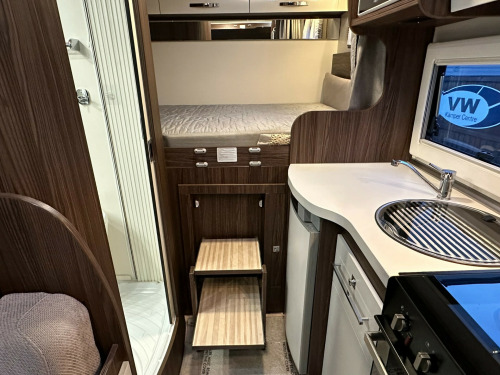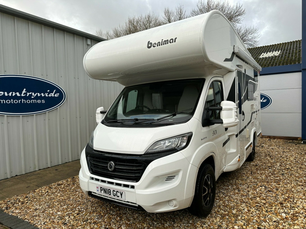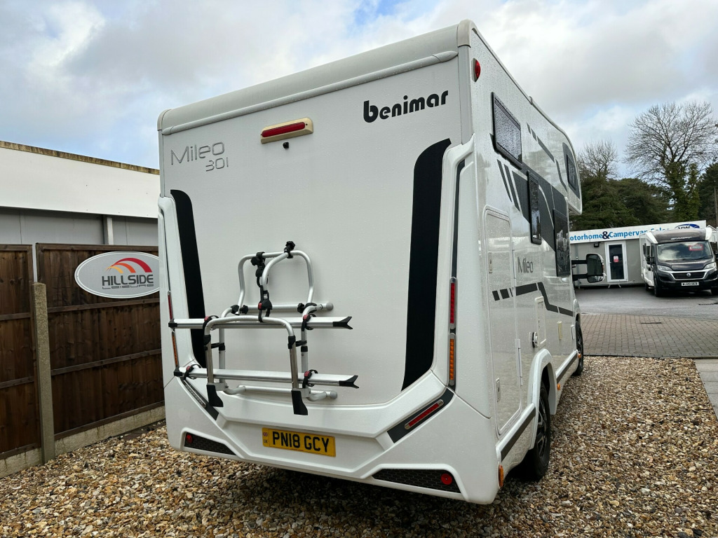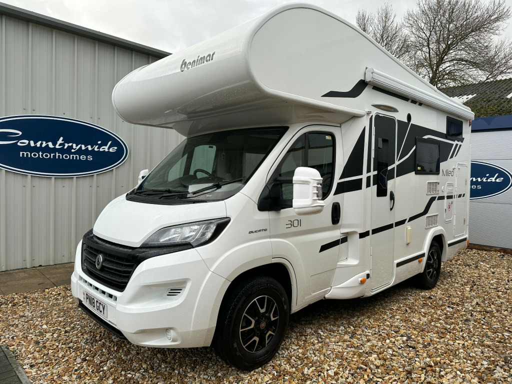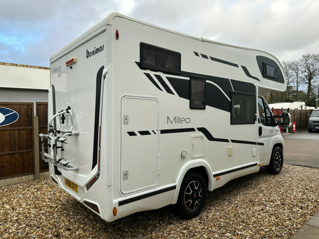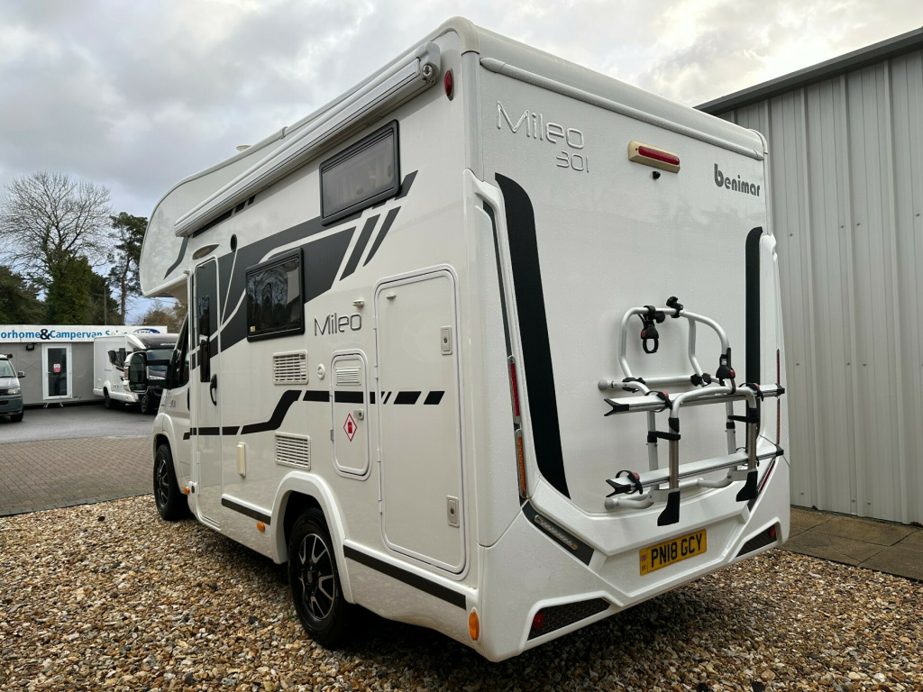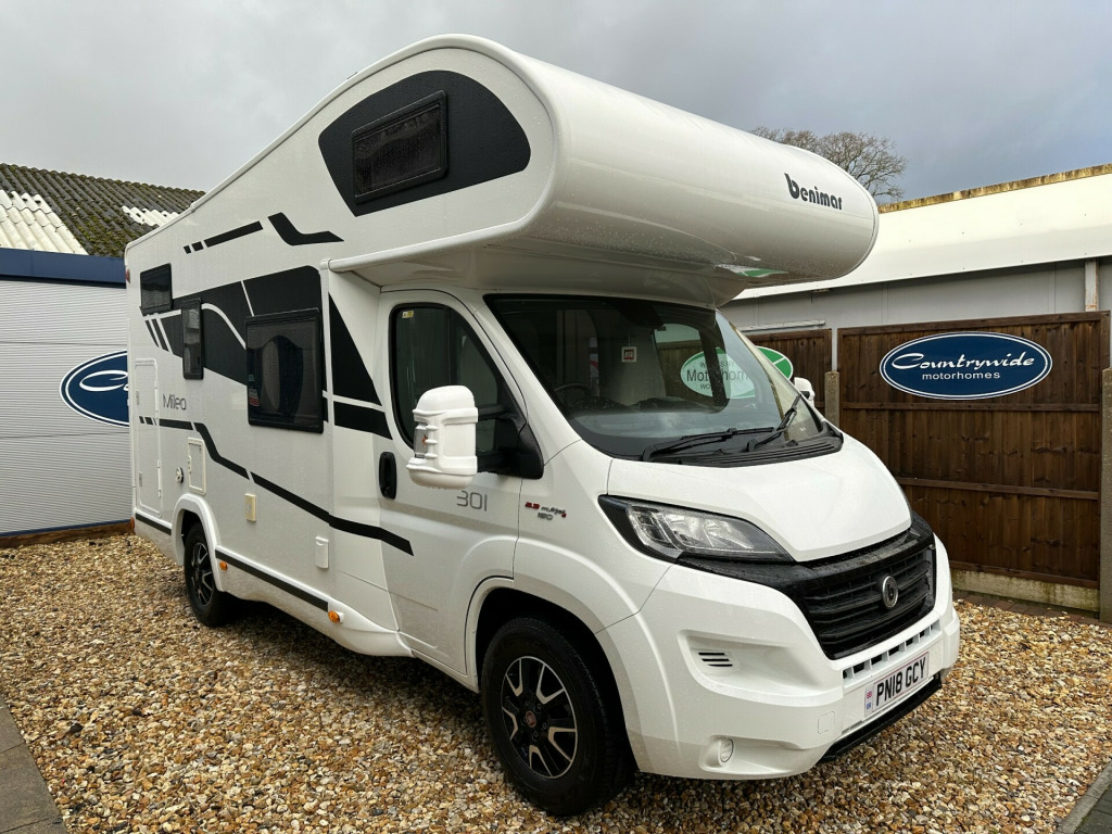 This Benimar Mileo compact 4-berth and belt motorhome is in the sub-6 m category, making it easy to fit in the driveway.The 2 double beds, one over the cab, provide well-proportioned sleeping areas.The kitchen has a microwave, oven, hob and fridge; the wetroom has a luxurious and spacious feel. A host of extras are fitted to the exterior of this vehicle. Call now 01202 855531 Option 1 for Sales and speak with one of our award-winning Leisure vehicle specialists for more information berth, 4 seat belts, 6 speed manual, alloy wheels, bike rack, drop down bed over cab area, fridge, garage area, gas bbq, gas grill/oven, gas hob, lots of outside storage, mains hookup, microwave, overcab bed, plgv (under 3.5t), reverse camera, transverse double bed, wind out awning