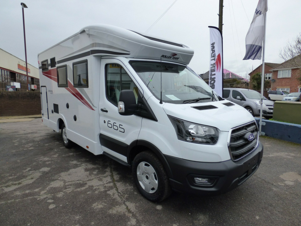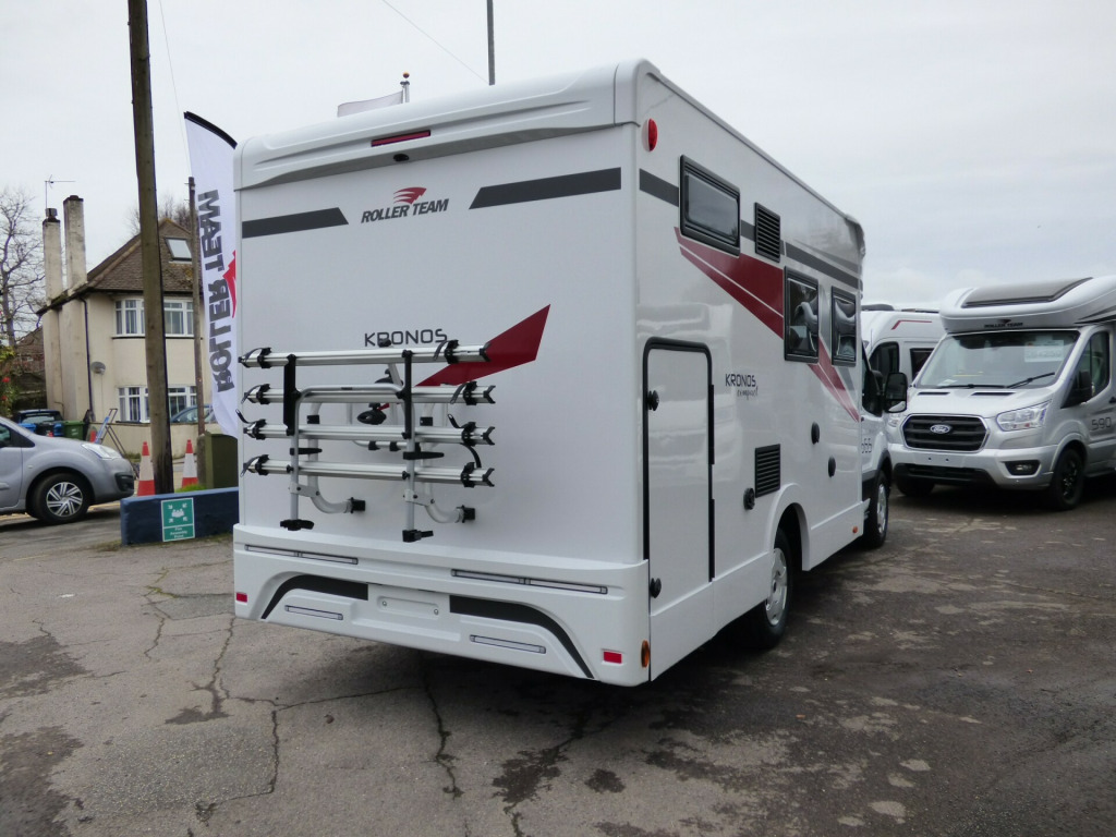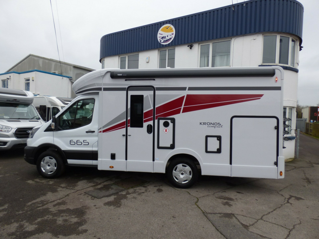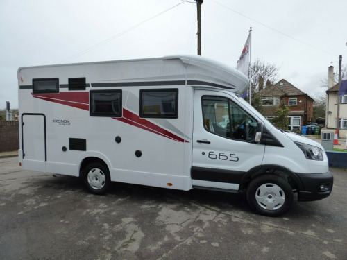 Special Offer - Free Prestige £2,250 Prestige Pack with this vehicle - includes Scorpion Defender S5+ Alarm and Tracker, 11kg Gaslow, 22'' Smart TV & Soundbar. New model for 2026, the Kronos 665 based on the Ford chassis with 130bhp engine and 6 speed manual transmission. The new 665, is sure to be a real hit with both families looking for a compact motorhome and couples with the need for occasional extra beds. The dinette seats 4 in comfort with swivel front seats. A fully equipped kitchen sits behind with a 3 burner gas hob and Thetford gas oven & grill below along with a large fridge/freezer. The bathroom opposite has a shower cubicle, cassette type toilet and wash hand basin. The rear fixed bed sits above a garage which is an exceptional size for a sub 6.5m motorhome. Heating and hot water is by a Truma dual fuel system and other features for the Kronos 665 include: Awning, WiFi, external shower & BBQ points, reversing camera, solar panel, bike rack. L. 6.41m, W. 2.15m, H. 2.95m, 4 berth, 4 seatbelts, Delivery miles. 0w solar panel with mppt controller, bike rack, carpets, external gas bbq point, external shower point, factory flex bed, flyscreen for hab door, front parking sensors, iso fix child seat fixings, rear garage, reversing camera, thule awning, tv bracket, ford 12, free prestige pack worth £2,250!, 16'' Steel