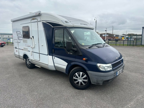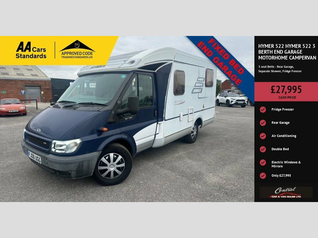 July 2006 Hymer 522 3 Berth motorhome finnished in blue/white. This example has covered just 76,149 miles from new and comes with extensive service history, This example has been cherished and serviced and maintained regardless to cost including a full re-wiring and electronic master unit in the last 6 months! Everything is in full working order and the usual Hymer quality is felt across this camper! The Hymer 522 is a compact motorhome, built on a Ford Transit base, known for its rear garage and practical layout. It features a kitchen, a washroom with a toilet and sink, and a living/dining area that converts into a bed. includes a large rear garage suitable for storing bikes or a scooter, a 3,500 kg gross vehicle weight allowing it to be driven on a standard car license, and features a reversing camera and cab air conditioning as well as electric door mirrors and windows! Spacious easy-access rear double bed 6' 6" x 4' 4", Front Lounge/Dinette with two rear 3 point seat belts makes into a single bed, kitchen: Hob with three gas rings, Large energy selection 3-way Fridge/Freezer, Sink. Spacious Bathroom, Swing wall creates Separate Shower Cubicle, Cassette Toilet with electric flush, Sink and Vanity Unit. Truma Combi Water Heater and Space Heater. Full 12v/240V Electric System. Leisure battery with mains and alternator charging. 240V consumer unit. Fully Insulated body and floor. Double glazing, Blinds and Fly-screens. Winterized water system with on-boar