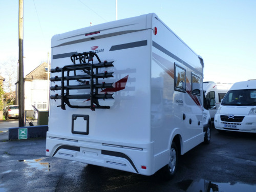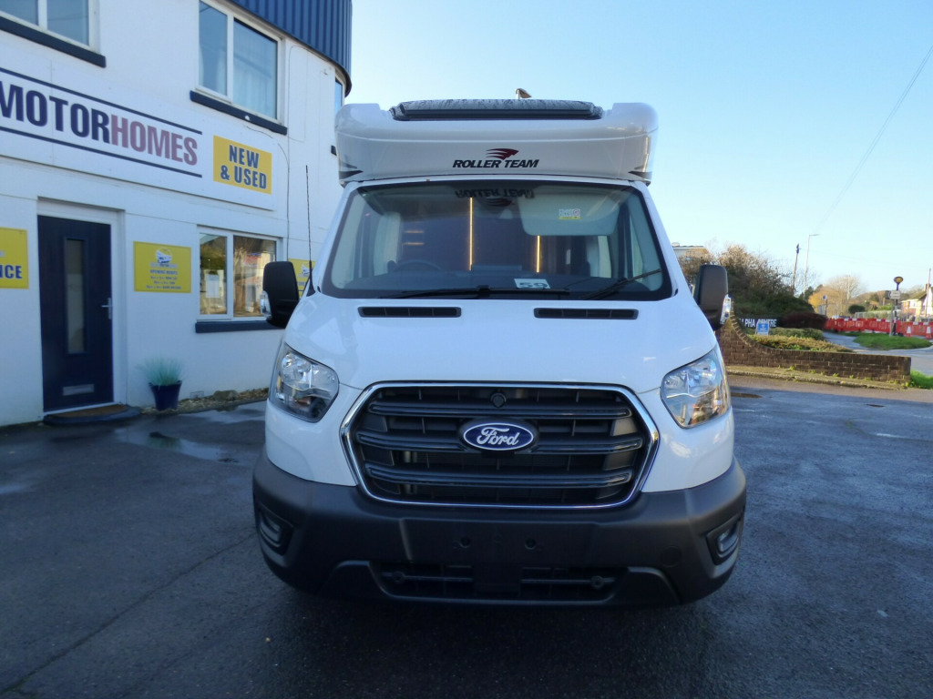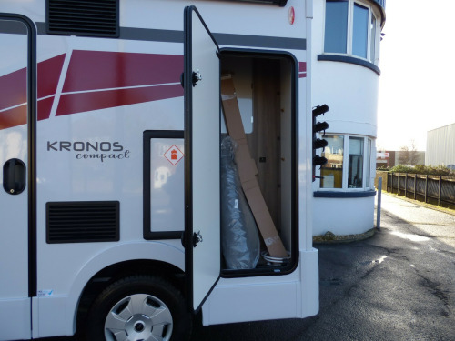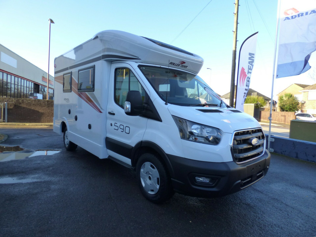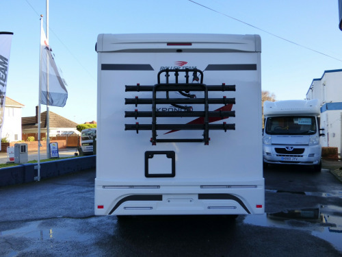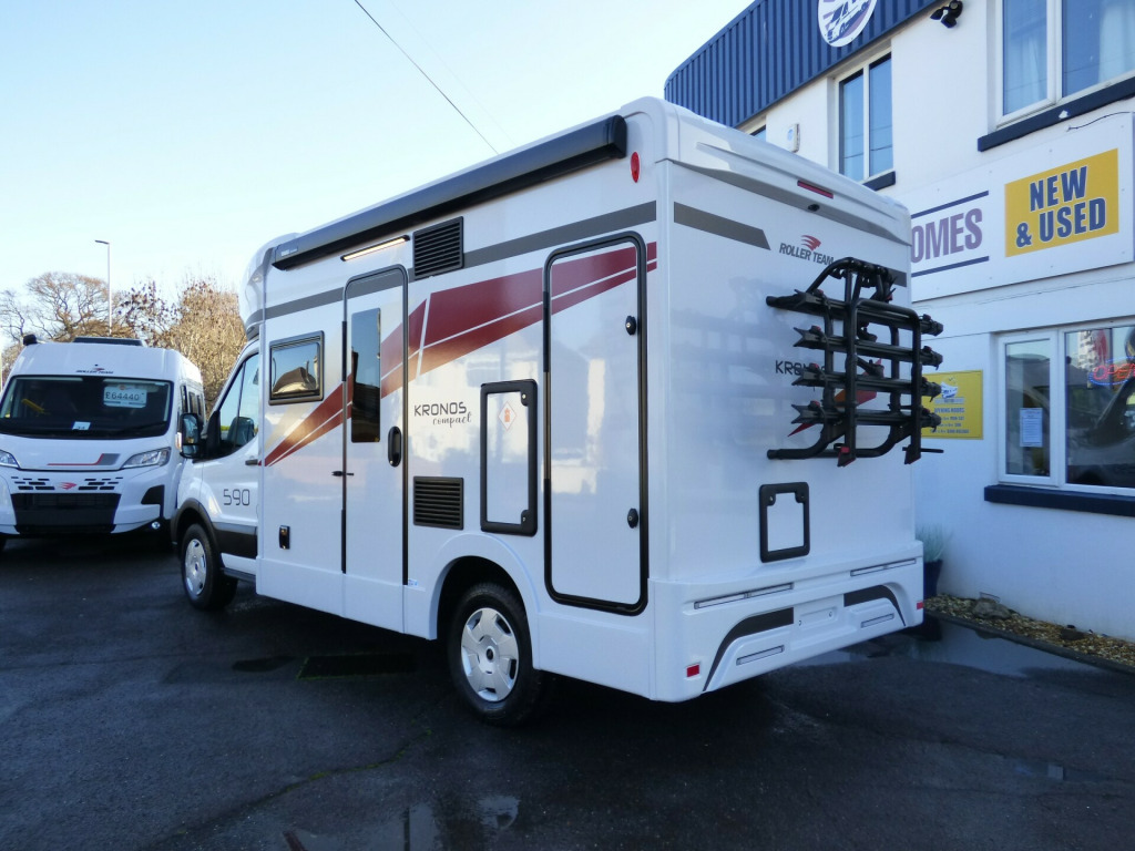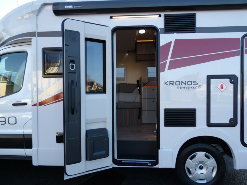 The all new Kronos 590 Compact from Roller Team - based latest Ford Transit chassis with 130bhp engine and 6 speed manual transmission and fitted with the new 12'' Ford infotainment system providing Apple Car Play and Android Auto, the new model also has front parking sensors and a new digital dashboard. The two front seats swivel to face the lounge where two opposing sofas form a surprisingly large dining and lounge area and also convert to a double bed for evening use and contain two further travelling seats with an electric elevating double bed over. The kitchen behind has a 2 burner gas hob, stainless steel sink with cover, Thetford gas oven/grill and large fridge/freezer. To the rear the bathroom has a separate shower cubicle, cassette type toilet and wash hand basin with cupboard space and access to the rear garage. Heating and hot water is via a Truma dual fuel system and other features for this Kronos 590 include: 200w Solar panel with MPPT controller, Reversing Camera, WiFi, Carpets, electric adjustable lounge table and Sat Nav/Infotainment system, Thule 4 bike rack, TV bracket and Thule wind out awning. 4 Berth, 4 seat belts. L. 5.99m, W. 2.15m, H. 2.85m, 3,500kg, delivery miles. wifi, cab a/c, carpets, dinette conversion option, flyscreen for hab door, iso fix child seat fixings, reversing camera, solar panel, thule 4 bike rack, thule awning, tv bracket, 16'' Steel