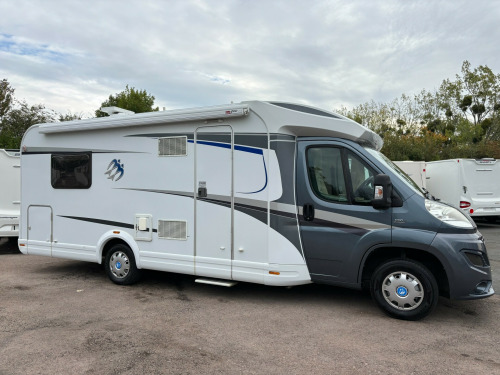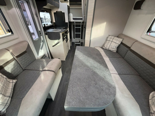 A great family low profile comprising of a rear transverse bed over a large garage, mid washroom with separate shower and a front dinette with a drop down bed above. ssette toilet, hand basin, shower, 3-way fridge, oven, sink/drainer, 3 point seatbelts, air conditioning, central locking, electric windows, park assist camera, power steering, cruise control, power steering, abs, air bag, passenger airbag, electric mirrors, tv aerial, front armrest, alloy wheels, colour coded body, awning, battery charger, blinds, blown air heating, fly screens, heki rooflight, hot water, mains electric, mid kitchen, solar panel fitted, water heater