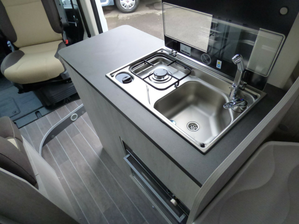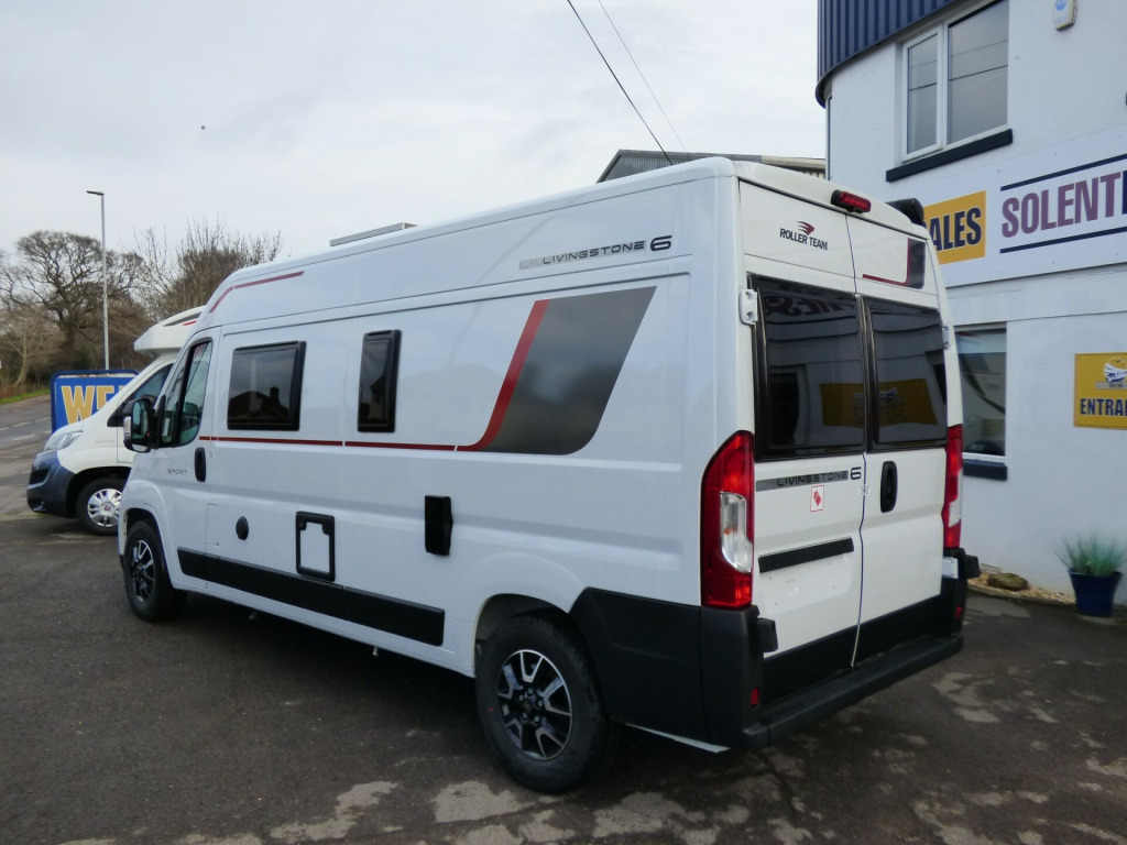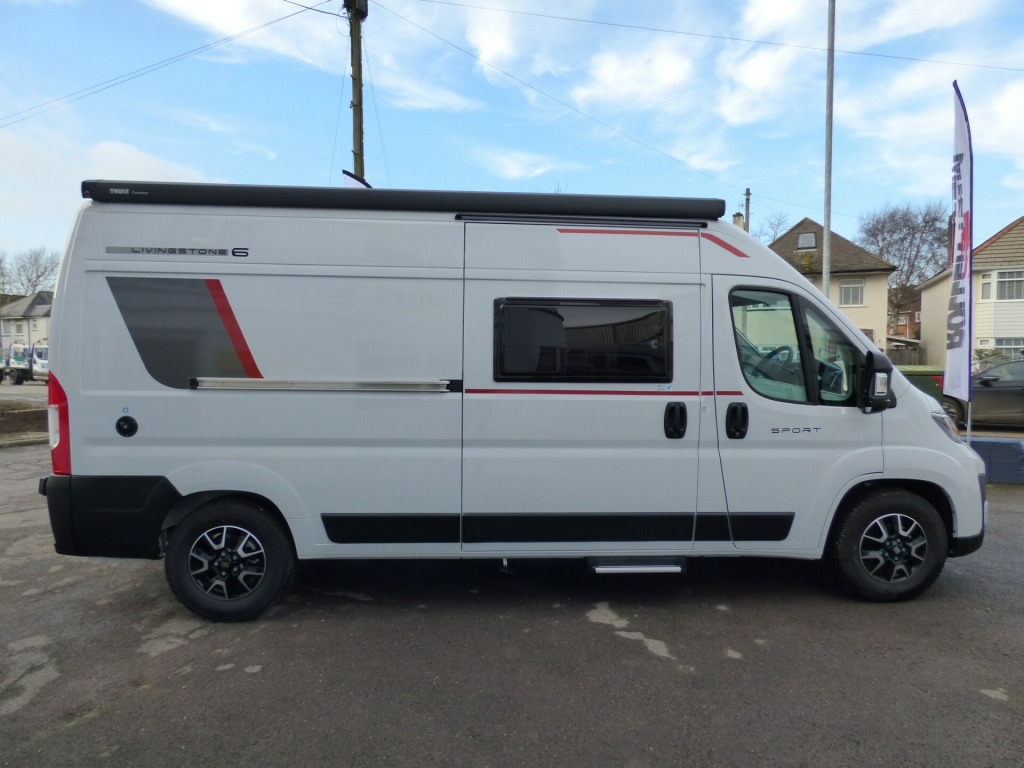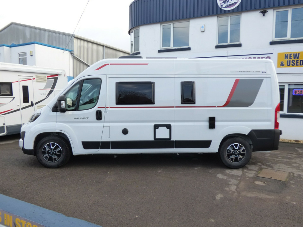 Last 2025 Model - Save £4650! Step inside the Livingstone 6 Sport and enter a world of refined comfort and practicality. Whether you're exploring rugged coastlines or serene countryside, this campervan transforms every trip into a chic, unforgettable adventure, inviting you to discover the joy of the journey with sophistication and ease. Based on the Fiat Ducato chassis with 140bhp engine and 6 speed manual transmission, the Livingstone 6 Sport is laid out for 4 to travel in comfort with the front seats swivelling to form a dinette and the side kitchen fitted with a Dometic fridge, twin gas burner hob and a gas oven. Opposite the bathroom features a fold away sink above a cassette type toilet and a wet room style shower cubicle. The rear bedroom has longitudinal twin beds that can turn into a good size double and fold away enabling larger items, bikes etc. to be carried. Ample cupboard space throughout and heating is via a Webasto diesel system with dual fuel water heating. Other features of this Livingstone 6 Sport include: Alloy wheels, Pioneer infotainent/sat nav, wind out awning, solar panel, pleated cab blinds, electric step and the latest Fiat cab. L. 5.99m, W. 2.05m, H, 2.85m, 3,500kg. 3 berth, 4 seat belts. Delivery Miles. 0w solar panel with mppt controller, alloy wheels, electric step, pleated cab blinds, reversing camera, solar panel, thule awning, free prestige pack worth £1655!, 16'' Alloys