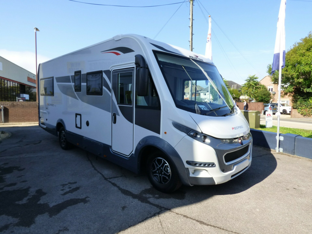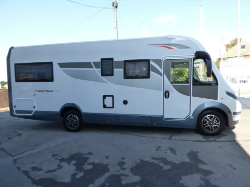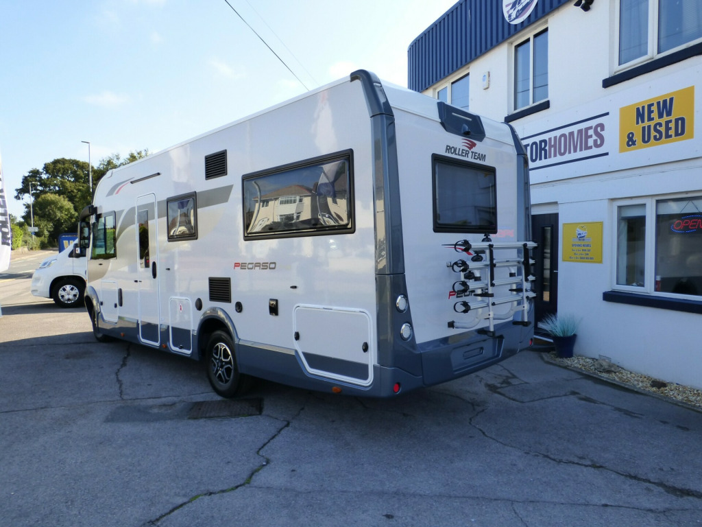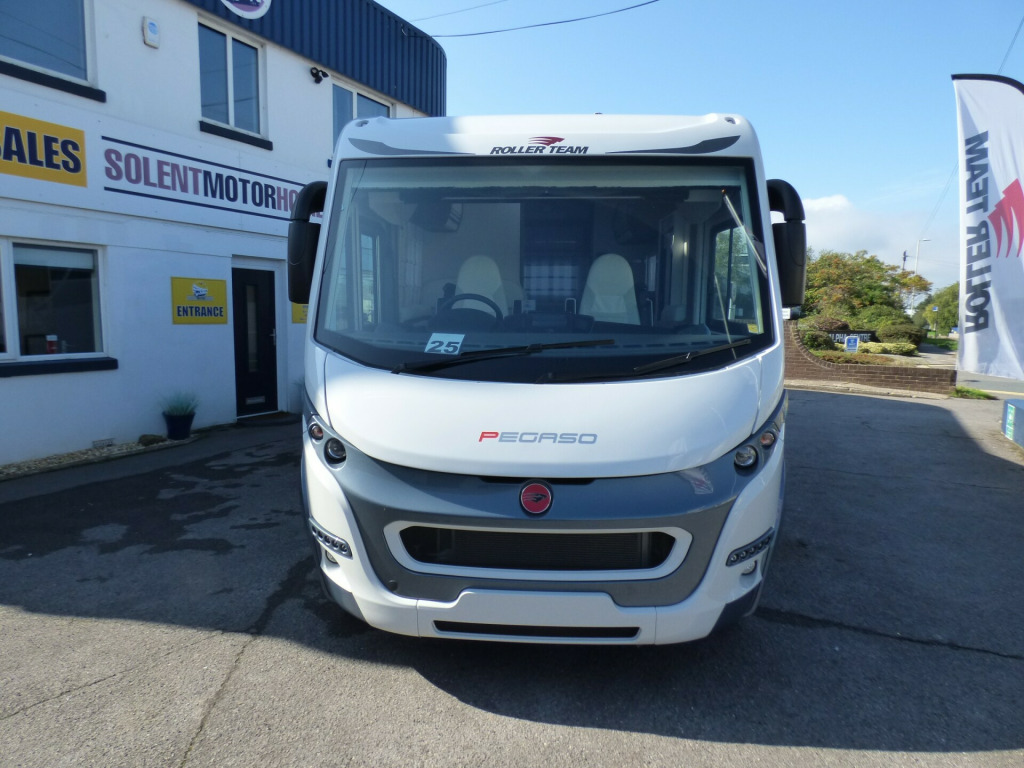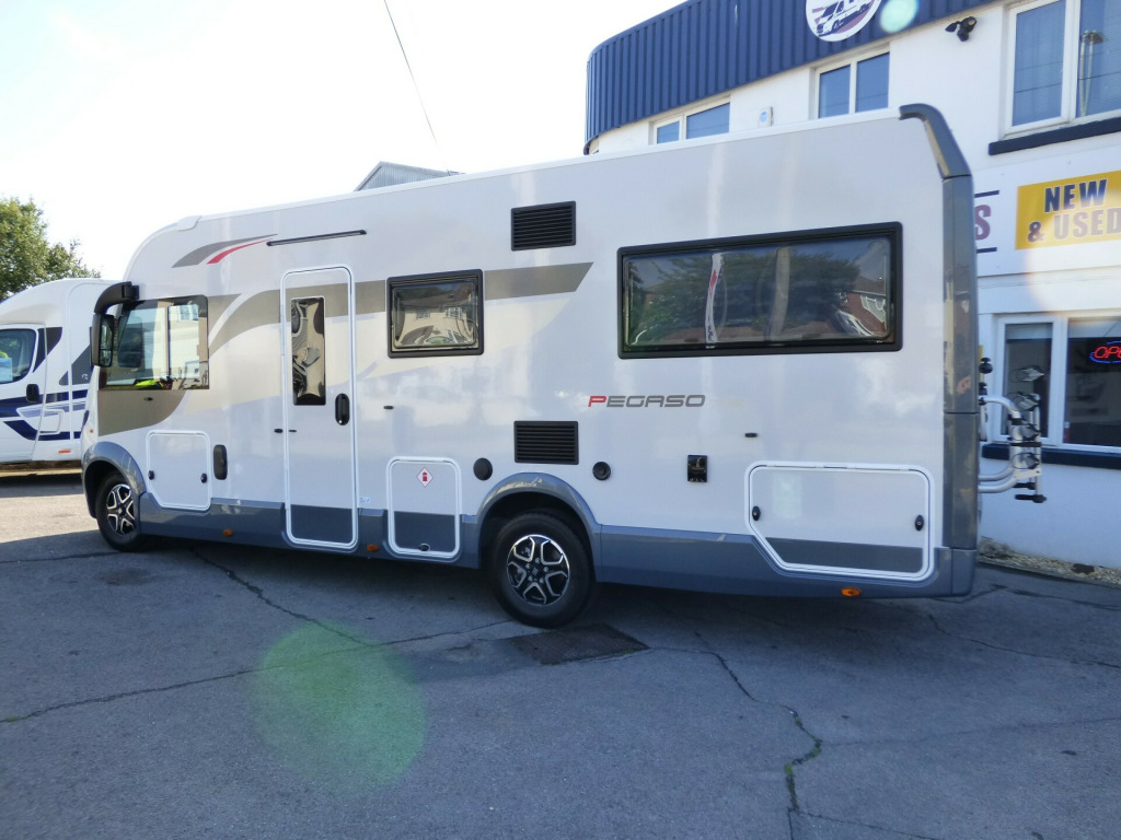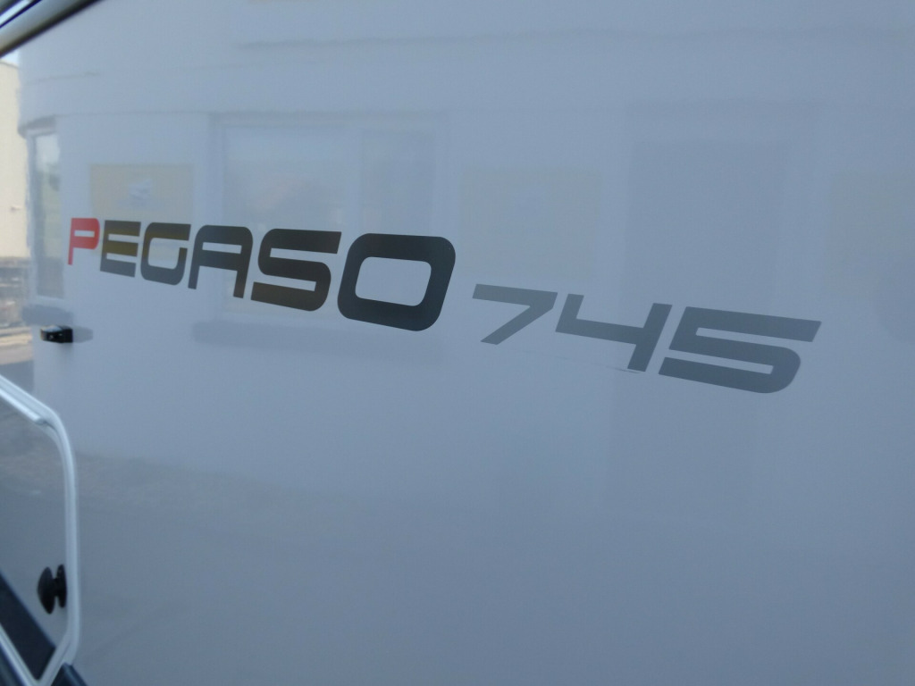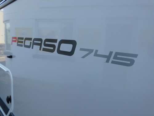 Special Offer - Free Prestige Pack - Includes Fiamma F45S Awning, Scorpion Defender S7 Alarm & Tracker, 22'' Falcon Smart TV, 11kg Gaslow refillable LPG system and starter pack, together worth up to £3,100!Brand new 2025 model Pegaso 745 automatic in stock now. The Pegaso 745 has been a popular addition to the range since it was introduced in 2019. Based on the Fiat Ducato chassis with 140bhp engine and 8 speed automatic transmission, the end lounge layout is a hit with families and couples as it provides a light and airy living area whilst keeping the dining area free. A double bed swings down above the cab area and the rear lounge turns into a further double bed quickly with a pull out bed system. The kitchen is located centrally to one side and features a 3 burner gas hob, gas oven/grill and a good size fridge/freezer. The bathroom opposite has a shower cubicle, cassette type toilet and wash basin. Heating and hot water is provided by a Truma dual fuel system and other features on this Pegaso 745 include: New Pioneer Sat Nav/Infotainment centre, Solar panel, Twin reversing cameras, WiFi, External gas BBQ and shower points, Colour Sat Nav, cab A/C, 4 bike rack and carpets. L. 7.41m, W. 2.35M, H. 2.95M, 3,500kg, 4 berth, 4 seat belts. Delivery Mileage. 0w solar panel with mppt controller, 4g wifi, alloy wheels, automatic transmission, carpets, external gas bbq point, external shower point, pleated cab blinds, reversing camera, separate shower cubicle, thule 4 bike rack, free prestige pack worth £3,100!, 16'' Alloys