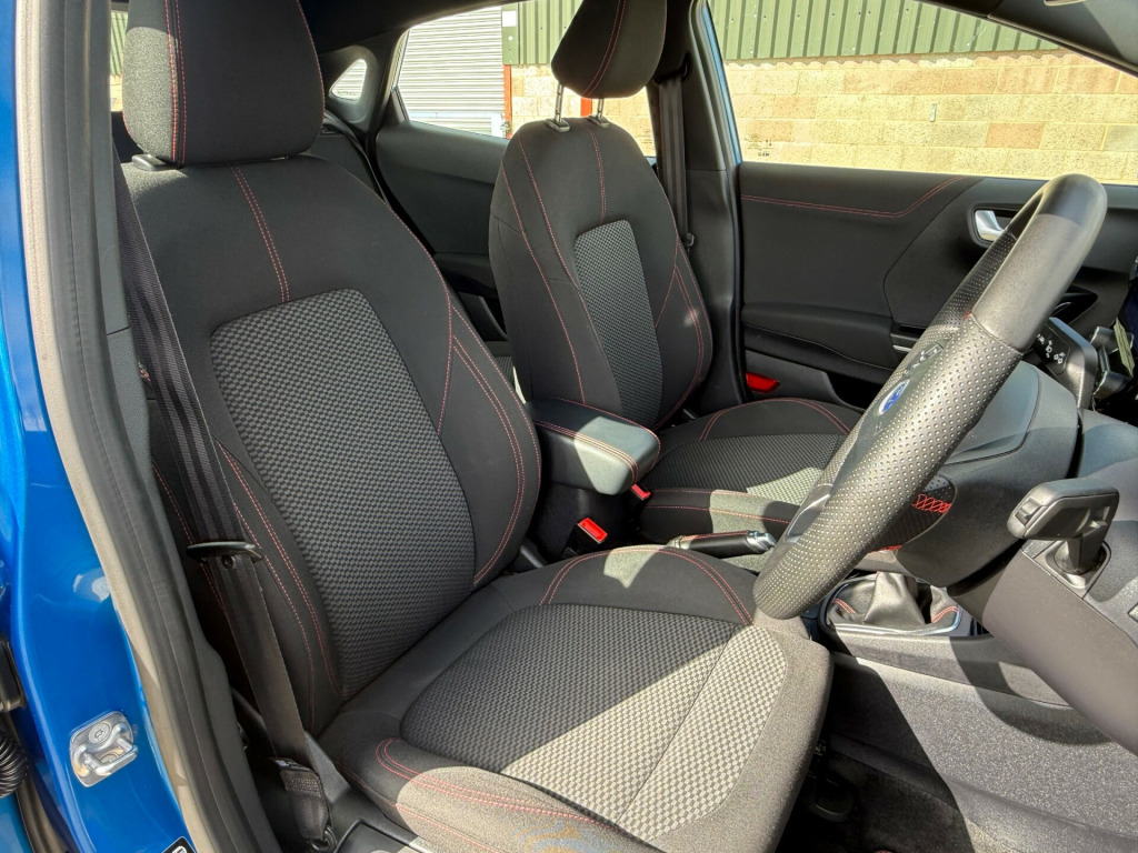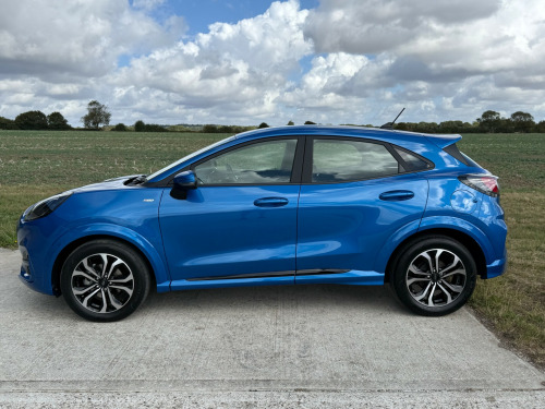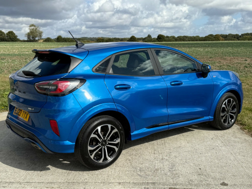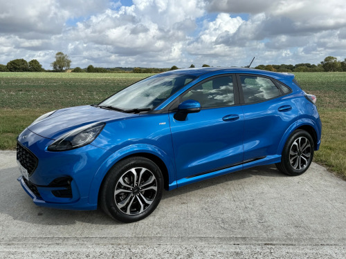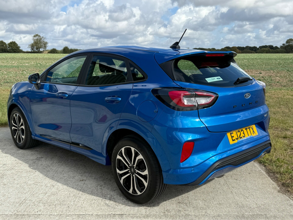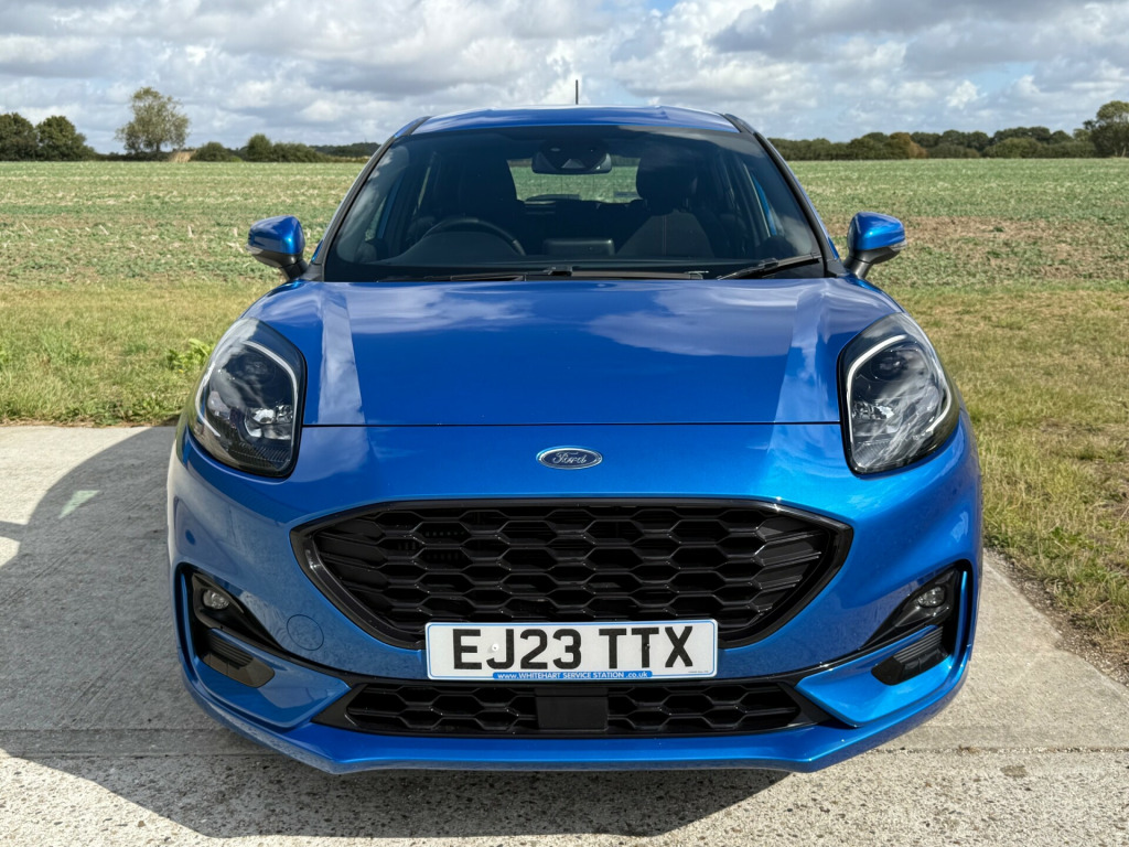 Here at Whitehart Service Statilon, we are pleased to offer this 1 private owner from new, 2023 ''73'' Ford Puma 1.0 ST-Line 5-door, finished in Metallic Blue with a Full Ford Main Dealer Service History, having covered only 23,812 miles.  The specification includes Apple CarPlay, air conditioning, alloy wheels, steering wheel controls, Bluetooth, electric windows, electric door mirrors, privacy glass, and much more. If you have any questions, please call the showroom on 01702 202202 or Stuart directly on 07814 001598. in alloy wheels - 5x2 spoke - black machined finish, acoustic laminated windscreen, active grille shutter, ecoboost hybrid tailgate badge, electric windows - front and rear, front bumper - unique st-line sport design - body colour, large rear spoiler - body colour with centre high mounted stop light, locking wheel nuts, lower bodyside moulding - body colour, power-foldable heated door mirrors with puddle lamps, puma badge, quickclear heated windscreen, rear bumper body colour - diffuser, st-line badge, st-line body styling kit, tailgate - manual, tyre inflation kit, abs - anti-lock braking system, esc - electronic stability control and hill start assist, emergency brake warning - automatic hazard warning lights, first aid kit strap, lane keeping aid with lane departure warning, post collision braking, remote central-double locking, thatcham alarm, traction control and emergency braking assistance, automatic dimming rear view mirror, centre console - premium with openable  stowage area with usb connectivity - 2 cupholders and 12v power point, courtesy lights - ambient led courtesy lighting - single colour, drivers manual 4-way seat adjustment with manual lumbar adjust, ford megabox extended bootspace, ford power starter button, front floor mats, front seats - sports style, full digital 12.3in instrument cluster, gear knob - aluminium, handbrake - black sensico trimmed with stitching, headliner - deluxe, instrument panel - high level, manual air conditioning, passengers seat - 2-way, rear seats - 2-way head restraint up-down, rear seats - second row 60-40 folding seats, restrain device pack, st-line flat-bottomed leather steering wheel with unique red stitching, soft-feel gearshift boot with red stitching, automatic headlights with rain-sensing wipers and auto high beam, front fog lights, led rear lights, projector headlamps with led daytime running lights, cruise control with intelligent speed assist, intelligent speed assistance, power steering, pre-collision assist with autonomous emergency braking and pedestrian-cyclist detection, rear parking sensors, selectable driving modes - normal - eco - sport - slippery and trail, speed limiter, sports suspension, trip-fuel computer, tyre pressure monitoring system - tpms, ford sync 3 navigation