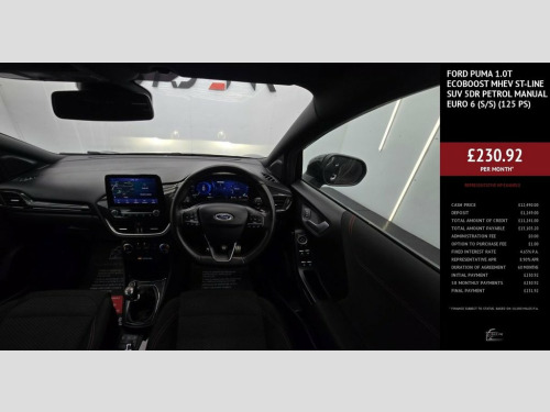 This 2021 Ford Puma 1.0T EcoBoost MHEV ST-Line SUV 5dr Petrol Manual E is currently available for £12,490 with Petrol engine and Manual gearbox. For more information or to arrange a viewing, click here to send us an email using form below.