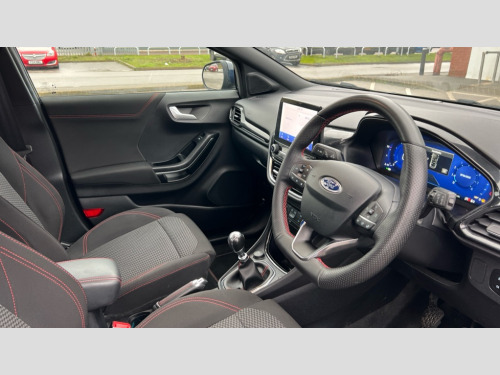 Ford Puma 1.0 EcoBoost Hybrid mHEV ST-Line 5dr Driver impairment monitor, Emergency call service, Ford easy fuel, Full digital 12.3" instrument cluster, Lane keeping aid with lane departure warning, Power assist steering, Power start button, Rear parking sensor, Selectable drive modes(Normal, Eco, Sport, Slippery and Trail), Speed sign recognition, Sport suspension, Automatic headlights with auto high beam, Automatic rain sensing wipers, LED rear lamps, Power foldable heated door mirrors with puddle lamps, Projector headlamps with LED day time running lights and front fog lamps, Quickclear heated windscreen, Rear side wing doors, Rear wiper, ST-Line body styling kit with unique grille and large body colour rear spoiler, Third brake light, 3 seat bench in 2nd row, Centre console with armrest and stowage, Ford megabox extended bootspace, Front and rear head restraints, Front floor mats, Manual 2 way passenger seat adjustment, Manual 4 way driver seat adjust with lumbar adjustment, Single front passenger seat, ST- Line cloth trim with red stitching, ST-Line flat bottomed sensico leather steering wheel with leather handbrake and aluminium gear knob, Ford SYNC 3 navigation pack - Puma, 3 rear seatbelts, Child safety lock, Electronic stability control (ESC) and hill start assist, Pedestrian/cyclist detection & post-collision braking, Pre collision assist system, Tyre pressure monitoring system (TPMS), Thatcham alarm