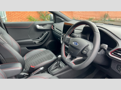 Ford Puma 1.0 EcoBoost Hybrid mHEV ST-Line X 5dr DCT Driver impairment monitor, Emergency call service, Ford easy fuel, Full digital 12.3" instrument cluster, Lane keeping aid with lane departure warning, Power assist steering, Power start button, Rear parking sensor, Selectable drive modes(Normal, sport, Eco, trail, slippery), Speed sign recognition, Sport suspension, Automatic headlights with auto high beam, Automatic rain sensing wipers, Front fog lamps, LED daytime running lights, LED rear lamps, Power foldable heated door mirrors with puddle lamps, Privacy glass to side rear windows and tailgate glass, Quickclear heated windscreen, Rear side wing doors, Rear wiper, ST-Line body styling kit with unique grille, Third brake light, 3 seat bench in 2nd row, Centre console with armrest and stowage, Ford megabox extended bootspace, Front and rear head restraints, Front floor mats, Manual 4 way driver seat adjust with lumbar adjustment, Manual 4 way passenger seat with lumbar seat adjustment, Sensico partial premium upholstery, Single front passenger seat, ST-Line flat bottomed sensico leather steering wheel with leather handbrake and aluminium gear knob, Wireless charging pad with electronic air temperature control (EATC), B&O Premium Audio system + Ford SYNC 3 navigation pack - Puma, 3 rear seatbelts, Child safety lock, Electronic stability control (ESC) and hill start assist, Pedestrian/cyclist detection & post-collision braking, Pre collision assist system, Tyre pressure monitoring system (TPMS), Thatcham alarm, Carbon look interior deco spears