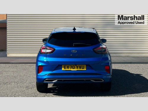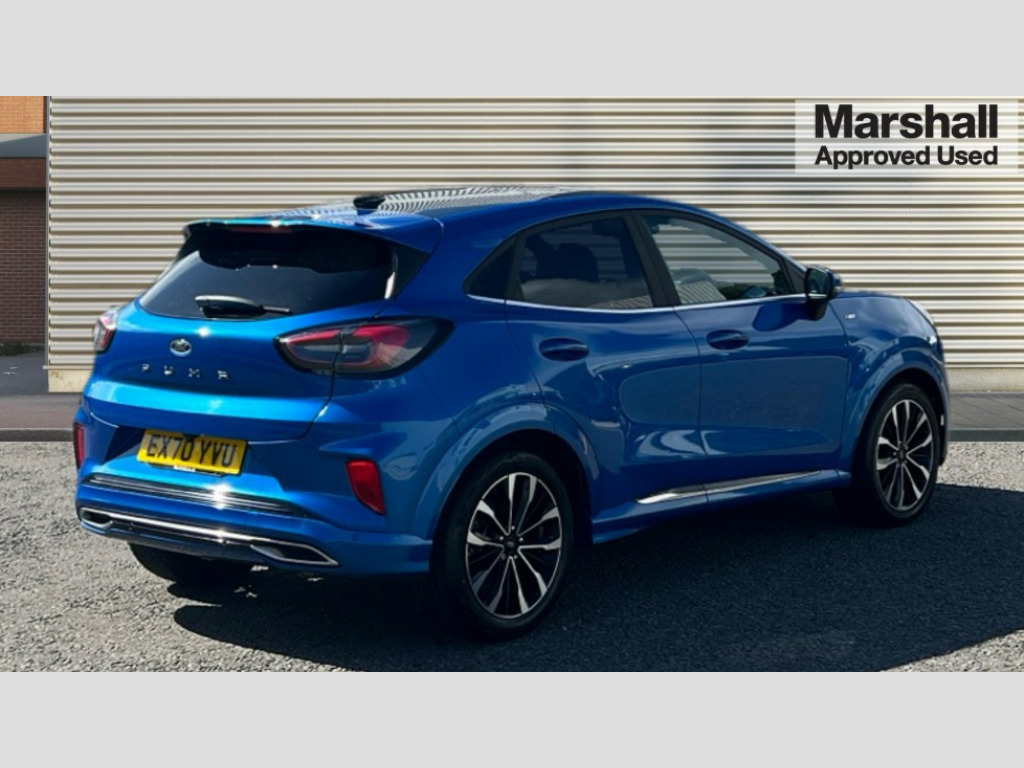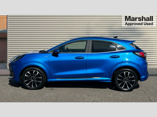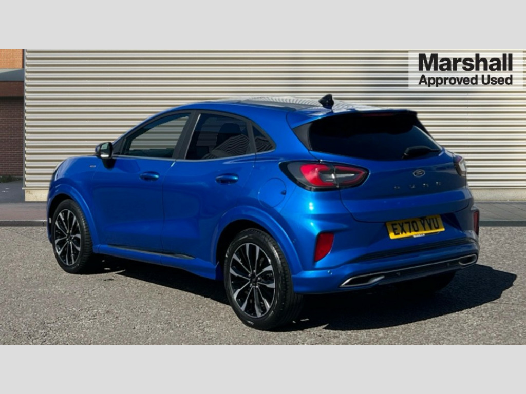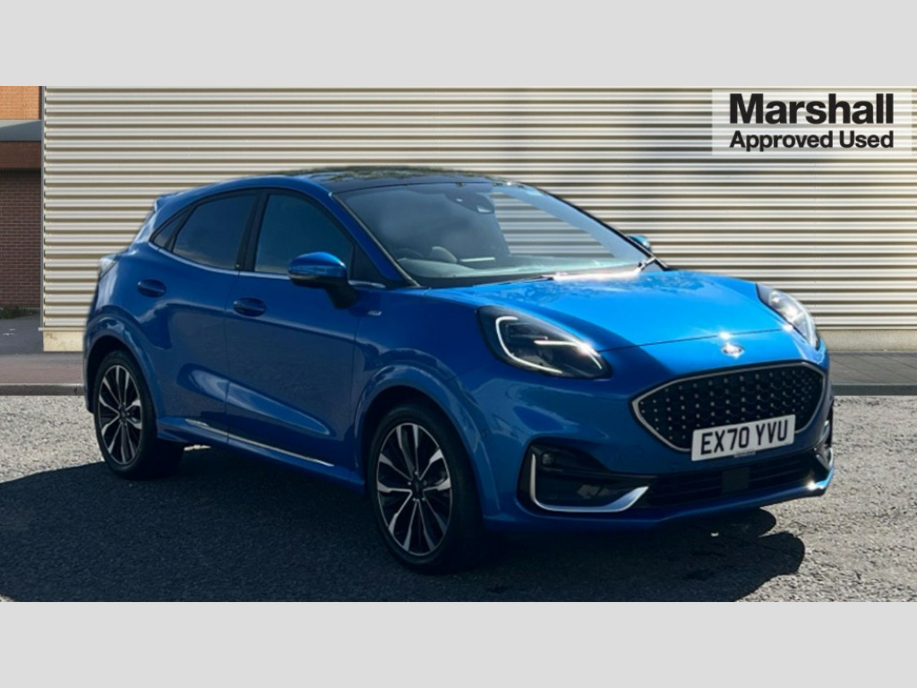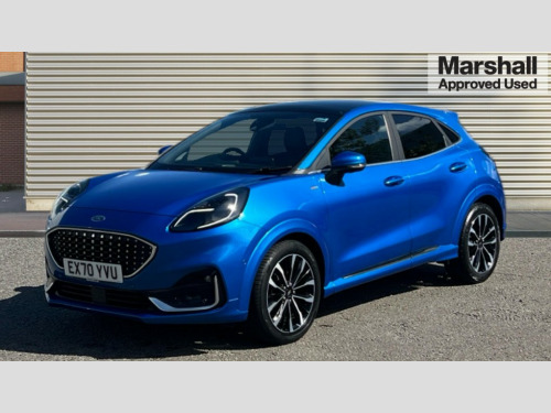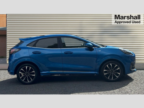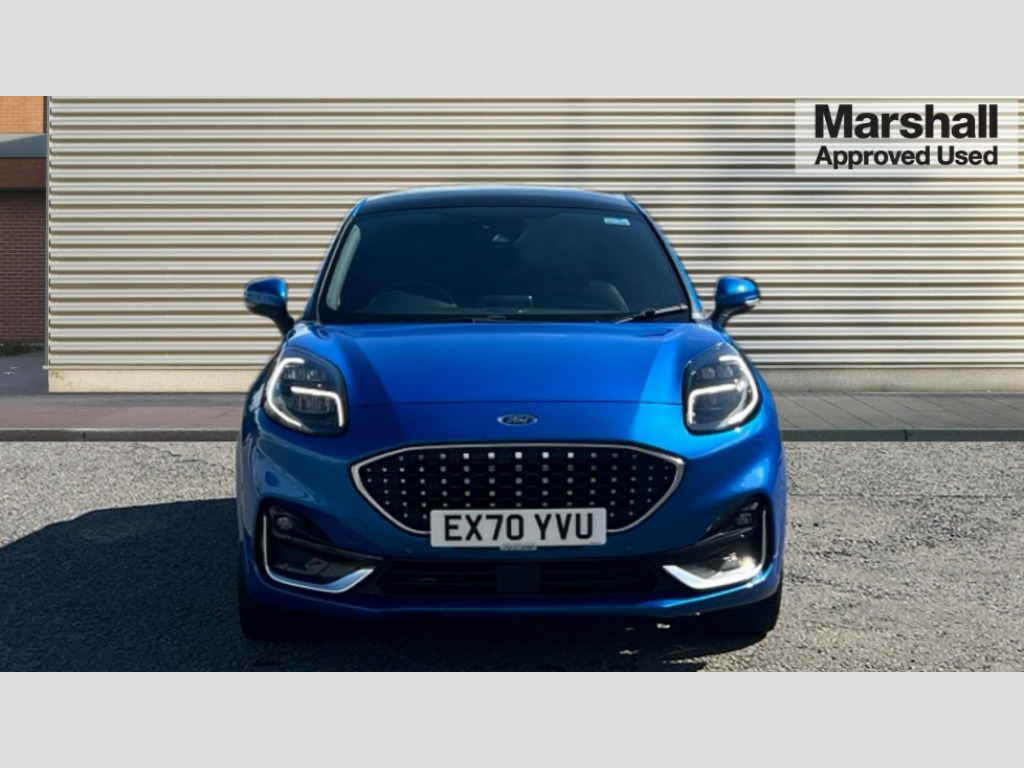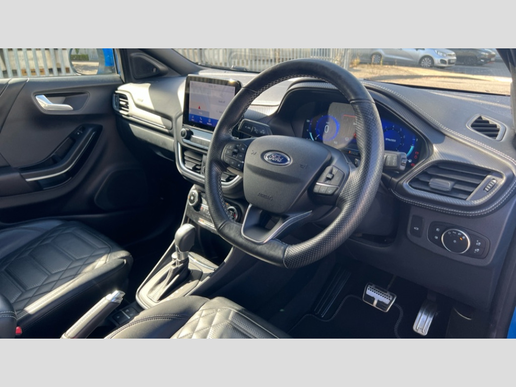 Ford Puma 1.0 EcoBoost ST-Line X Vignale 5dr Auto Ford easy fuel, Full digital 12.3" instrument cluster, Lane keeping aid with lane departure warning, Power assist steering, Rear parking sensor, Selectable drive modes(Normal, sport, Eco, trail, slippery), Wireless charging pad, Automatic headlights with rain sensing wipers and auto high beam, Body coloured door mirrors, Bodyside chrome styling, Fixed LED headlamps, Front fog lights with cornering lights and LED rear lamps, Gloss black with chrome elements on front and rear bumpers, High chrome waistline, LED daytime running lights, Power foldable heated door mirrors with puddle lamps, Privacy glass to side rear windows and tailgate glass, Quickclear heated windscreen, Rear wiper, Satin aluminium accents to front grille, waistline and bodyside, ST-Line body kit with large rear spoiler wth sports suspension, Unique Vignale style upper grille and surround, Centre console with armrest and stowage, Driver and passenger seat lumbar and height adjust, Ford megabox extended bootspace, Front and rear floor mats, Front and rear head restraints, Manual air conditioning, Perforated leather flat bottomed steering wheel, handbrake with metal grey stitching, Premium sensico wrapped instrument cluster, Windsor premium leather upholstery, B&O Premium Audio system + Ford SYNC 3 navigation pack - Puma, Comfort pack - Puma, 3 rear seatbelts, Electronic stability control (ESC) and hill start assist, Pre-collision assist with autonomous emergency braking, pedestrian/cyclist detection & post-collision braking, Tyre pressure monitoring system (TPMS), Thatcham alarm, Carbon look interior deco spears, Tyre inflation kit