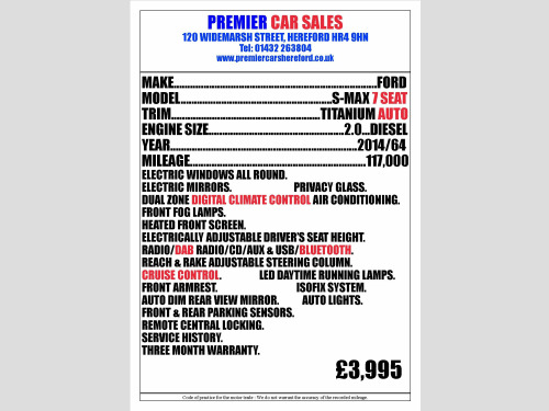 A large family automatic seven seater, with excellent features and a good service history. Remote Central Locking with two keys. Alloy Wheels. Front & Rear Parking Sensors. Privacy Glass. LED Daytime Running Lamps. Front Fog Lamps. Electric Windows all round. Electric Mirrors. Front Armrest. Electrically Adjustable Seat Height to Drivers Seat. Cruise Control with speed limiter facility. Dual Zone Digital Climate Control Air Conditioning. Auto Lights. Auto Dim Rear View Mirror. Reach & Rake Adjustable Steering Column. Individual slide and recline rear seating. Quick Clear Heated Windscreen. Radio/DAB Radio/CD/ AUX & USB Inputs/Bluetooth Connection. ISOFIX System. We are at 120 Widemarsh Street, Hereford, HR4 9HN. Our website with full details is : www.premiercarshereford.co.uk, All of our vehicles are supplied with a three month warranty and long MOT. Card payments are welcomed and part exchanges are gladly considered. Low rate finance arranged, subject to status. Please call us on 01432263804 or 07831564655 for more information.