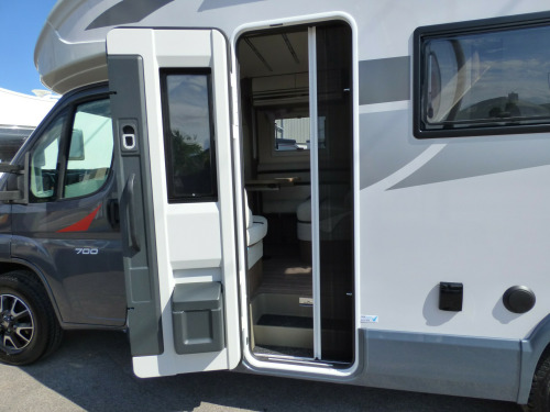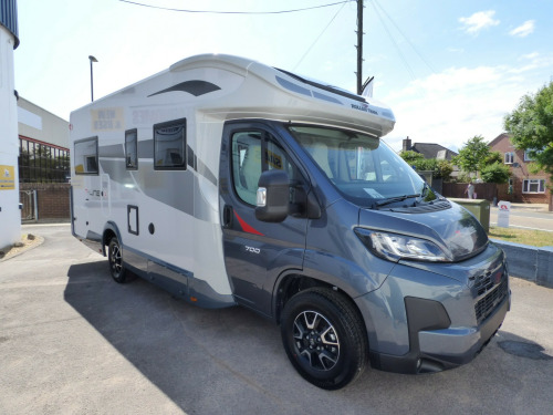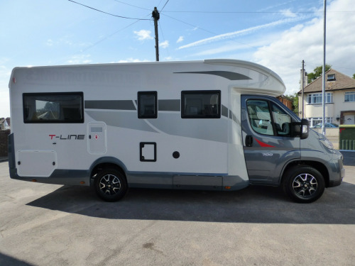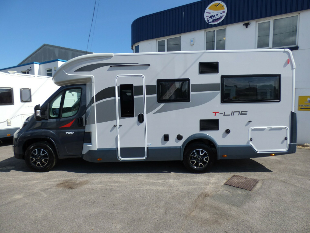 Special Offer - Free Prestige Pack - Includes Fiamma F45S Awning, Scorpion Defender S7 Alarm & Tracker, 22'' Falcon Smart TV, 11kg Gaslow refillable LPG system and starter pack, together worth up to £3,100!Brand new 2025 specification T-Line 700 model based on the Fiat Ducato chassis with 140bhp engine and 6 speed Manual transmission in stock now. Clever design provides two electric elevating beds, one above the front dinette and the other above the U shaped rear lounge providing a generous living area for a sub 7m motorhome. The mid kitchen is fitted with a fridge/freezer, 3 burner gas hob, gas oven and grill and a sink area. Opposite is the bathroom which is a wet room style containing shower cubicle, cassette type toilet and wash hand basin. Heating and hot water are provided by a Truma dual fuel boiler and other features on this T-Line 700 include: 4 bike rack, twin reversing cameras, 200w solar panel, Pioneer Sat Nav, WiFi, External Gas BBQ and shower points, ample cupboard space and pleated cab blinds. L.6.99m, W. 2.35m, H 2.96m, 3,500kg, 4 berth, 4 seatbelts, delivery mileage. 0w solar panel with mppt controller, 4g wifi, alloy wheels, carpets, external gas bbq point, external shower point, pioneer sat nav/infotainment system, pleated cab blinds, reversing camera, thule 4 bike rack, free prestige pack worth £3,100!, 16'' Alloys