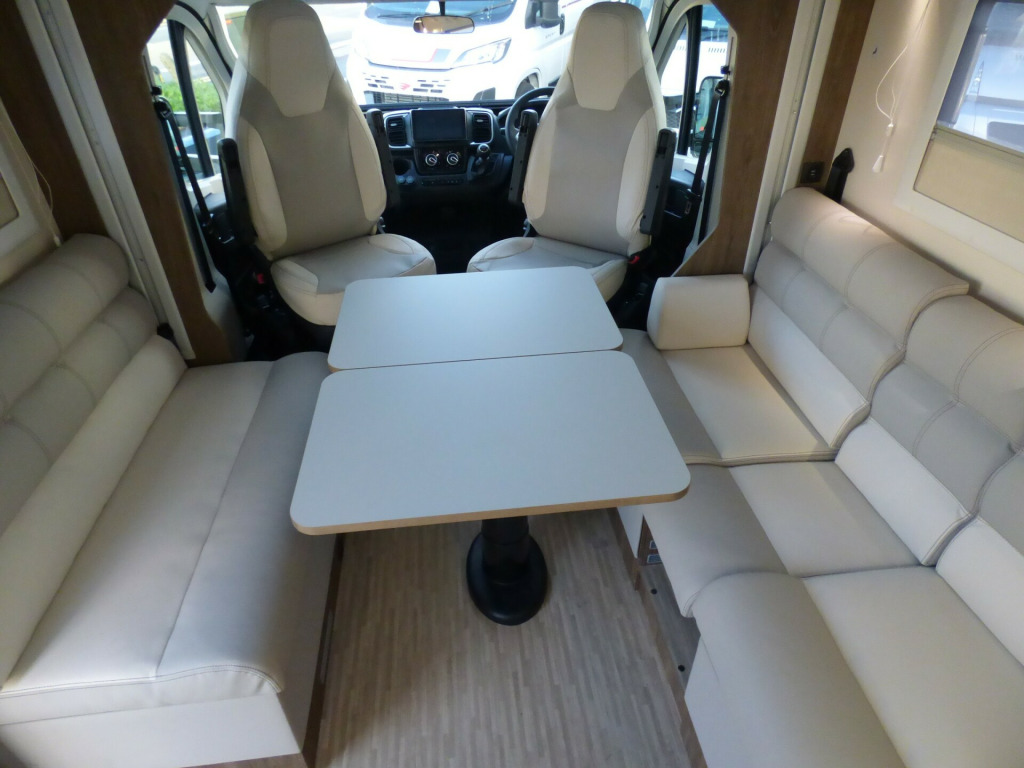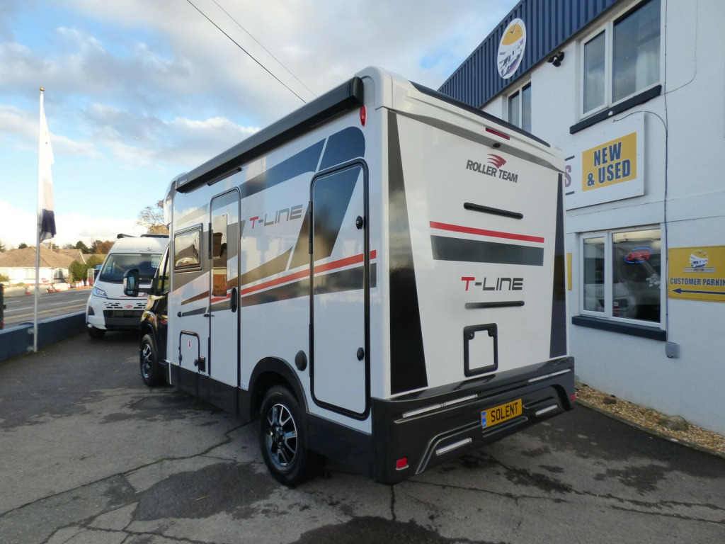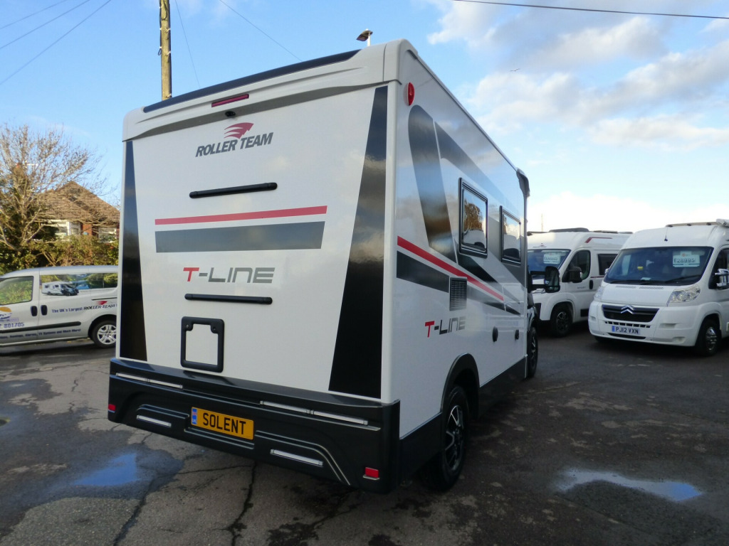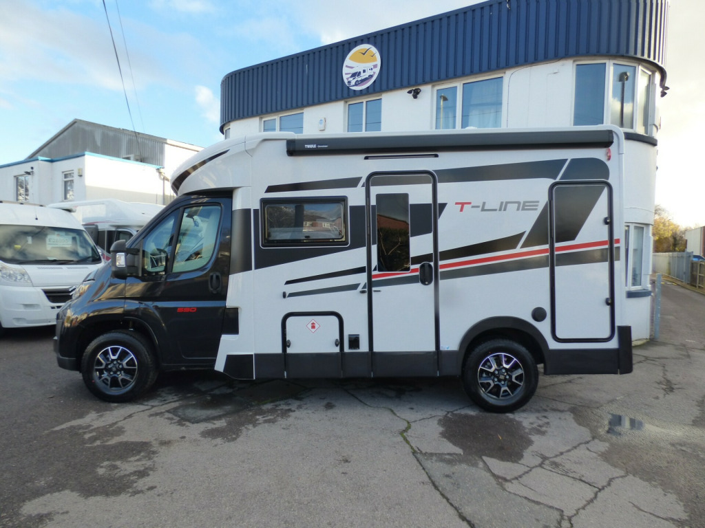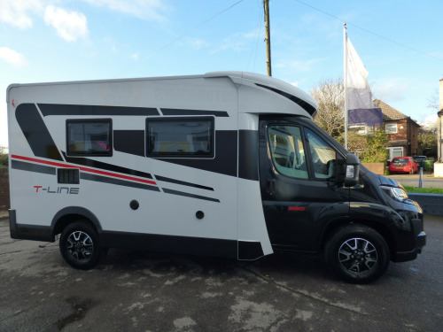 Brand New 2026 Model T-Line 590 140bhp automatic in stock now. A Fantastic new layout to the T-Line range, the new 590 model provides new lounge set up and a host of new features but maintains the price point from the 2025 model. The lounge area is laid out as two opposing sofas with the front seats swivelling to accommodate 6 with ease. The large elevating bed over simply drops down for evening use. The central kitchen is fitted with a gas hob, gas oven/grill and a new compressor fridge/freezer. The rear bathroom has a separate shower cubicle, cassette type toilet and a wash hand basin along with access to the rear storage area. Heating and hot water is via a Truma dual fuel system and other features for this T-Line 590 include: Alloy Wheels, Pioneer infotainment system, Twin 200w solar panels with MPPT controllers, Twin leisure batteries, Fiamma bike rack, Thule wind out awning, External BBQ and Shower points, WiFi, pleated cab blinds, carpets and ISOfix child seat fixings. 4 berth, 4 seat belts, L. 5.99m, W. 2.35m, H. 2.95m, 3,500kg, delivery miles. wifi, alloy wheels, automatic transmission, cab a/c, carpets, iso fix child seat fixings, microwave, pioneer sat nav/infotainment system, pleated cab blinds, reversing camera, thule 4 bike rack, thule awning, tv bracket, twin 200w solar panels with twin mppt controllers, twin leisure batteries, 16'' Alloys