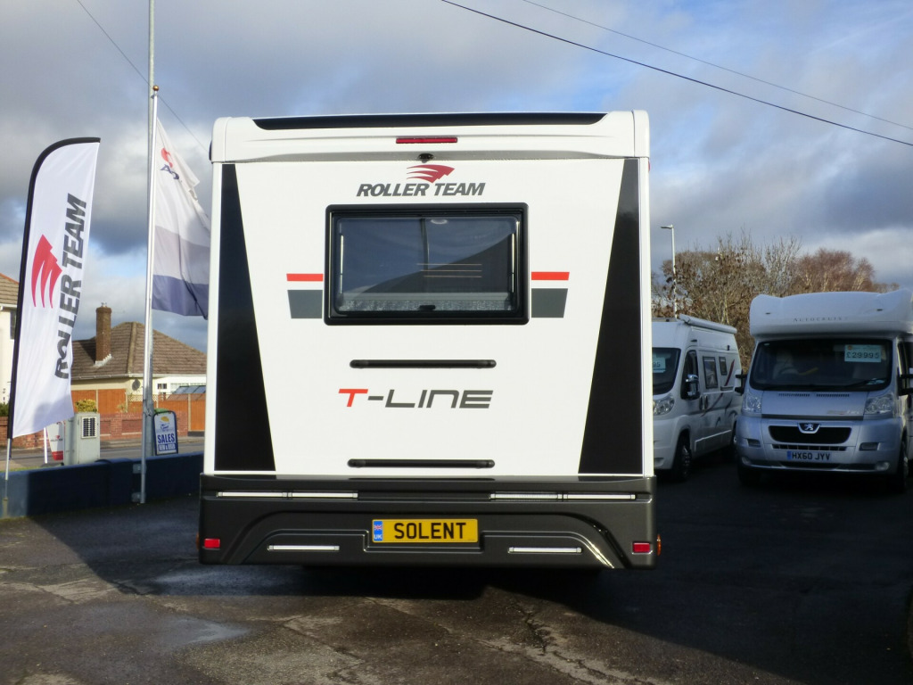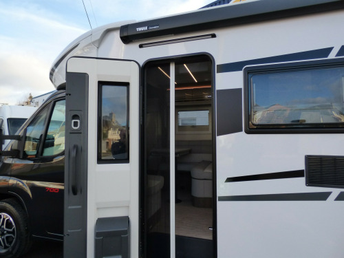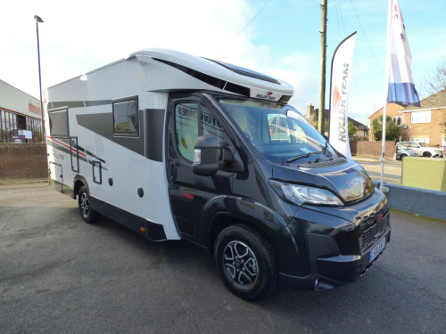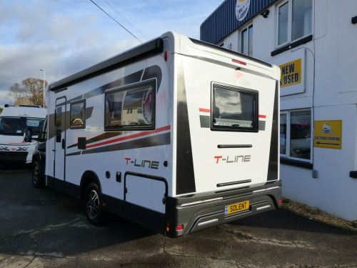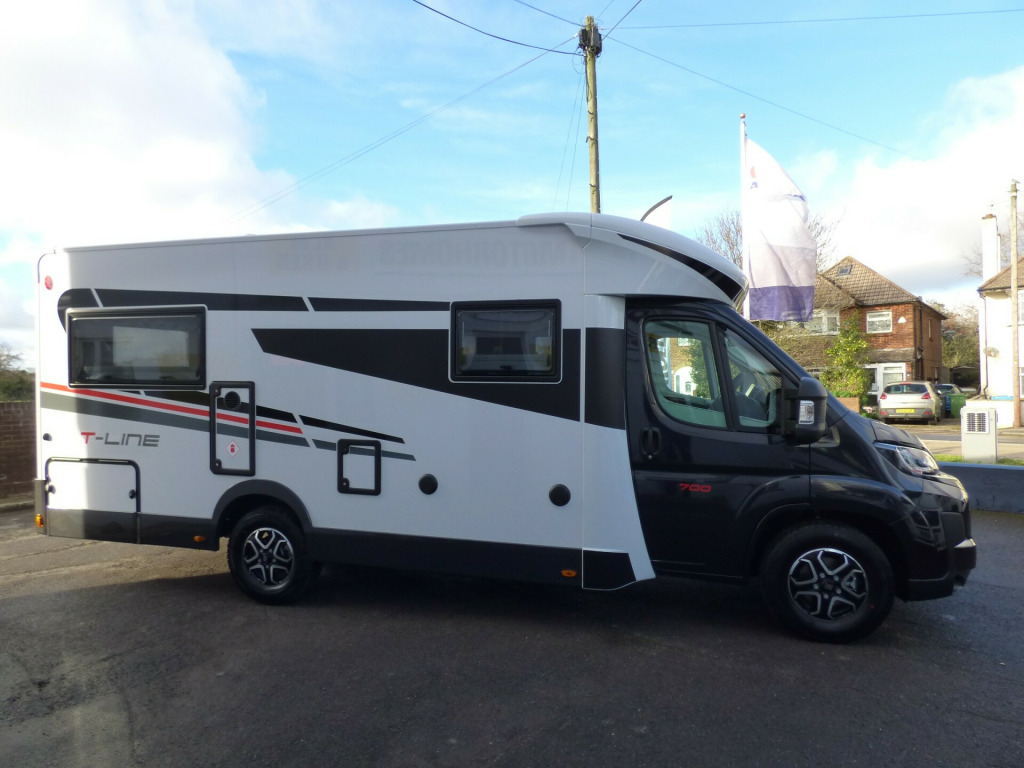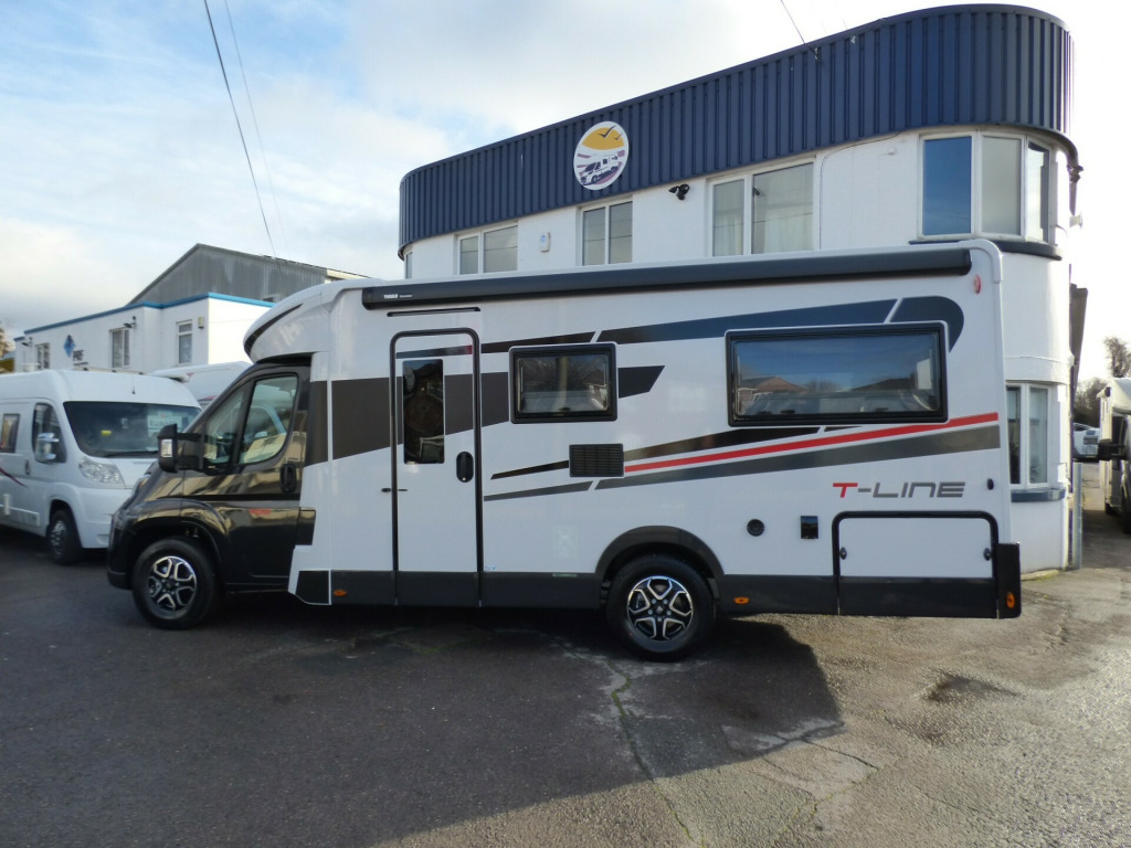 New 2026 Model T-Line 700 in stock now! This revised T-Line model is based on the Fiat Ducato chassis with 140bhp engine and 6 speed manual transmission. Clever design provides two electric elevating beds, one above the front dinette and the other above the U shaped rear lounge providing a generous living area for a sub 7m motorhome. The mid kitchen is fitted with a compressor fridge/freezer, 3 burner gas hob, gas oven and grill and a sink area. Opposite is the bathroom which is a wet room style containing shower cubicle, cassette type toilet and wash hand basin. Heating and hot water are provided by a Truma dual fuel boiler and other features on this T-Line 700 include: Thule wind out awning, Thule 4 bike rack, twin reversing cameras, Twin 200w solar panel with twin lithium leisure batteries, Pioneer Sat Nav, WiFi, External Gas BBQ and shower points, ample cupboard space and pleated cab blinds. L. 6.99m, W. 2.35m, H 2.96m, 3,500kg, 4 berth, 4 seatbelts, delivery miles. wifi, alloy wheels, cab a/c, carpets, external gas bbq point, external shower point, iso fix child seat fixings, pioneer sat nav/infotainment system, pleated cab blinds, reversing camera, thule 4 bike rack, thule awning, twin 200w solar panels with twin mppt controllers, 16'' Alloys