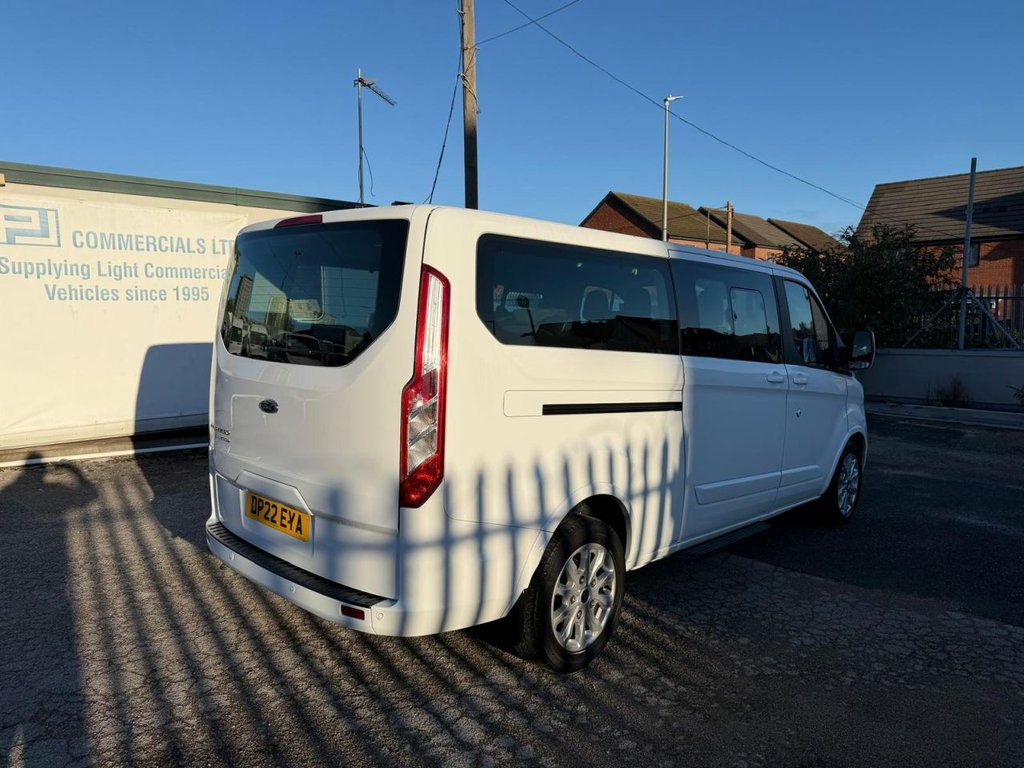 FORD TRANSIT CUSTOM 2.0 310 ECOBLUE TITANIUM MINIBUS LWB, 2022 22 REG, Factory White, electric windows, electric folding mirrors, air conditioning, DAB digital radio, Bluetooth telephone/ media, multifunctional steering wheel, cruise control, park assist, 71968 miles, MOT, 1 Company Owner. All our vehicles are fully serviced prior to collection, for more information please visit www.pjcommercial.com 17in Alloy Wheels, 2 Fob Keys, Airbag - Drivers, Airbag - Front Passengers, Airbag - Front Side and Curtain Airbags, Anti-Lock Braking System - ABS - with El, B Pillar Assist Handle, Battery - Cold Start -20 Degree C, Body Colour Door and Tailgate Handles, Body Coloured Exterior Mirror Finish, Bodyside Mouldings - Body Colour, Bottle Holder - Twin 2 litre Bottle Capa, Bumpers - Front and Rear Body Colour, Colour Keyed Exterior Pack, Complete Carpet Inside Floor Covering, Courtesy Light - Footwell Illumination -, Courtesy Light - Header-Mounted - Front , Courtesy Light - Rear Seat with Theatre , Door Mirrors - Blind Spot Eliminator and, Door Mirrors - Power-Foldable - Electric, Doors - Driver