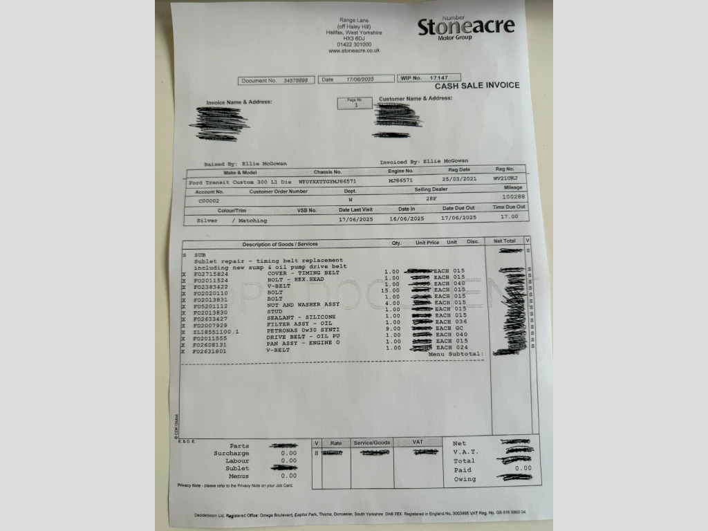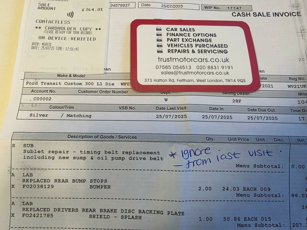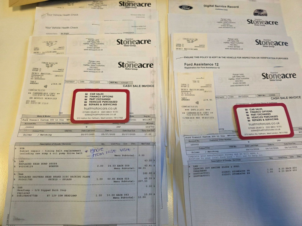 New Timing belt, Sump and oil pump drive belt all replaced 17/6/2025 at 100K miles (confirmed with the garage), 2021 model with full service history (plenty of prints/invoices), 2-previous owners, fresh new oil and filters service just done. We are delighted to present to you this wonderful vehicle, newly arrived in our stock. This example has previously been owned by a large organisation that have regularly maintained the vehicle, visible from its internal and external condition. Internal and external condition of the vehicle are very good for the age and mileage; you can judge for yourself just by looking at the images and the video (more, larger images available on our website TRUSTMOTORCARS CO UK) or hopefully if you visit us very soon. Please do get in touch with us should you wish to arrange a viewing or if you would like to have it delivered to your door. More images of this vehicle and many more are on our website so please feel free to visit us there; thank you. Part Exchange Welcome. -THREE MONTHS WARRANTY, -GUARANTEED MOT: WE WILL HAVE A NEW MOT DONE FOR YOU IF THE MOT RUNS OUT SOON, -AFFORDABLE FINANCE OPTIONS AVAILABLE - PLEASE GET IN TOUCH WITH US FOR MORE DETAILS, -OPTIONAL EXTENDED AA WARRANTY COVER, -MORE PHOTOS AND VIDEOS OF THIS VEHICLE AND MANY OTHERS ON OUR WEBSITE: TRUSTMOTORCARS CO UK, -PART EXCHANGE WELCOME., -WE ARE BASED NEXT TO HEATHROW AIRPORT, MINUTES TO M25 J14, M4, M40, M3 and A312, -NATIONWIDE DELIVERY AVAILABLE. in alloy wheels, 2nd remote key fob, 8 way adjustable drivers seat with armrest, abs - anti-lock braking system, airbag - front passenger, auto headlamps and rain sensitive wipers, body colour front bumper and mirror housing, body colour rear bumper, bodyside mouldings - body colour, bulkhead - full steel with load through hatch, complete rear trim board - half height, cruise control, din-iso compliant metal bulkhead with load through hatch, door handles - body colour, drivers airbag, drivers seat lumbar adjust, easy clean load floor, electric windows - front, front manual air conditioning, front passenger airbag with deactivation switch, halogen projector headlights with led daytime running lights and adaptive cornering front fog lights, heated driver and passenger seats, ice pack 21 - sync3 audio, led load compartment light, light tinted glass - ilo privacy glass, load compartment - protection kit, lockable glovebox, map reading lights, parking aid - front and rear with front fog lamps, passenger side sliding load door with track cover, power assisted steering, power foldable and heated mirrors, quickclear heated windscreen, rsc - roll stability control, remote central door locking with deadlocks, seat pack 25, seats - dual passenger with underseat stowage, selectable drive mode, side wind mitigation, spare wheel - conventional, steering wheel - leather-trimmed, thatcham category 1 alarm, trip computer, two 12v power socket, vehicle maintenance monitor