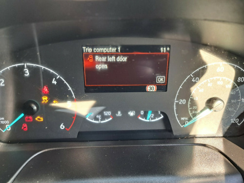 in steel wheels with full wheel covers, body colour front bumper and mirror housing, electric windows - front, light tinted glass - ilo privacy glass, power foldable and heated mirrors, quickclear heated windscreen, spare wheel - conventional, 2nd remote key fob, abs - anti-lock braking system, drivers airbag, rsc - roll stability control, remote central door locking with deadlocks, side wind mitigation, 8 way adjustable drivers seat with armrest, bulkhead - full steel with load through hatch, complete rear trim board - half height, din-iso compliant metal bulkhead with load through hatch, doors - unglazed rear, drivers seat lumbar adjust, easy clean load floor, lockable glovebox, map reading lights, passenger side sliding load door with track cover, seat pack 13, seats - dual passenger with underseat stowage, steering wheel - leather-trimmed, vehicle maintenance monitor, auto headlamps and rain sensitive wipers, halogen projector headlights with led daytime running lights and adaptive cornering front fog lights, cruise control, parking aid - front and rear with front fog lamps, power assisted steering, selectable drive mode, trip computer, ice pack 21 - sync3 audio, two 12v power socket, roof rack
