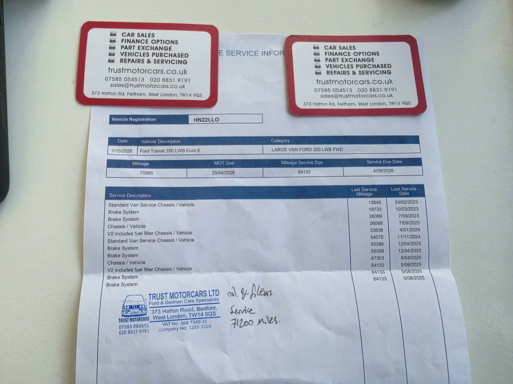 2022 model, ONE OWNER From New, full service history (13 maintenance records present), fresh new oil and filters service just done, lots of upgrades and functions such as front and rear parking sensors, tow-bar, amongst others features. We are delighted to present to you this wonderful vehicle, newly arrived in our stock. This example has previously been owned by a large organisation that have regularly maintained the vehicle, visible from its internal and external condition. Internal and external condition of the vehicle are very good for the age and mileage; you can judge for yourself just by looking at the images and the video (more, larger images available on our website TRUSTMOTORCARS CO UK) or hopefully if you visit us very soon. Please do get in touch with us should you wish to arrange a viewing or if you would like to have it delivered to your door. More images of this vehicle and many more are on our website so please feel free to visit us there; thank you. Part Exchange Welcome. -THREE MONTHS WARRANTY, -GUARANTEED MOT: WE WILL HAVE A NEW MOT DONE FOR YOU IF THE MOT RUNS OUT SOON, -AFFORDABLE FINANCE OPTIONS AVAILABLE - PLEASE GET IN TOUCH WITH US FOR MORE DETAILS, -OPTIONAL EXTENDED AA WARRANTY COVER, -MORE PHOTOS AND VIDEOS OF THIS VEHICLE AND MANY OTHERS ON OUR WEBSITE: TRUSTMOTORCARS CO UK, -PART EXCHANGE WELCOME., -WE ARE BASED NEXT TO HEATHROW AIRPORT, MINUTES TO M25 J14, M4, M40, M3 and A312, -NATIONWIDE DELIVERY AVAILABLE. nual air conditioning, 230v 3-pin power point converter, polymer moulded glazed bulkhead, polymer moulded bulkhead, svo seat pack 3, 16in steel wheels, airbags - driver, anti-lock braking system - abs with electronic brake force distribution - ebd, assist handle - located on b-pillar, battery - cold start -20 degree c, bluetooth, bodyside mouldings - wide - self colour, bottle holder - twin 2 litre bottle capacity - facia-mounted, bulkhead - full steel, cargo door handle - self colour, courtesy lights - header-mounted front with theatre dimming, curve control, door handles - self coloured, door mirrors - blind spot eliminator and integrated side indicator, door mirrors - manual, doors - unglazed rear doors - hinged for 180 degree opening - positive stop at 90 degree, dual-circuit front and rear discs with self-adjusting servo-assistance and abs, eba - emergency brake assist, epas - electric power assisted steering, esc - electronic stability control, electric windows - front, emergency brake warning, floor covering - cab easy-clean rubber, fold out front passenger seat table, ford easy-fuel capless refuelling system, ford sync with 4.2in tft screen, front - independent macpherson struts - coil springs - stabiliser bar and gas-pressurised shock absorbers - rear - leaf springs and gas-pressurised shock absorbers, front bumper - self colour, front grille - self colour, front passengers seat - dual fixed with split lift up cushion for stowage and fold out table, gearshift indicator light, glovebox - with lid and a4 file storage capability, headlights - halogen projector containing daytime running lights, headlights - levelling control, headlights courtesy delay - 30 seconds duration, headlining - cab - moulded, heater - positive thermal coefficient - ptc, heavy duty alternator, hill start assist, ice pack 17, immobiliser - safeguard passive anti-theft system - pats - insurance-approved category 2 immobiliser, lac - load adaptive control, less easy clean floor, less steel spare wheel, loadspace compartment light, locks - audio mislock feedback - audible signal if a door is ajar when locking activated, locks - auto locking on drive-away - doors automatically lock at 8 kmh or 5 mph, locks - auto relocking - doors relock after 45 seconds if no door is opened, locks - configurable unlocking - 2-stage unlocking, locks - key operated bonnet release, locks - power door deadlocks - shielded with strengthened mountings, mudflaps - rear, mykey, overhead storage console, passenger side sliding load door - solid, power point - 2 x 12v located on instrument panel and in stowage bin, rsc - roll stability control, radio with remote stalks, rear bumper - self colour with integrated step, remote central door locking with deadlocks, remote central locking with one key fob, seatbelts - 3 point diagonal inertia reel - all seats, seats - drivers 4-way adjustment with armrest, selectable drive mode, side wind mitigation, steering column - rake and reach adjustment, steering wheel - 4 spoke polyurethane, storage - front door map pockets, storage - underseat stowage compartment under dual passenger seat, tinted glass, trip computer, tyre inflator kit, vehicle identification number - vin - visible, vehicle maintenance monitor, water in fuel filter with sensor, wheel covers - half caps, wipers - front variable-intermittent with electric wash