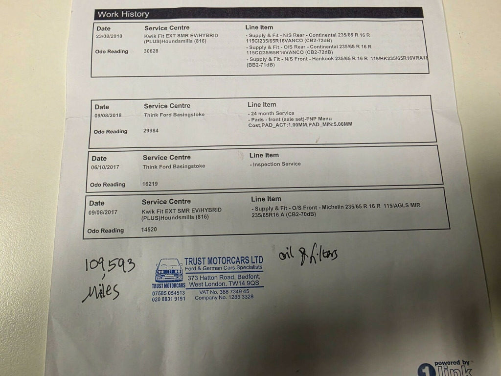 No VAT! Lovely clean example Transit van with high roof, ladder, roof racks, pre-installed wooden internal racks (removable) and parking sensors; Fresh Service Just done (oil and filters changed), Full service history (five service/maintenance record sheet present) and two previous owners. We are delighted to be presenting to you this wonderful van that has just come in. Internal and external condition of the vehicle are very good for the age and mileage; you can judge for yourself just by looking at the images and the video (more, larger images available on our website TRUSTMOTORCARS CO UK) or hopefully if you visit us very soon. Please do get in touch with us should you wish to arrange a viewing or if you would like to have it delivered to your door. More images of this vehicle and many more are on our website so please feel free to visit us there; thank you. Part Exchange Welcome. -THREE MONTHS WARRANTY, -GUARANTEED MOT: WE WILL HAVE A NEW MOT DONE FOR YOU IF THE MOT RUNS OUT SOON, -AFFORDABLE FINANCE OPTIONS AVAILABLE - PLEASE GET IN TOUCH WITH US FOR MORE DETAILS, -OPTIONAL EXTENDED AA WARRANTY COVER, -MORE PHOTOS AND VIDEOS OF THIS VEHICLE AND MANY OTHERS ON OUR WEBSITE: TRUSTMOTORCARS CO UK, -PART EXCHANGE WELCOME., -WE ARE BASED NEXT TO HEATHROW AIRPORT, MINUTES TO M25 J14, M4, M40, M3 and A312, -NATIONWIDE DELIVERY AVAILABLE. in steel wheels, 8-way driver seat with fore-aft - recline -height and tilt, abs - anti-lock braking system, airbags - driver, armrest - drivers, b pillar assist handle, bluetooth hands-free phone, bottle holder - 2x facia-mounted, bulkhead - full steel, bumper - front body colour - partial, cab floor covering - rubber, courtesy light - overhead with theatre-style dimming, curve control, daytime running lamps, dead-lock, door handles - self coloured, door mirrors - manual adjust, doors - passengers sliding side load door and step, driver seat belt minder, eba - emergency brake assist, edcc - electronic dynamic cornering control, esp - electronic stability programme, electric windows - front, emergency brake warning, ford connected audio system, ford easy-fuel capless refuelling system, ford eco mode - driver information system, front seats - seat back tray tables, gearshift indicator light, glovebox with a4 file storage, headlining - cab - moulded, hill start assist, immobiliser - safeguard passive anti-theft system - pats - insurance-approved category 2 immobiliser, lac - load adaptive control, less easy clean floor, less spare wheel, load compartment - tie down loops x8, loadspace compartment light, locks - audio mis-lock feedback, locks - configurable unlocking, locks - key operated bonnet release, mud flaps - rear, overhead storage shelf, power steering, rom - roll over mitigation, rear step - integrated in bumper, recirculation heater - front, remote central locking, seats - dual passenger, side wind mitigation, standard duty alternator - 150amp, steering column - rake and reach adjustment, steering wheel - 4 spoke pu, storage - drivers side - storage compartment on facia top with lift up lid, storage - front door map pockets, stowage box - front passenger underseat area, tvc - torque vectoring control, traction control - tc, trip computer, two 12v power socket, wheel covers - half caps, wide bodyside mouldings, wipers - front variable intermittent